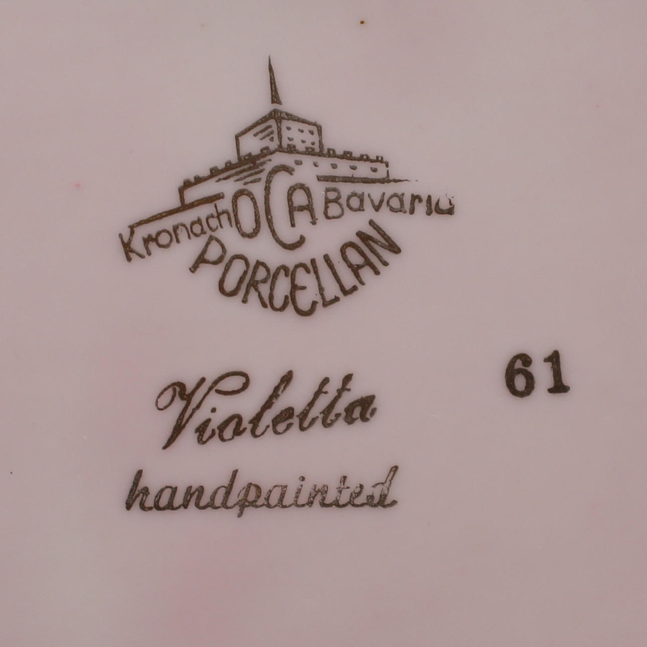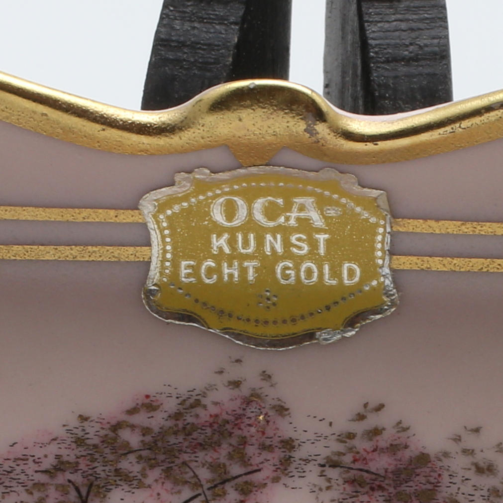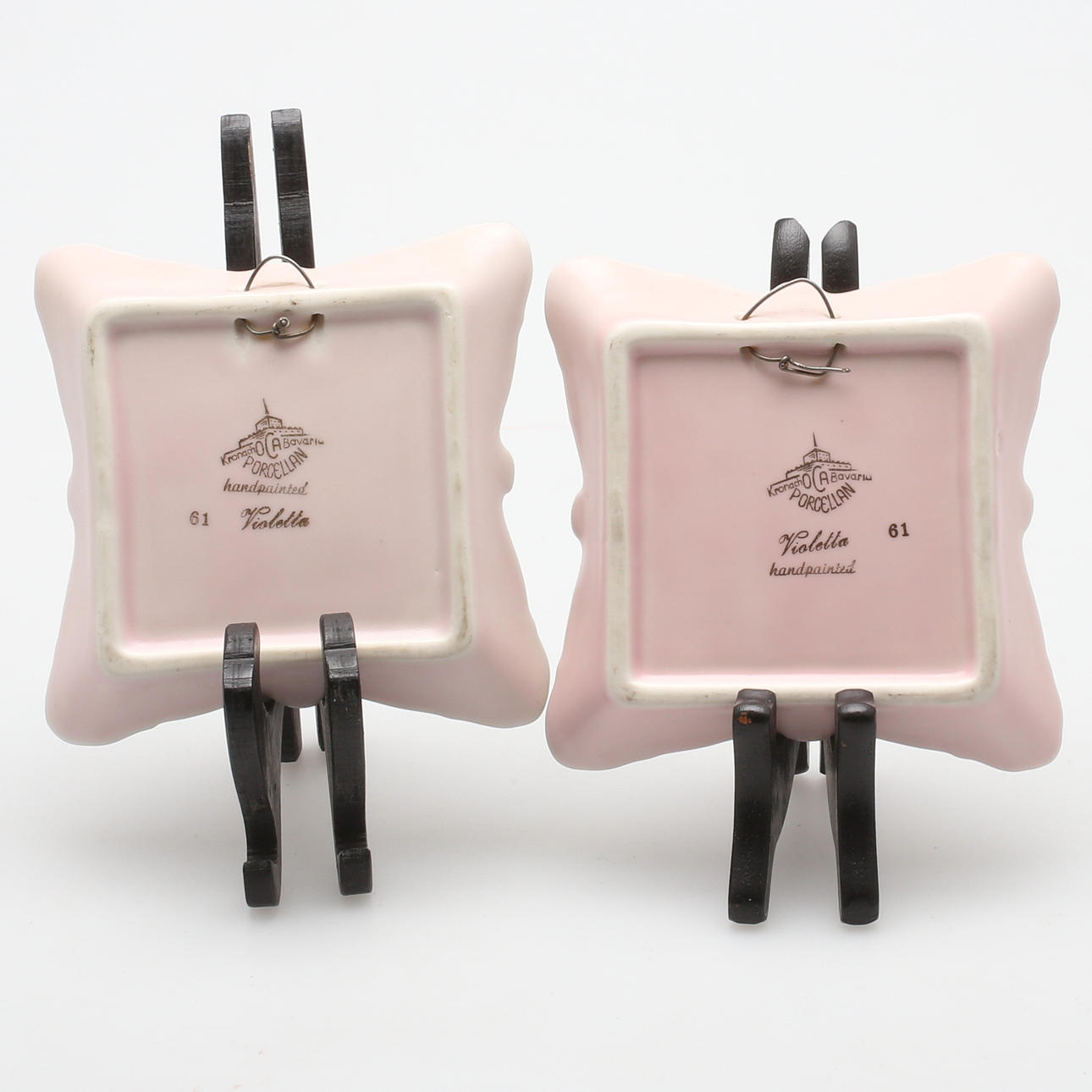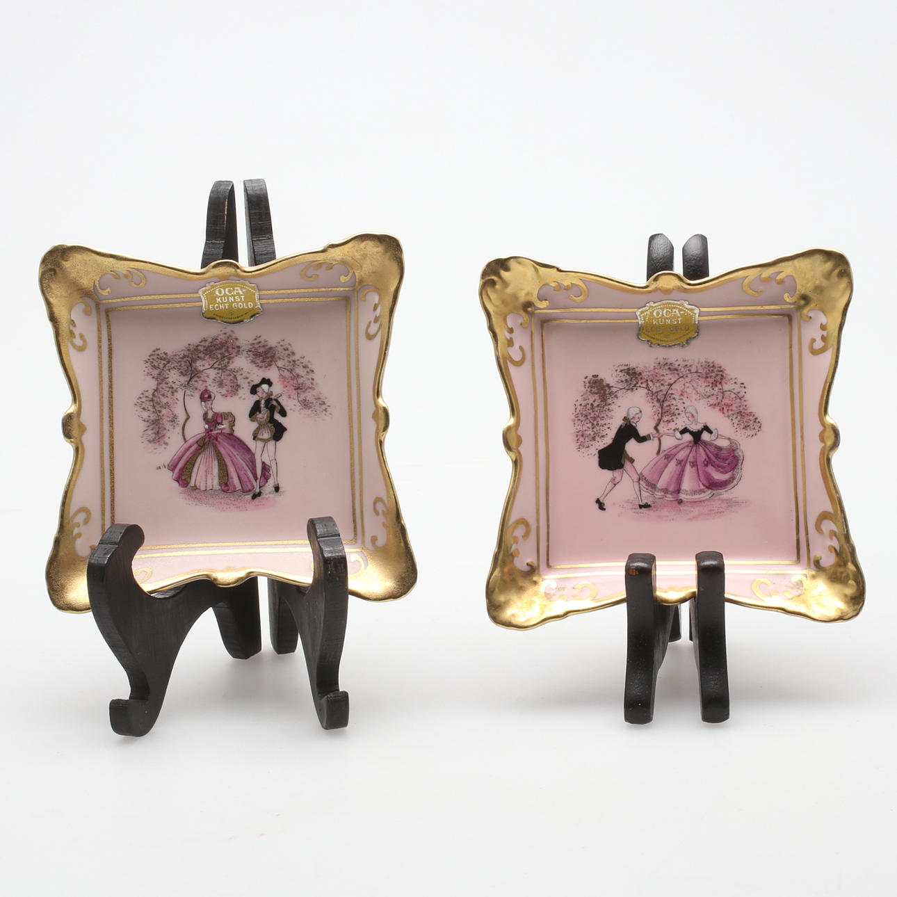 2 dishes, Kronach OCA Bavaria Porcelain Violetta handpainted, marked OCA-Kunst echt gold on the top, 11 x 11 cm.