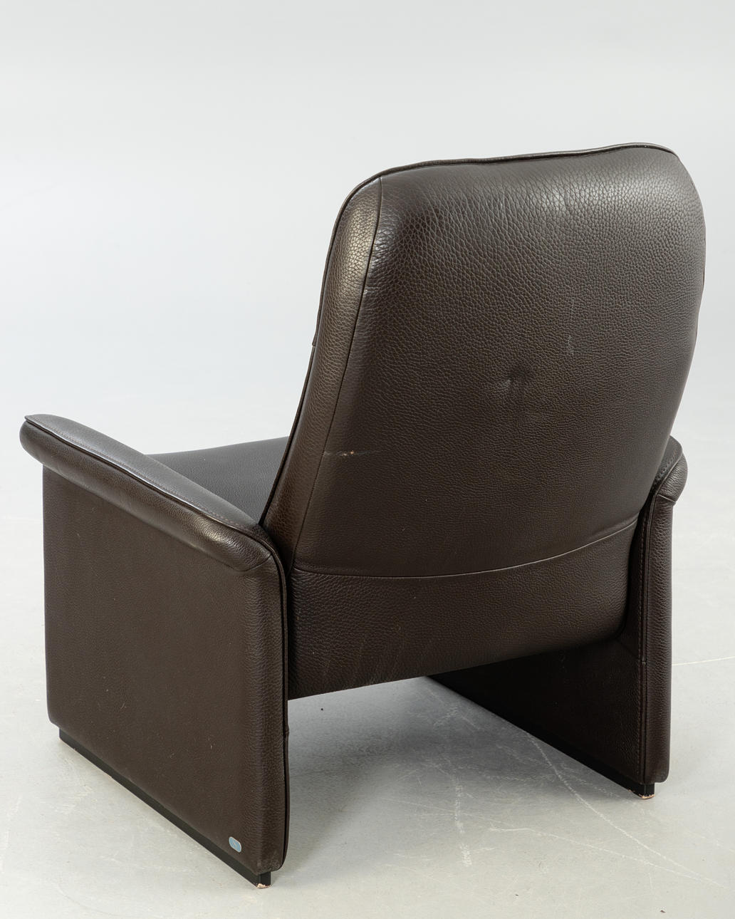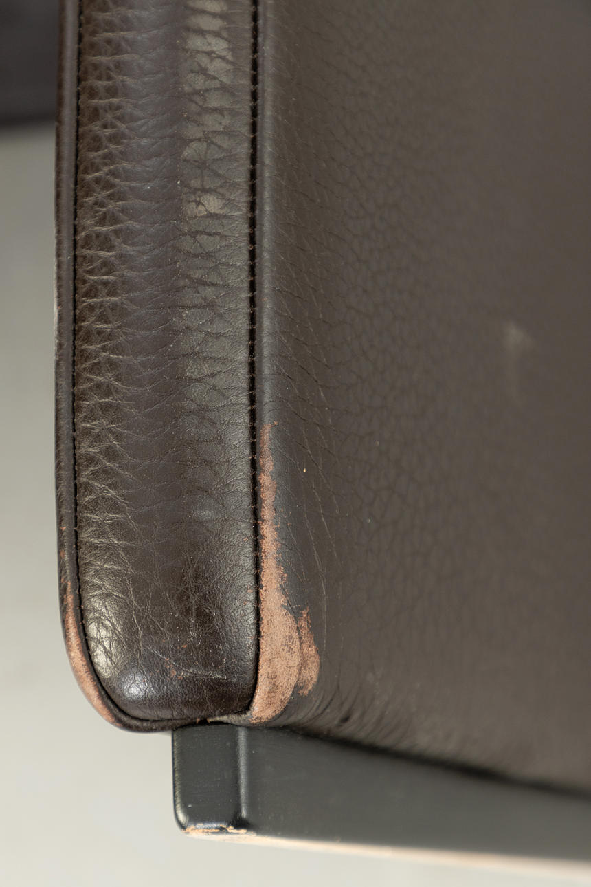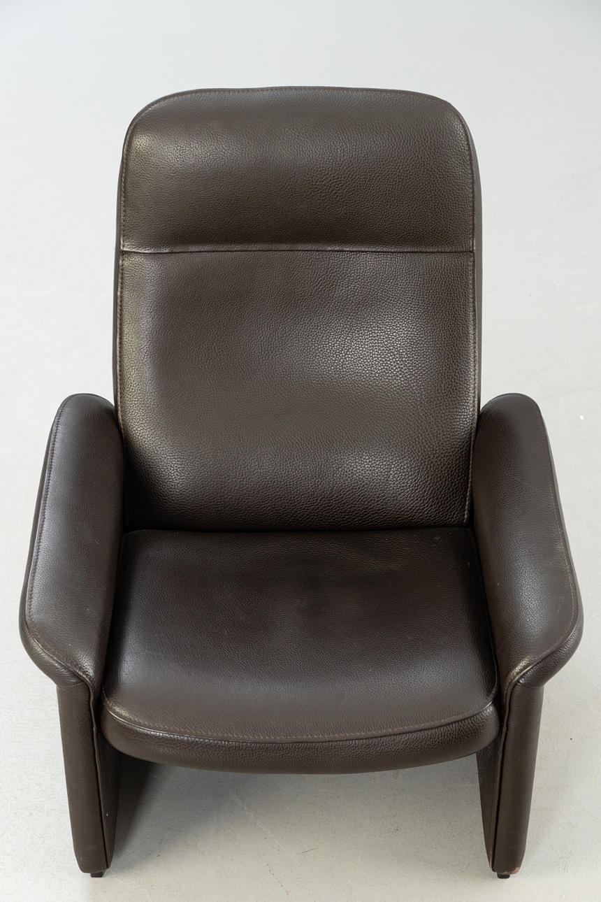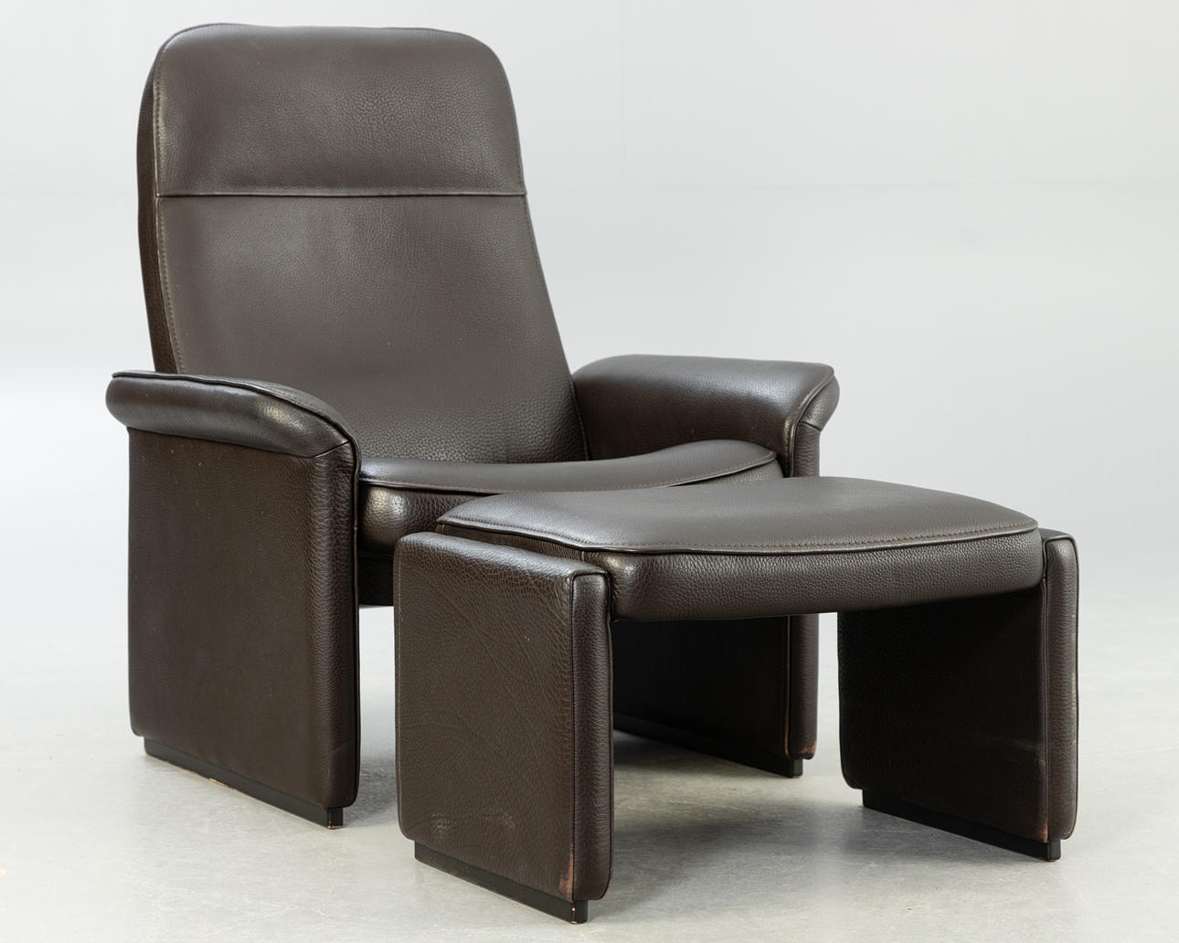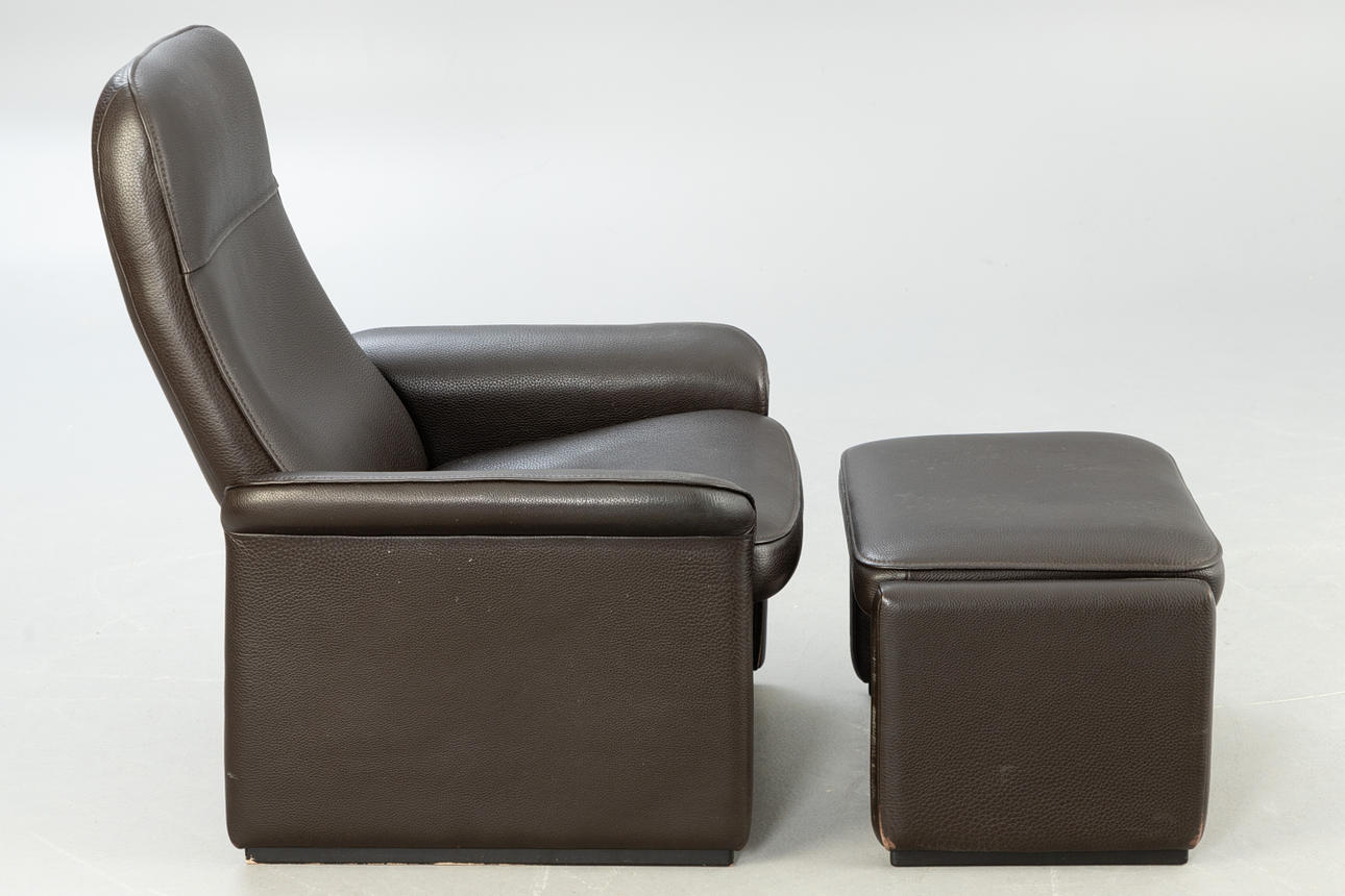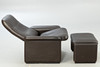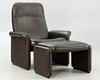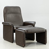 Adjustable backrest chair and matching stool. Upholstered and covered with thick, dark brown leather.