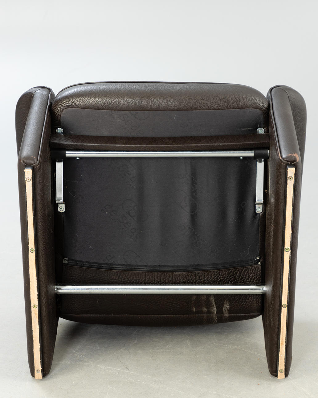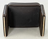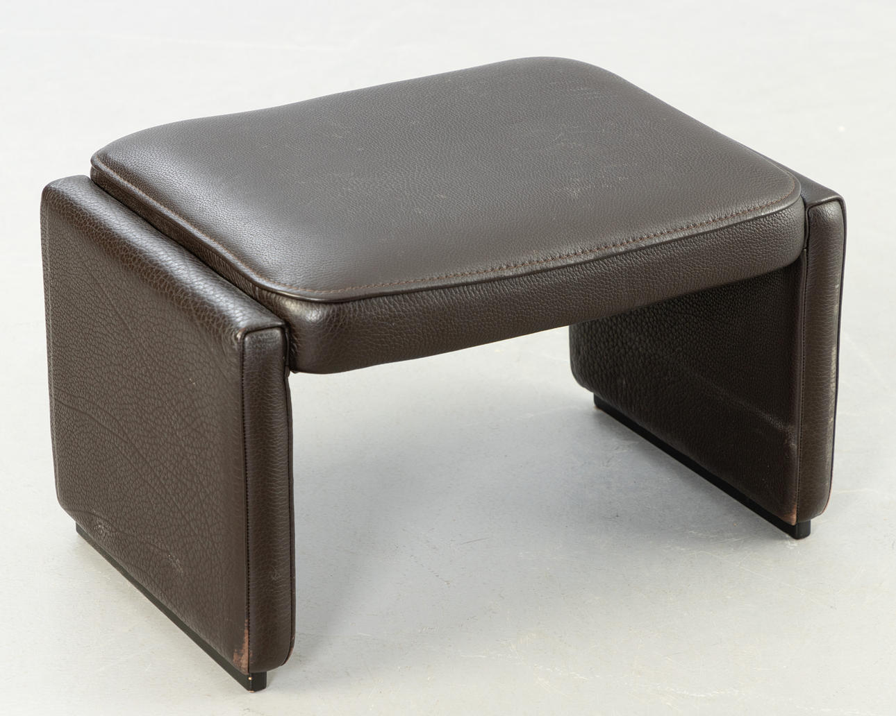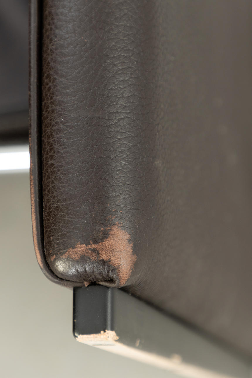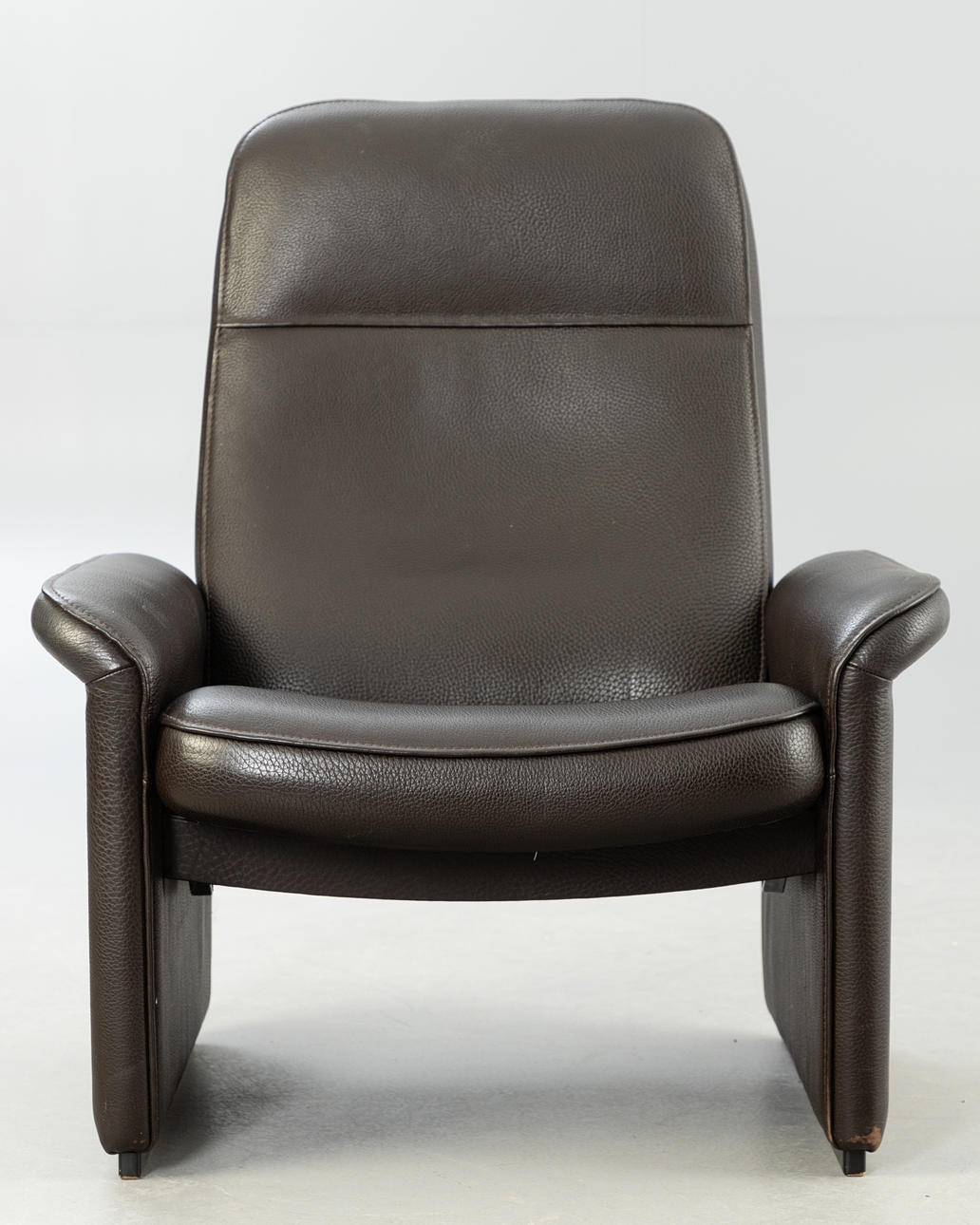 Adjustable backrest chair and matching stool. Upholstered and covered with thick, dark brown leather.