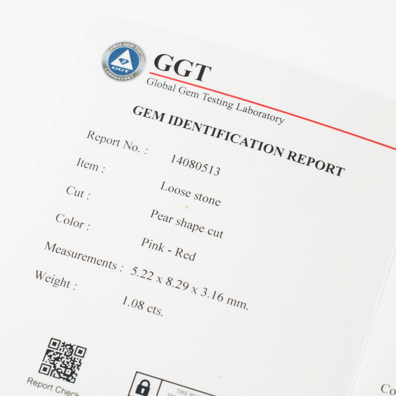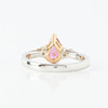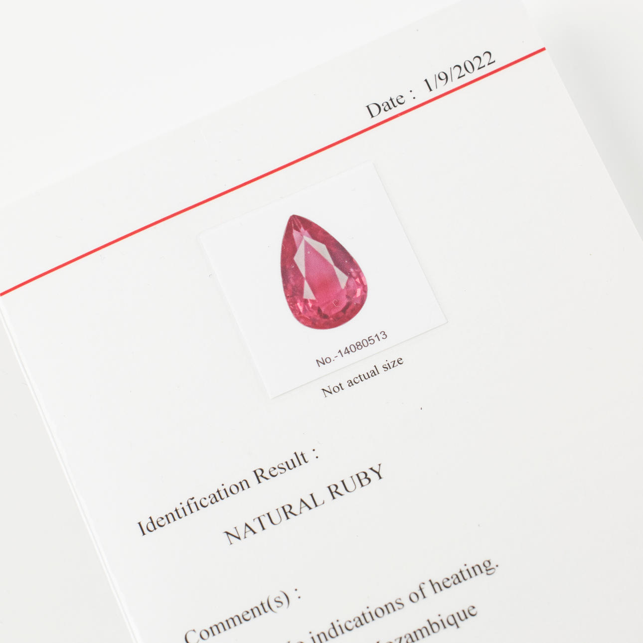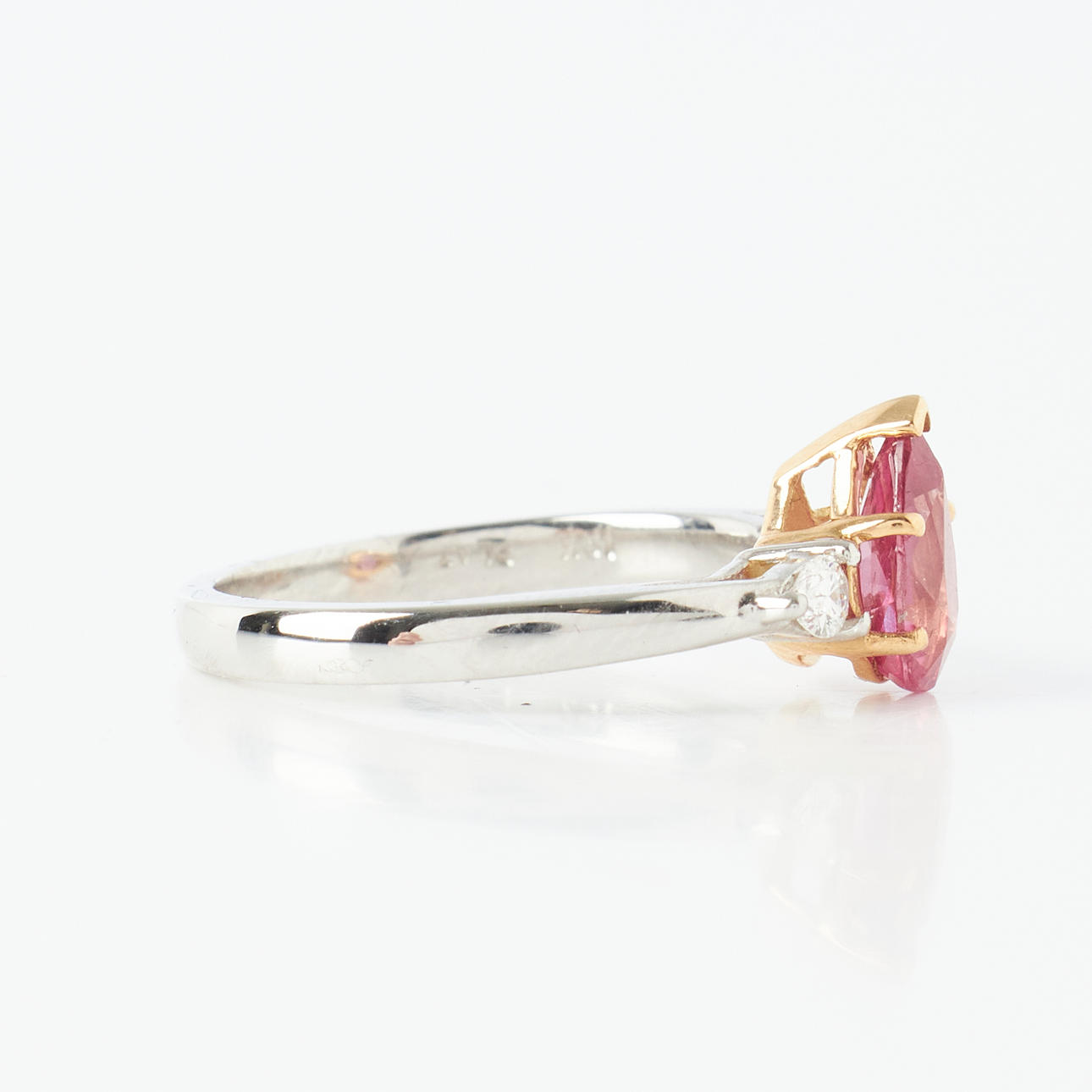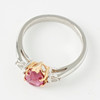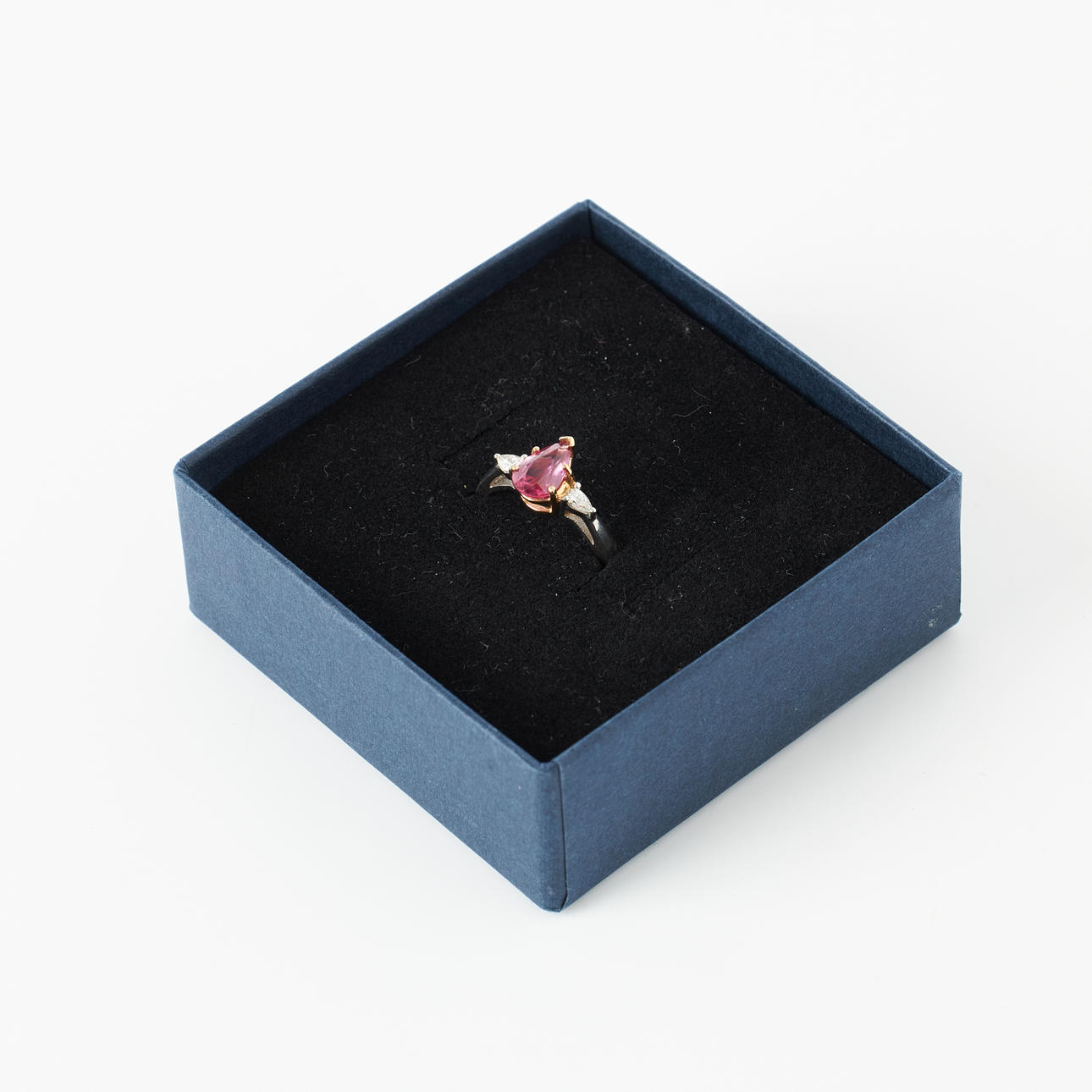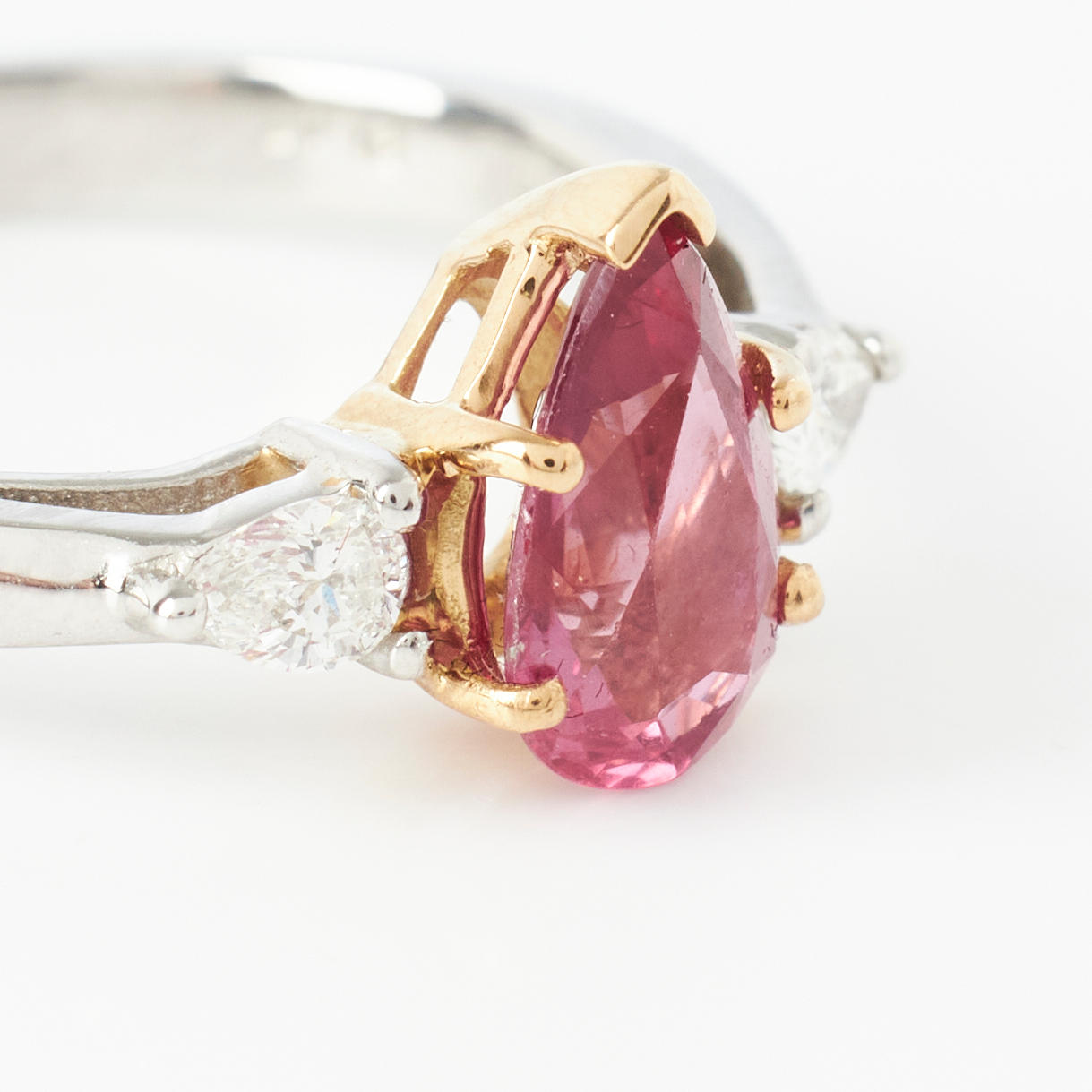 3331662. RING, 18k gold/platinum, 1 pendulum loque-cut ruby, appears untreated, approx. 1.08 ct, flanked by 2 pendulum loque-cut diamonds, total approx. 0.30 ct.