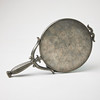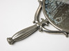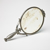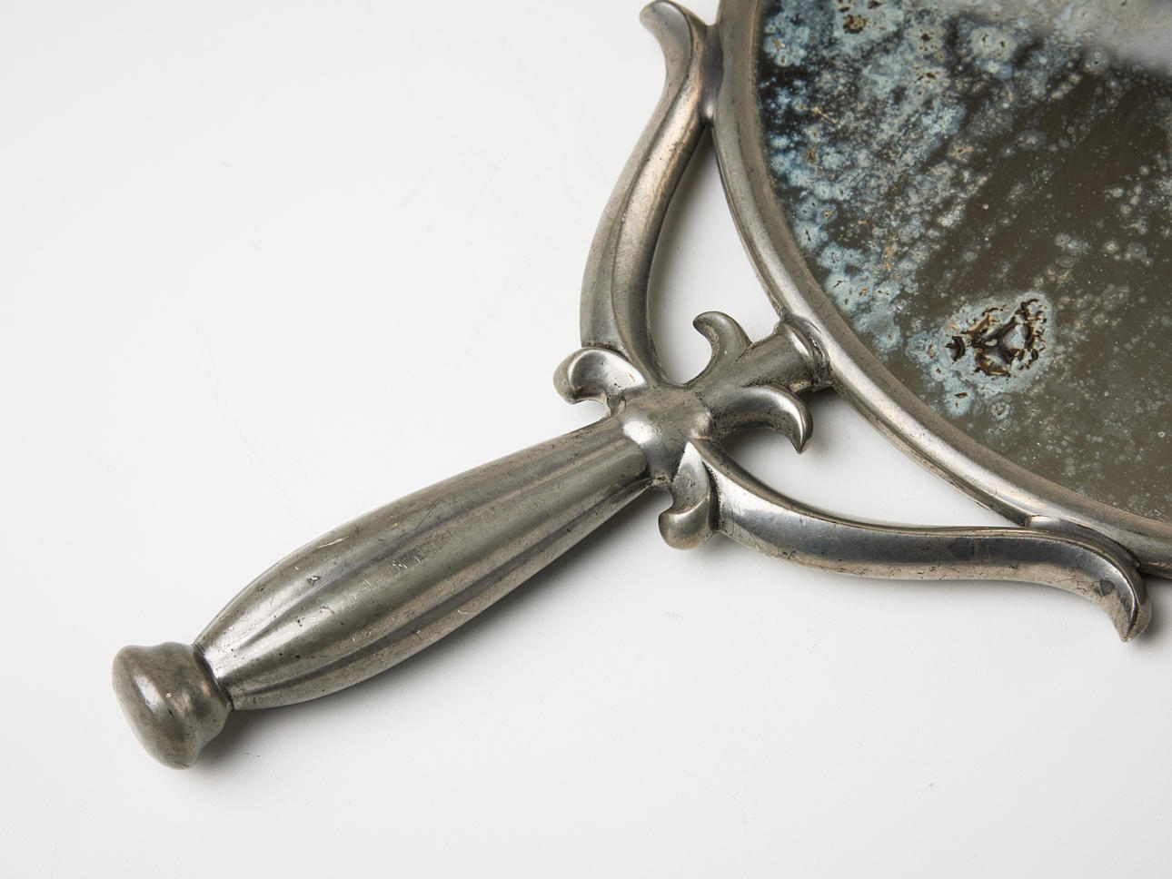 Tin, round mirror with smooth convex back, well-crowned handle with molded decor of stylized leaves, stamped SVENSKT TENN E8 (for 1931), length 26 cm.