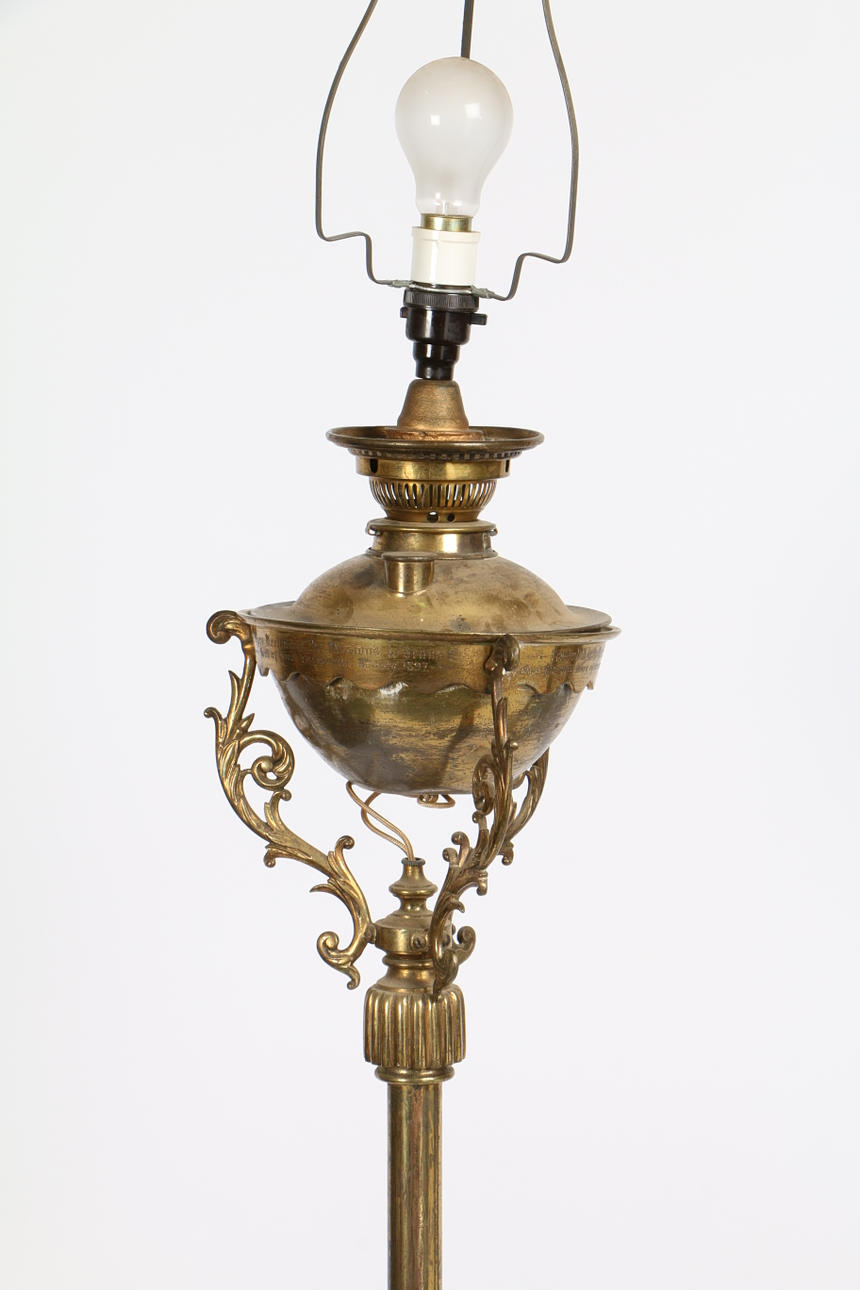 A Late Victorian brass standard lamp, the lamp inscribed "Mothers Meeting of the Missions to ? Port of Great Yarmouth 1897" having a central column with floral swag decoration, 190cm high.