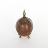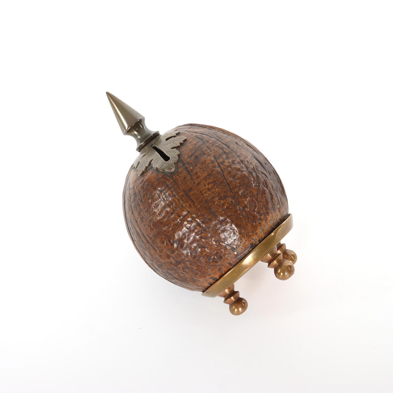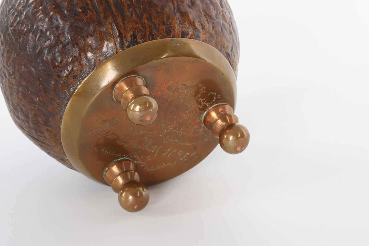 Money box, coconut with brass fittings. Inscription underneath with monogram and dating “the 29 May 1898".