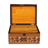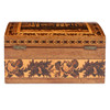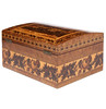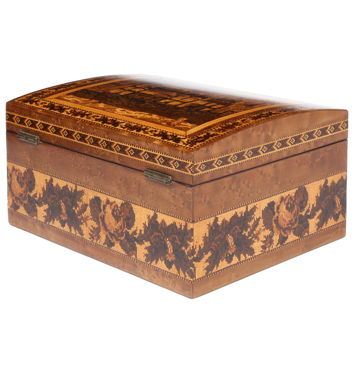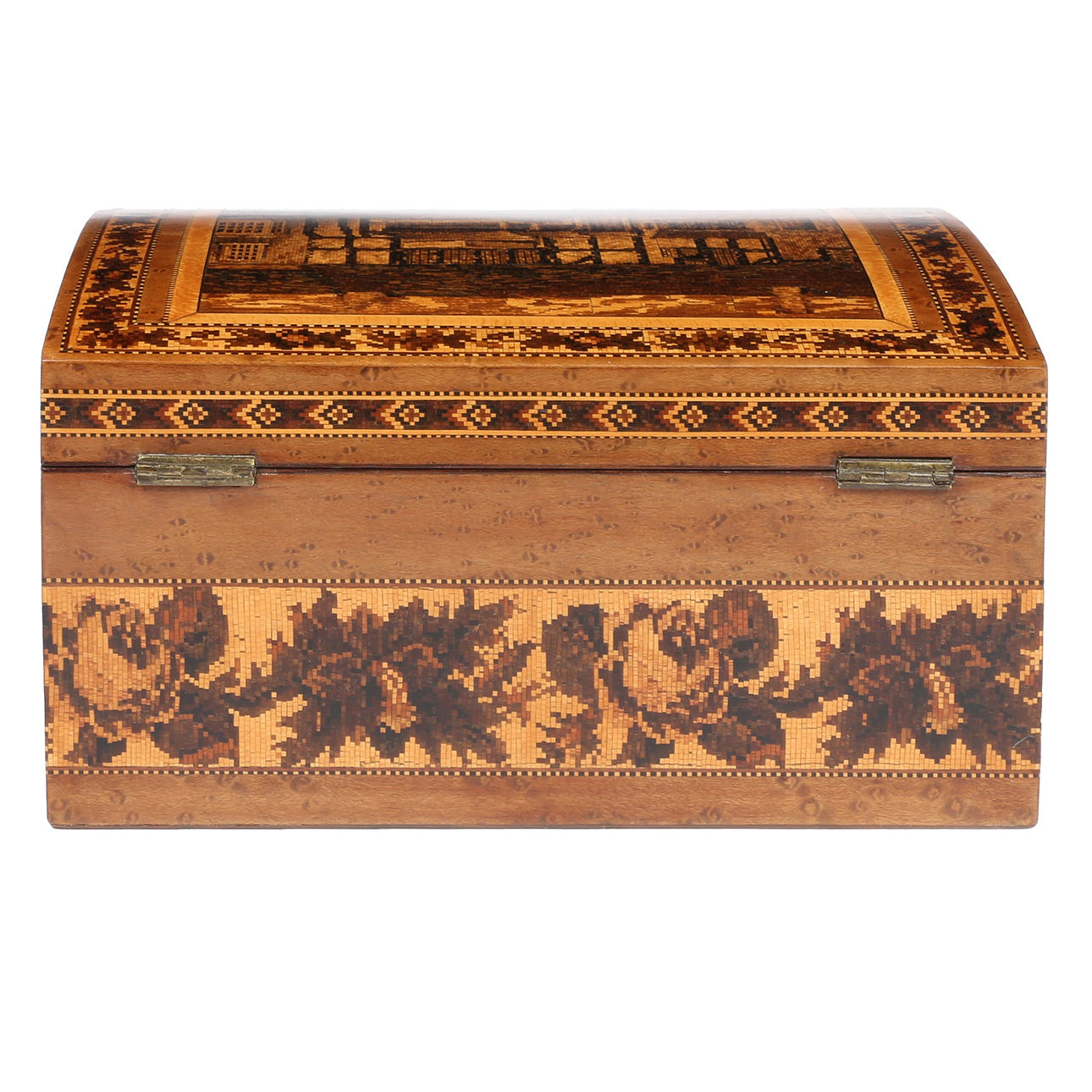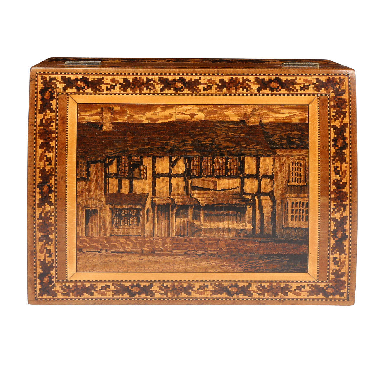 the slightly domed top depicting a old beamed house and with a repeating leaf border and having a satin wood interior and with a floral band to the body, 22cm wide 17cm deep 11.5cm high.