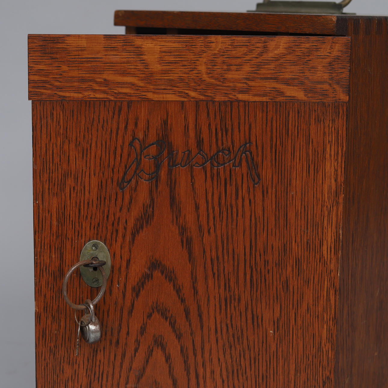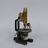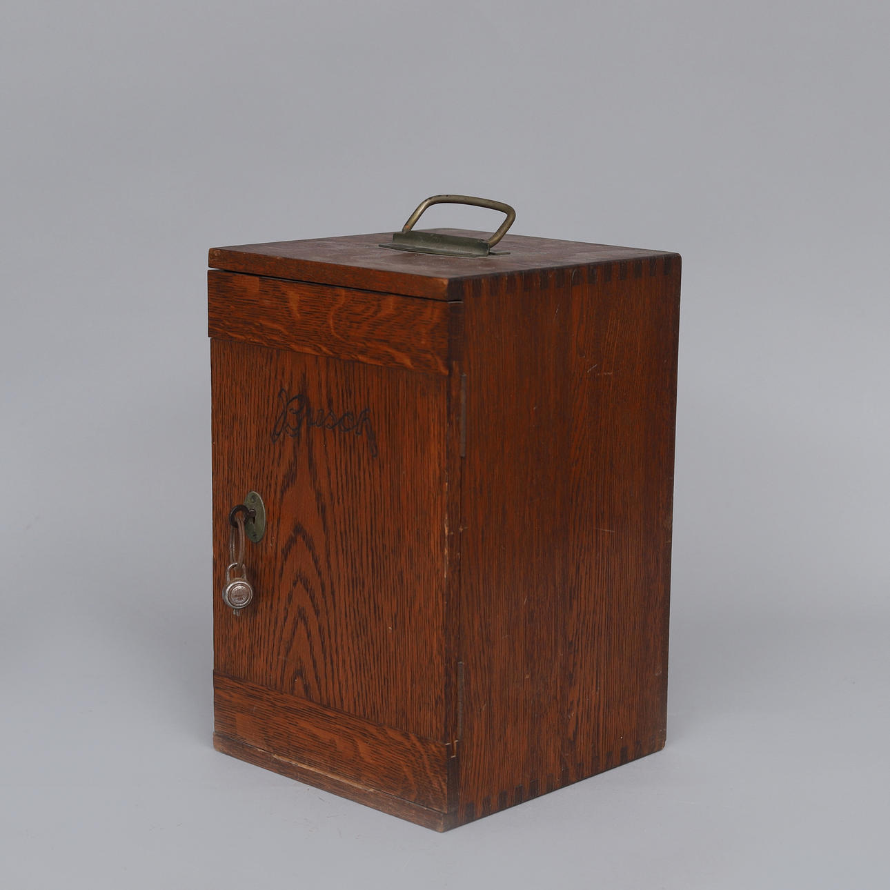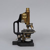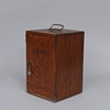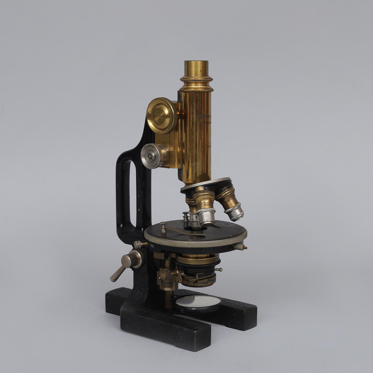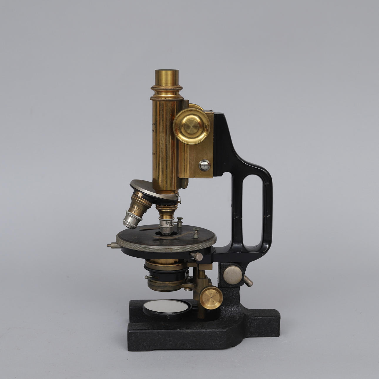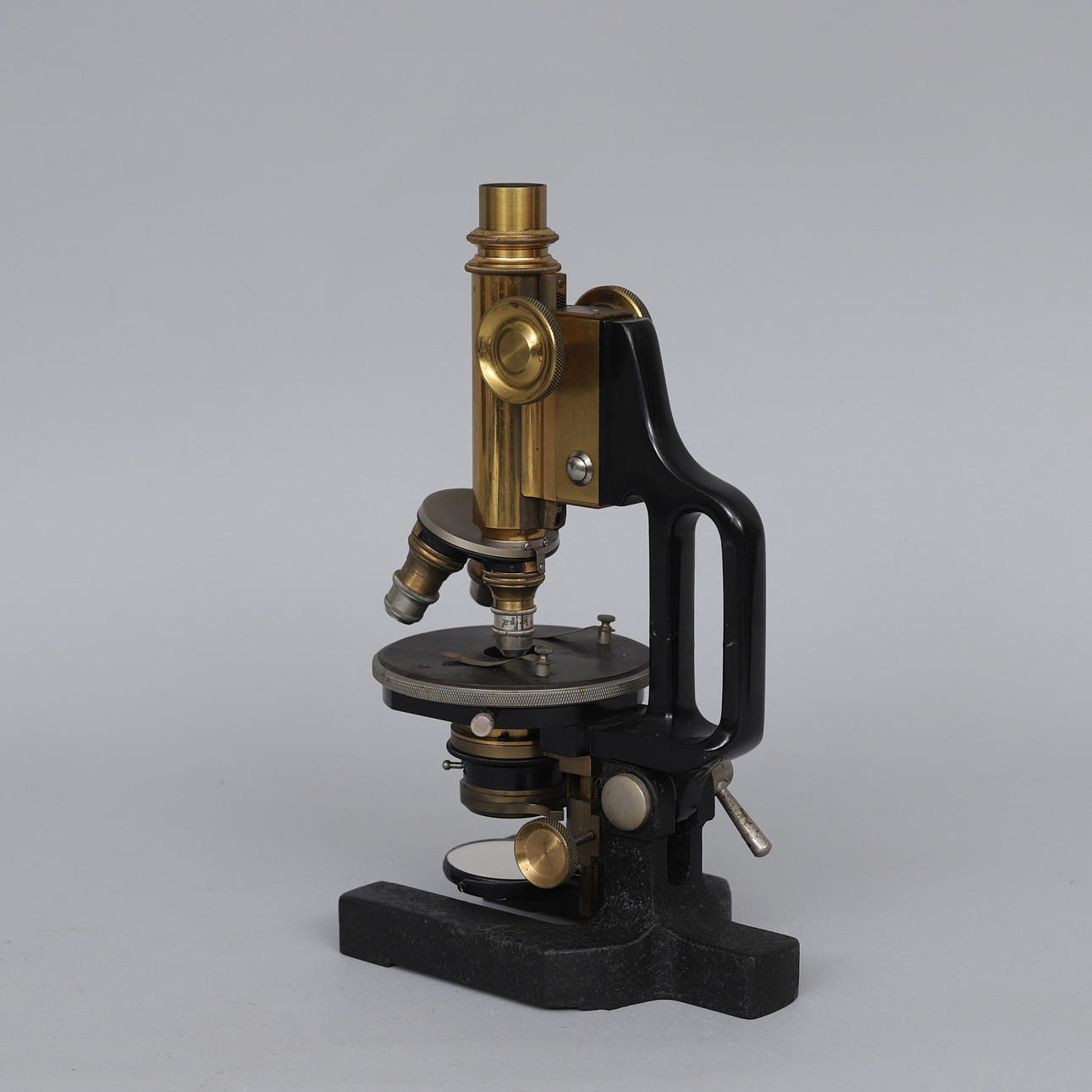 Made of cast iron and brass, Solid oak case. Microscope, height 29.3 cm. Case dimensions 22x23 cm, height 35,2 cm.