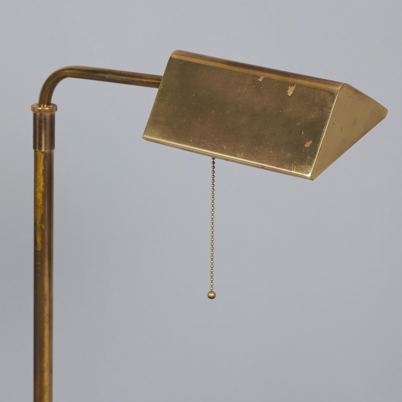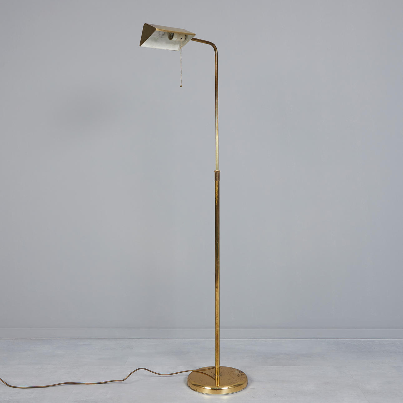 Floor lamp/floor lamp, brass, 1970s. Brass floor lamp with a trapezoidal lampshade with pull switch and a burner as well as a round base, height-adjustable arm, h.100-140cm, D. foot: 25cm.