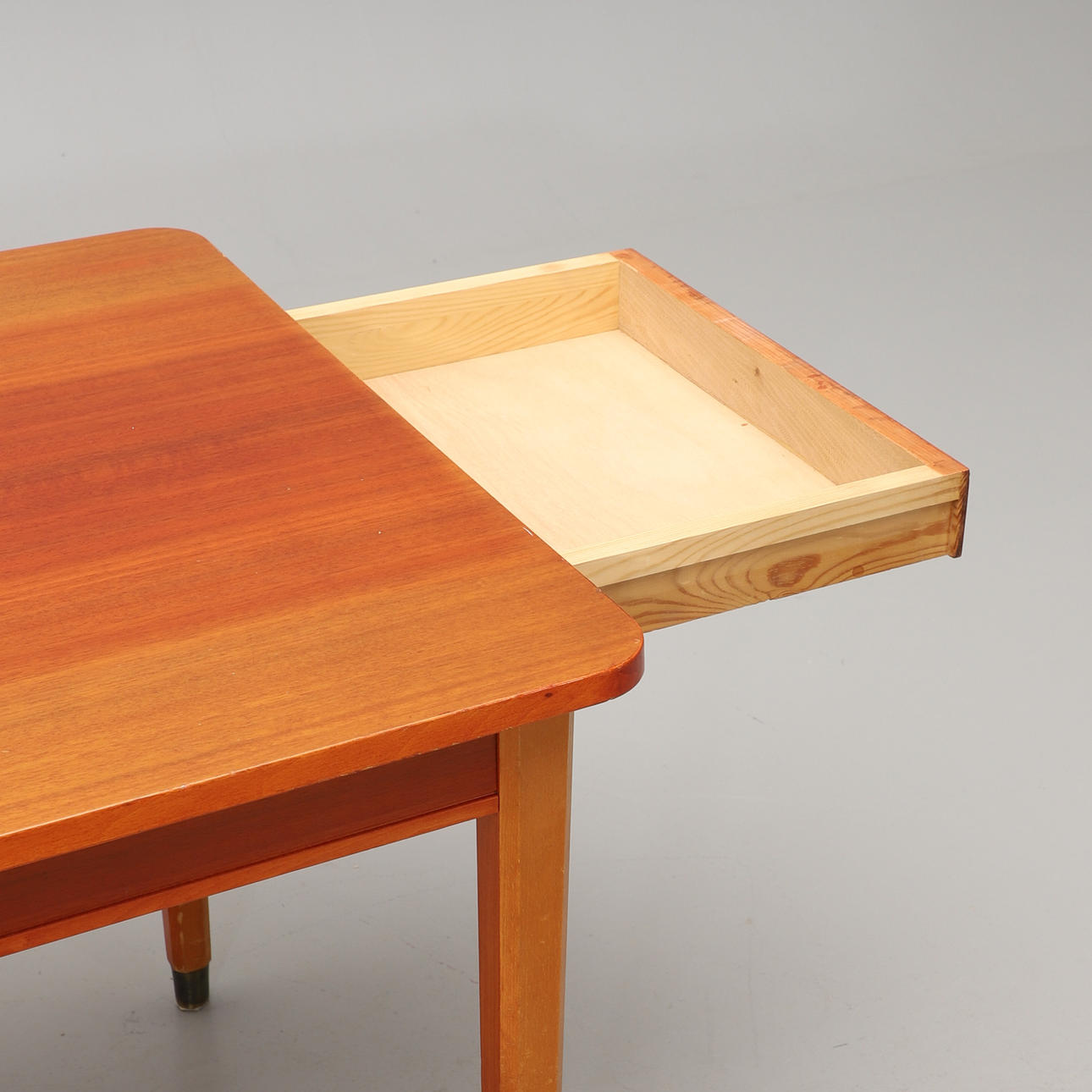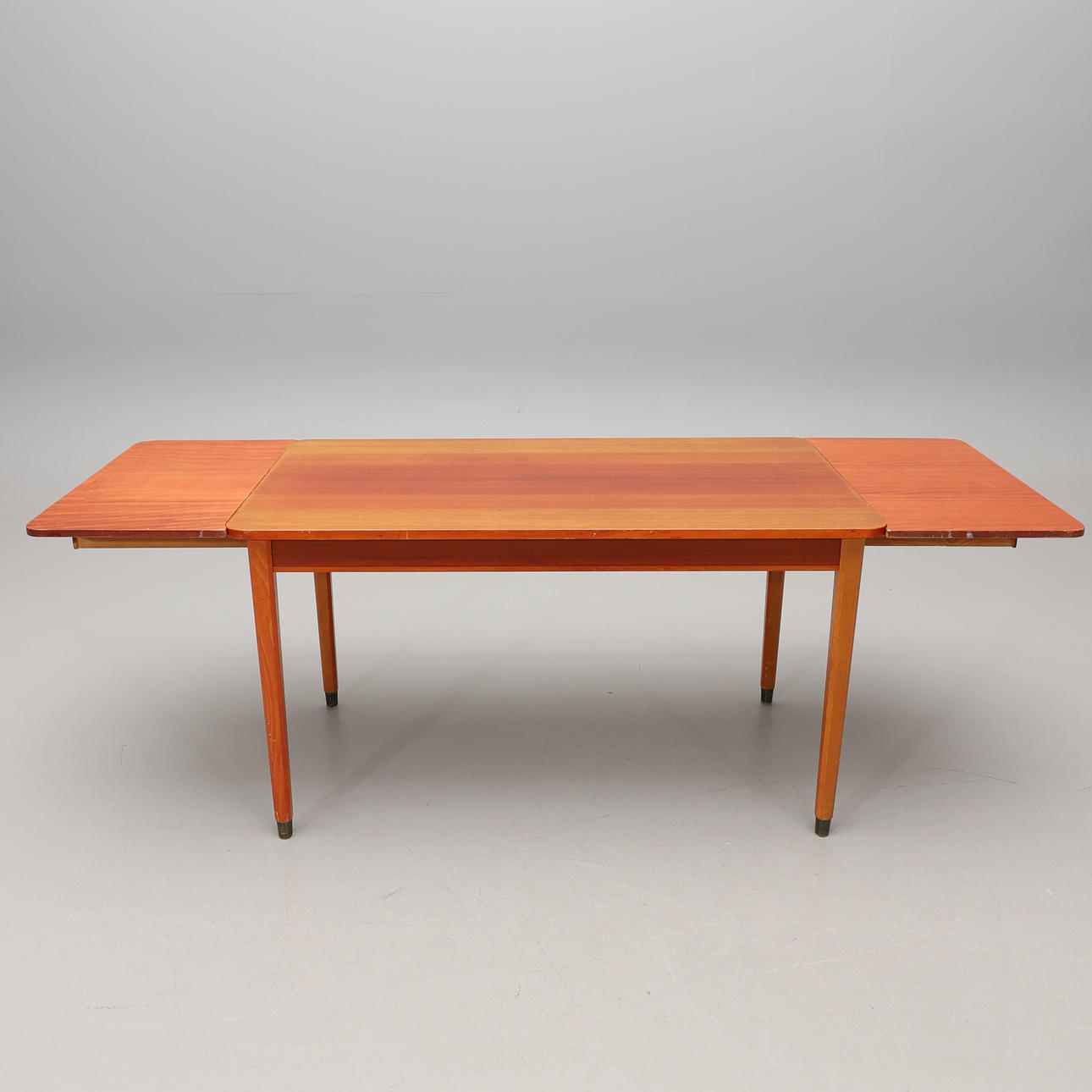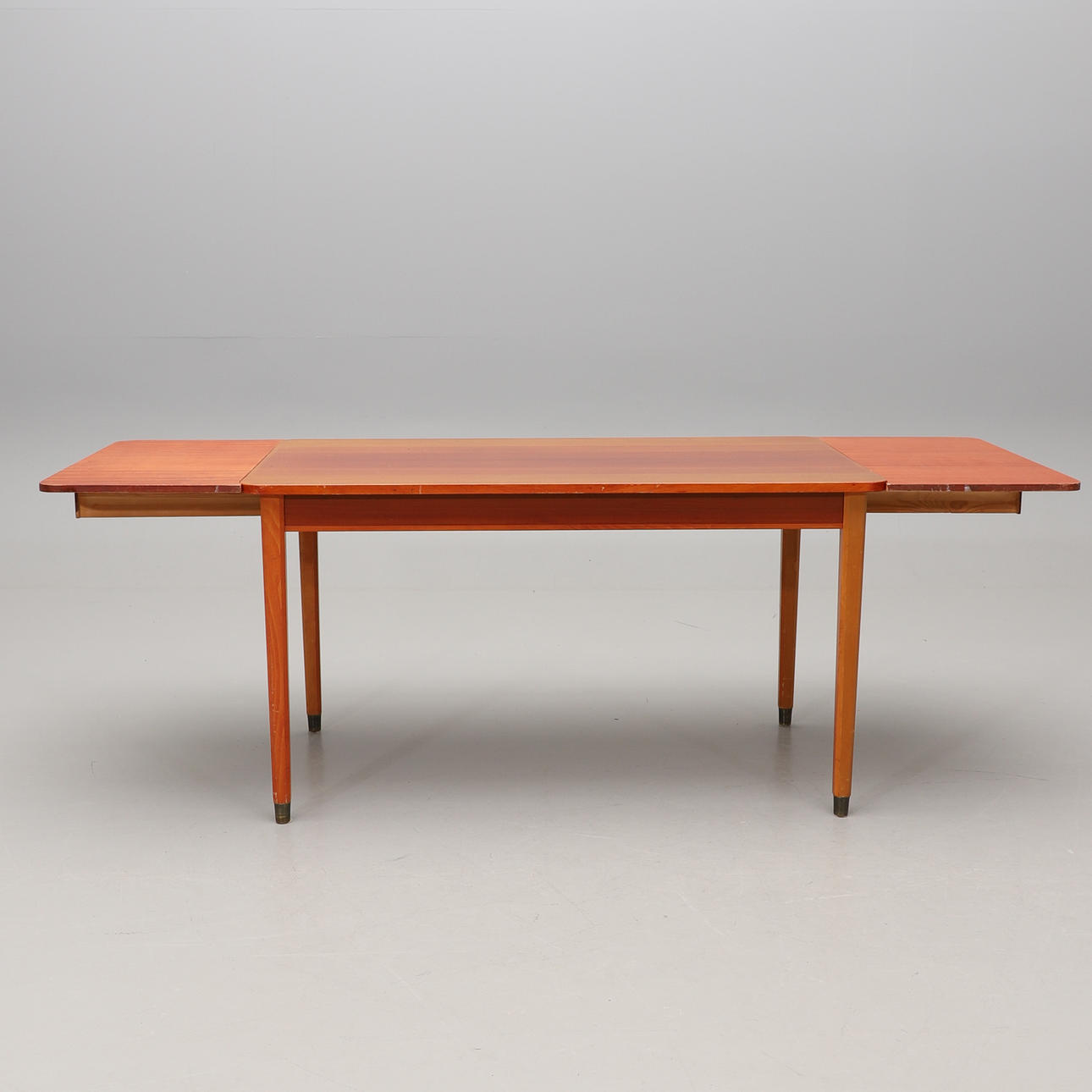 Mahogany veneered disc, beech legs with brass lining. Two loading boards of 41 cm in extendable drawers on the short sides Length 135, width 79, height 74 cm.
