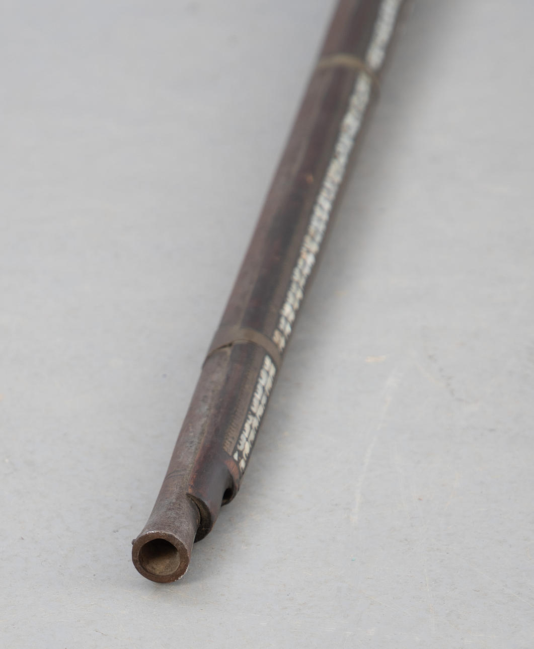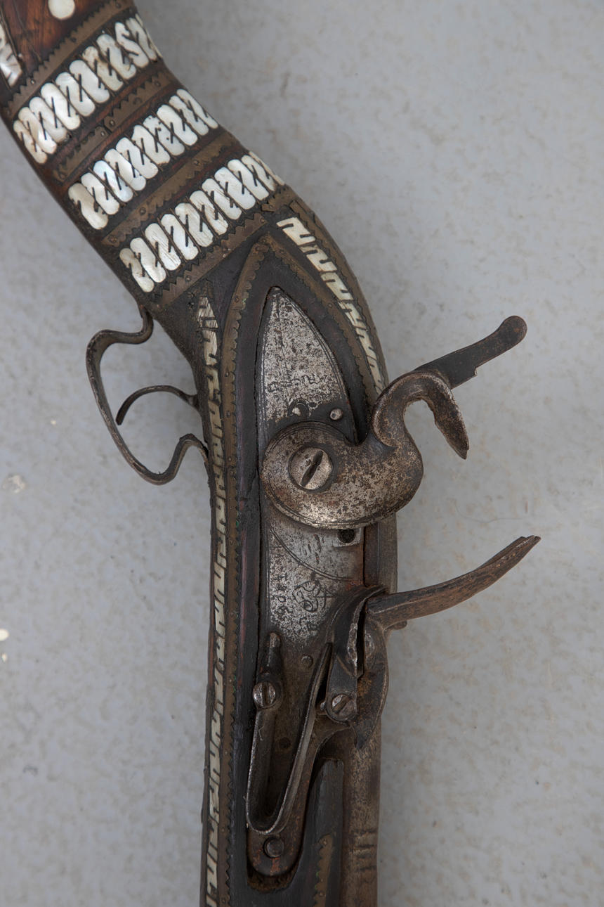 Elaborately decorated muzzle loader with mother-of-pearl inlays, curved shaft and brass fittings, 18/19. century.