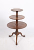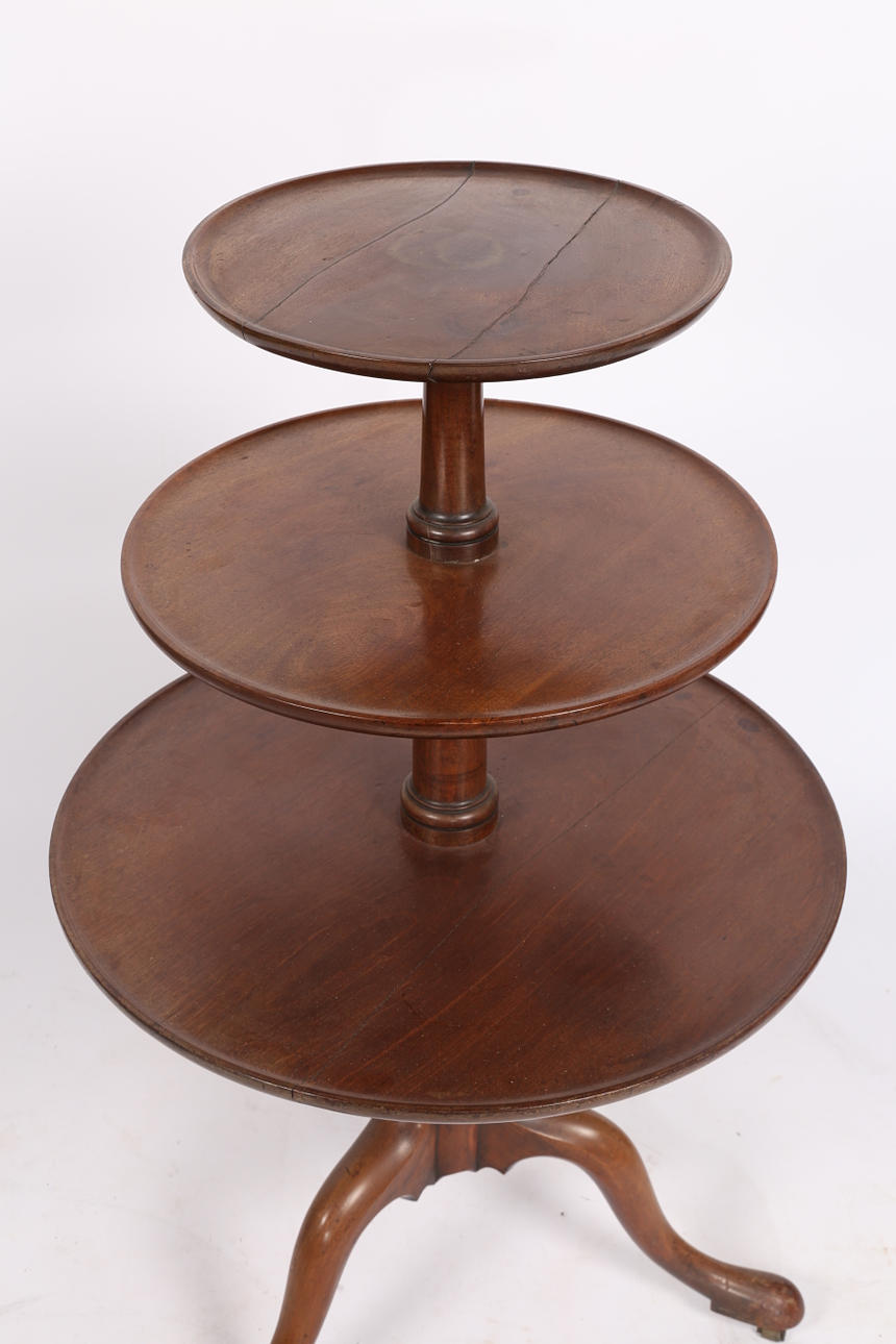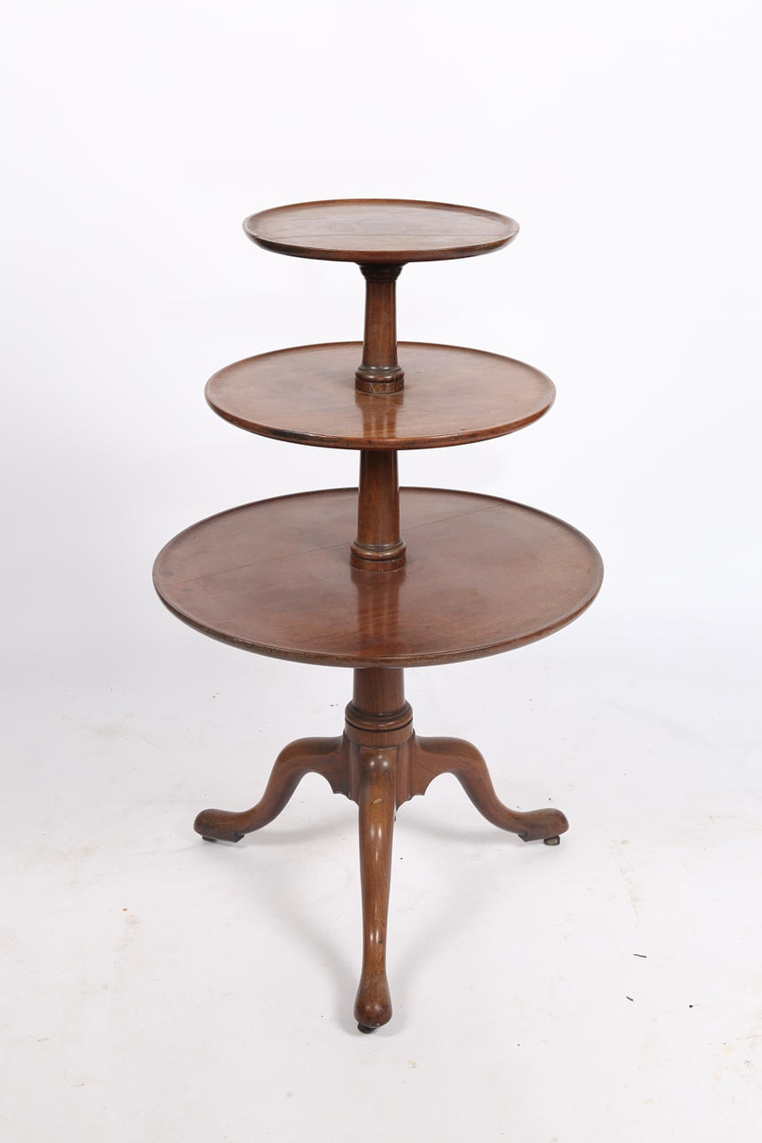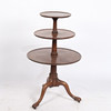 A George III mahogany whatnot, having three graduating circular tiers united by a turned central column raised on cabriole legs and castors, 107cm high 66cm wide.