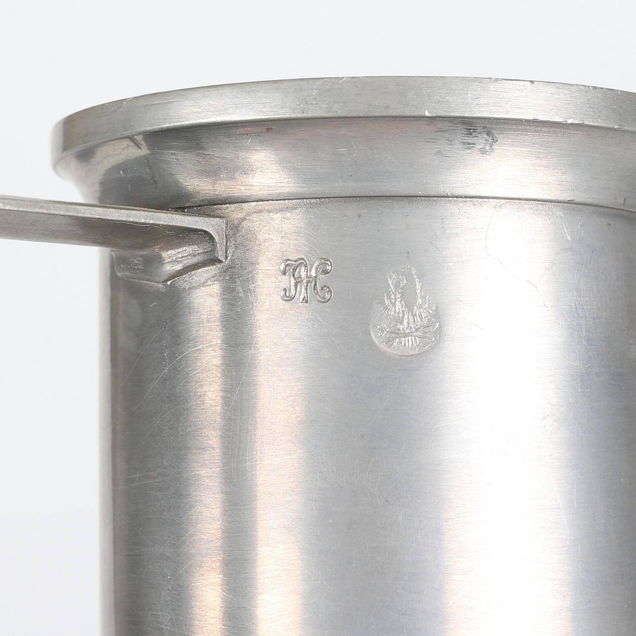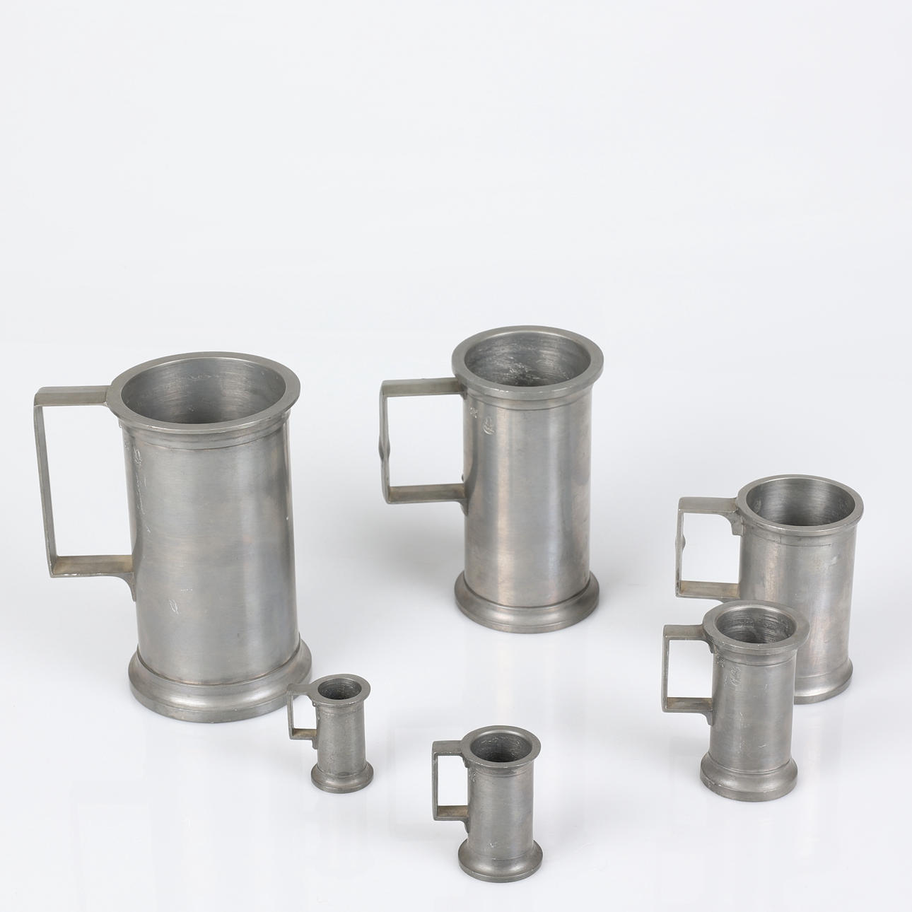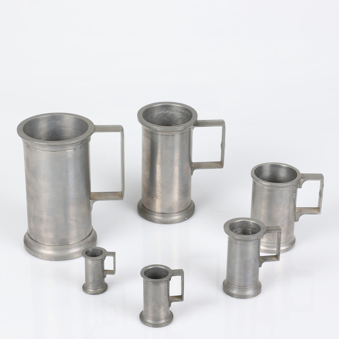 A total of 6 measuring jugs in tin of which 5 were stamped AC, and one from an unknown manufacturer.
