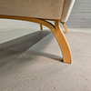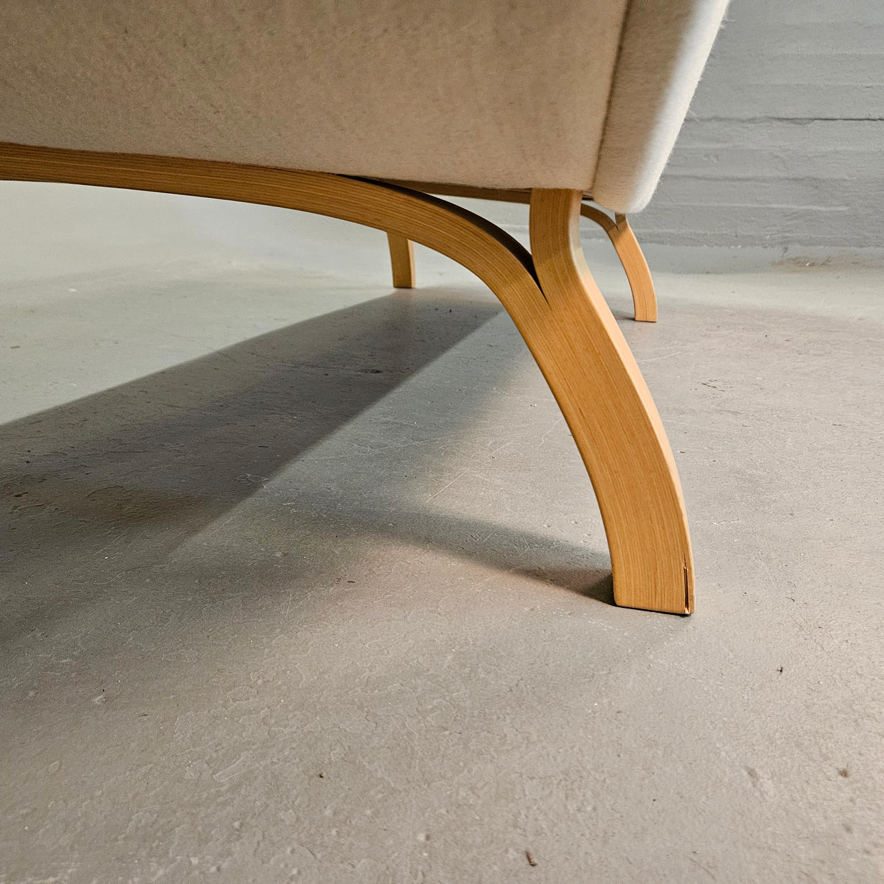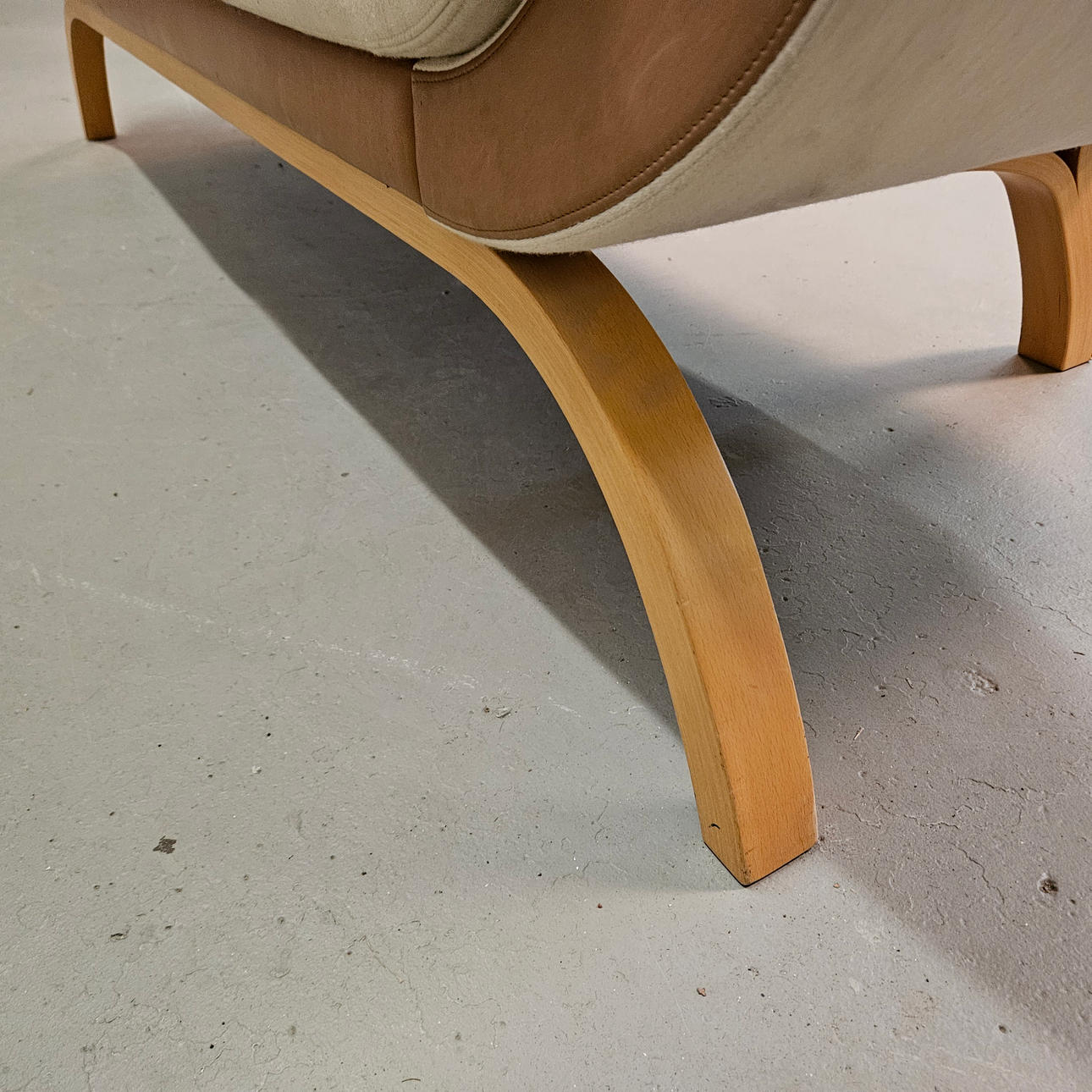 Beech legs, textile upholstery, loose seat cushions with removable upholstery, armrests and cushions in leather.
