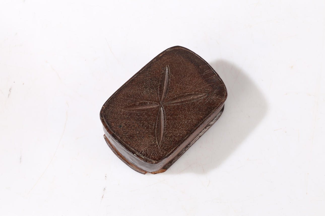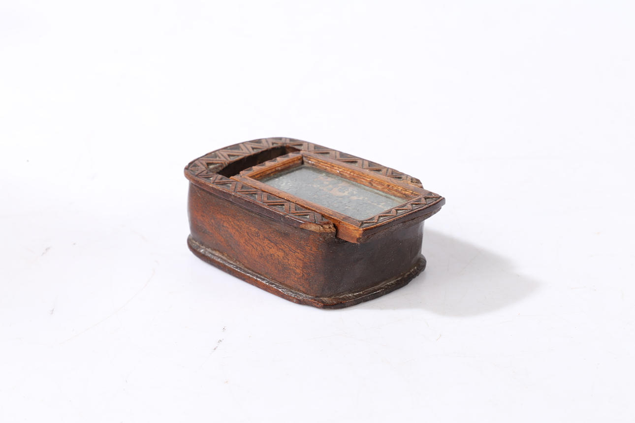 The top with a zig zag design and the sliding lid inset with a glass top, the base carved with a flower, 7.5cm wide.