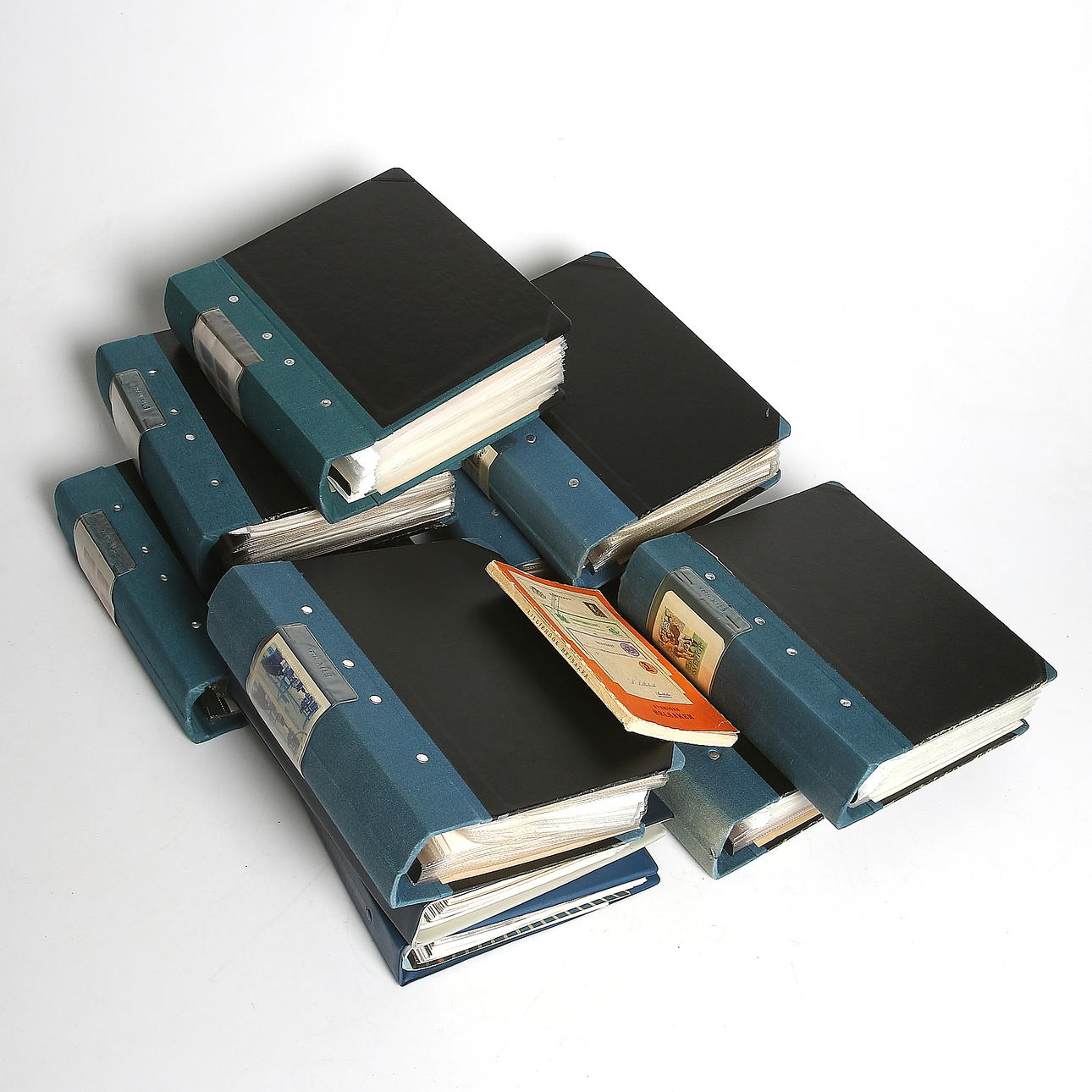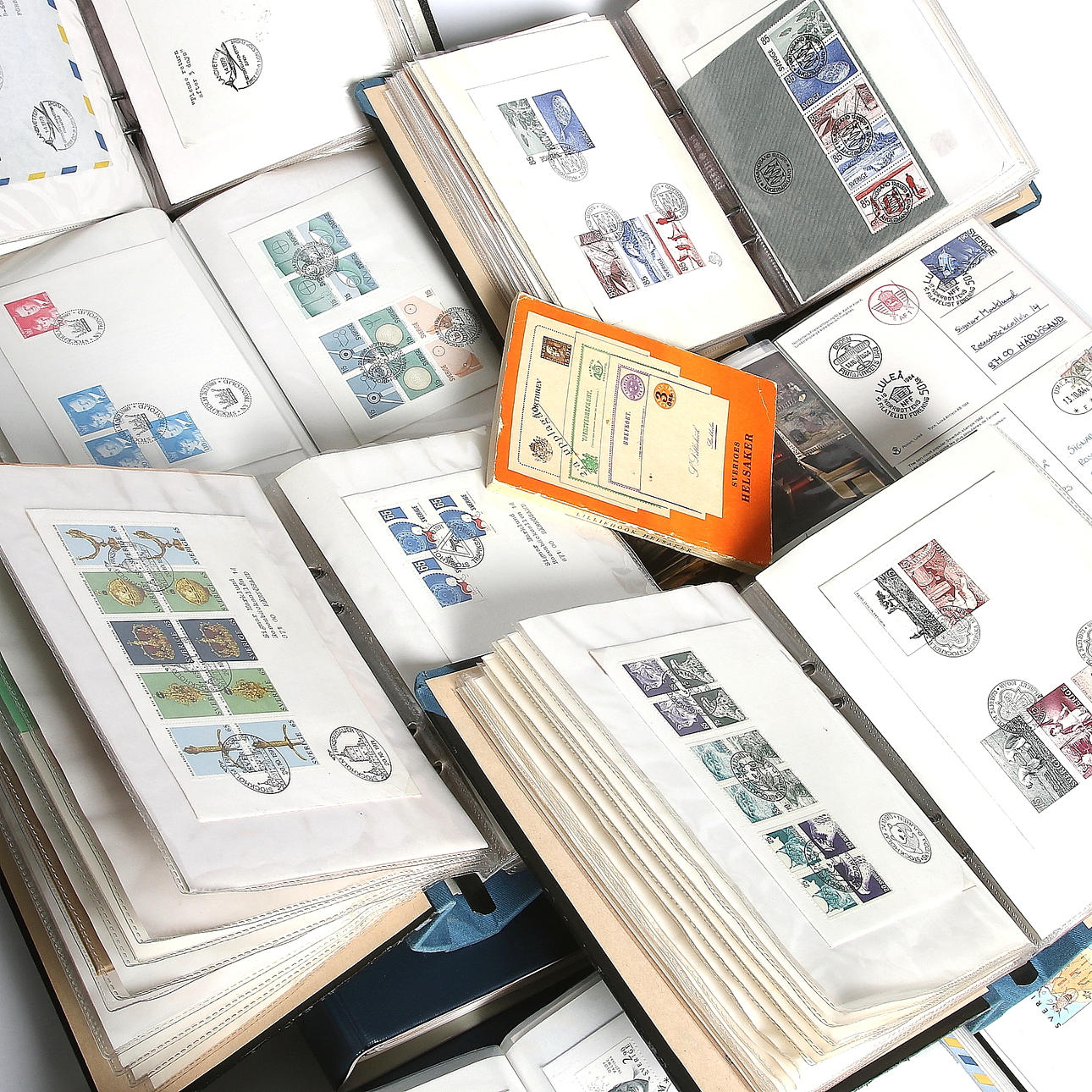 Mostly Swedish, registered letter (FDC) and stamped postcards. Two folders with Posten's Bulletin 1980-90s.