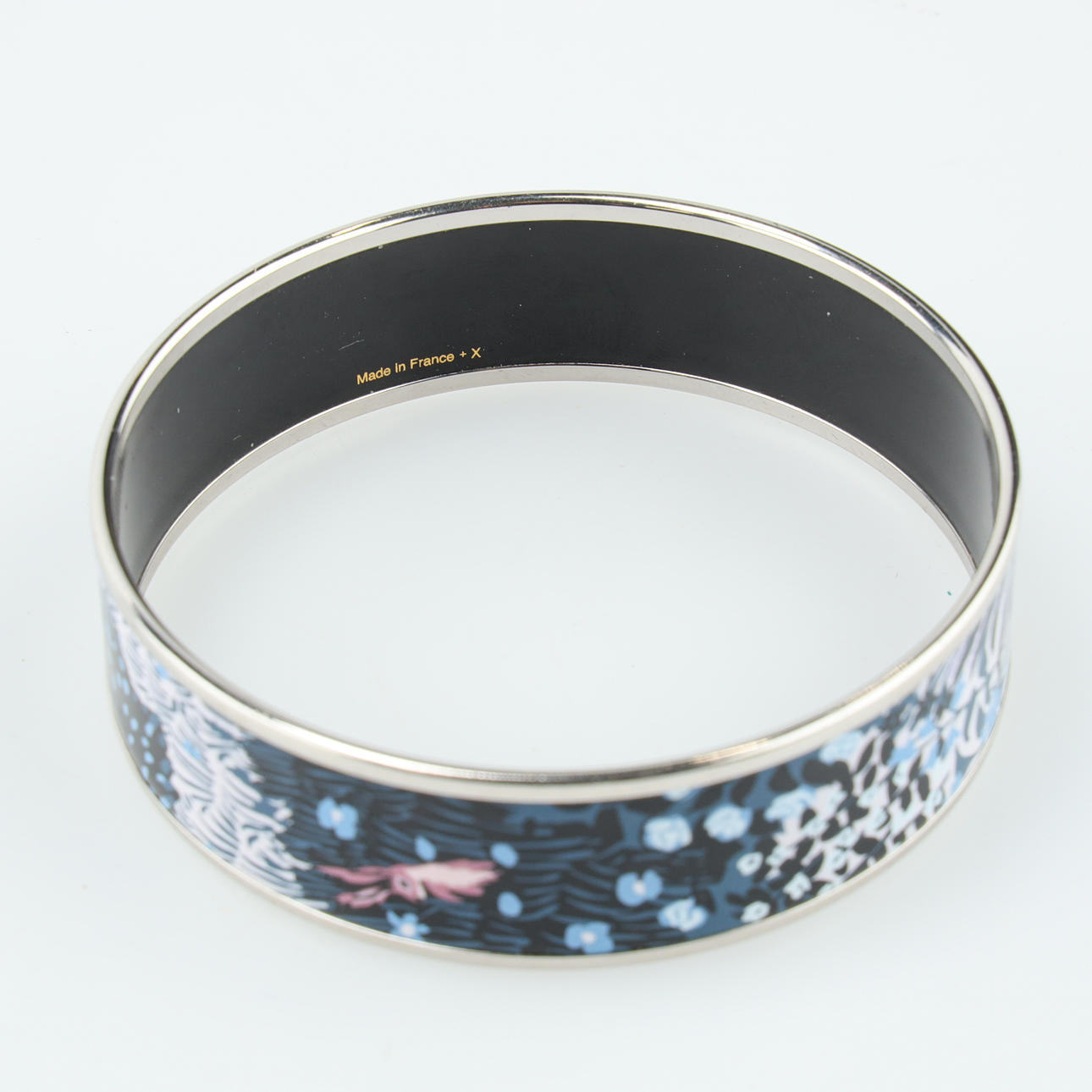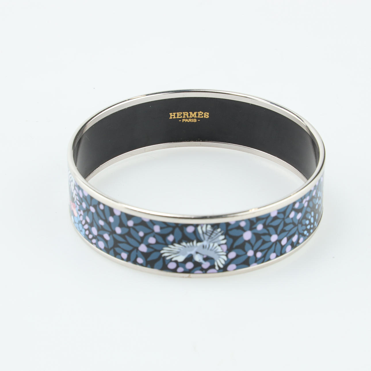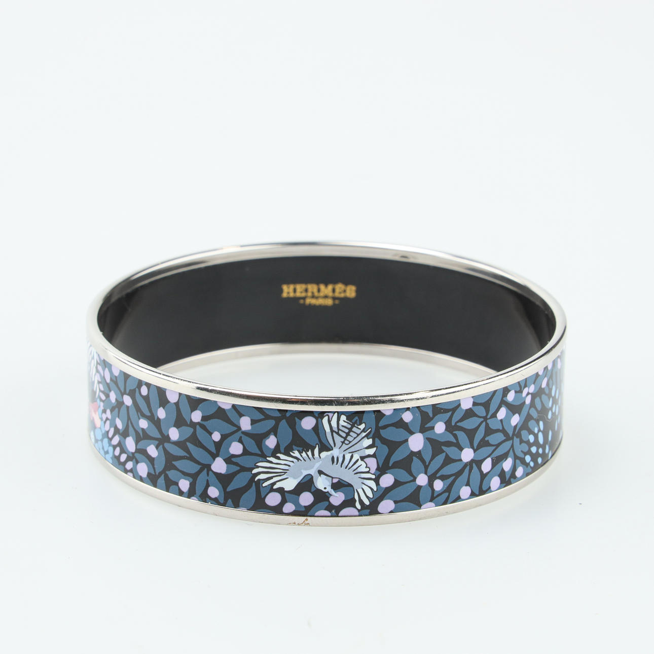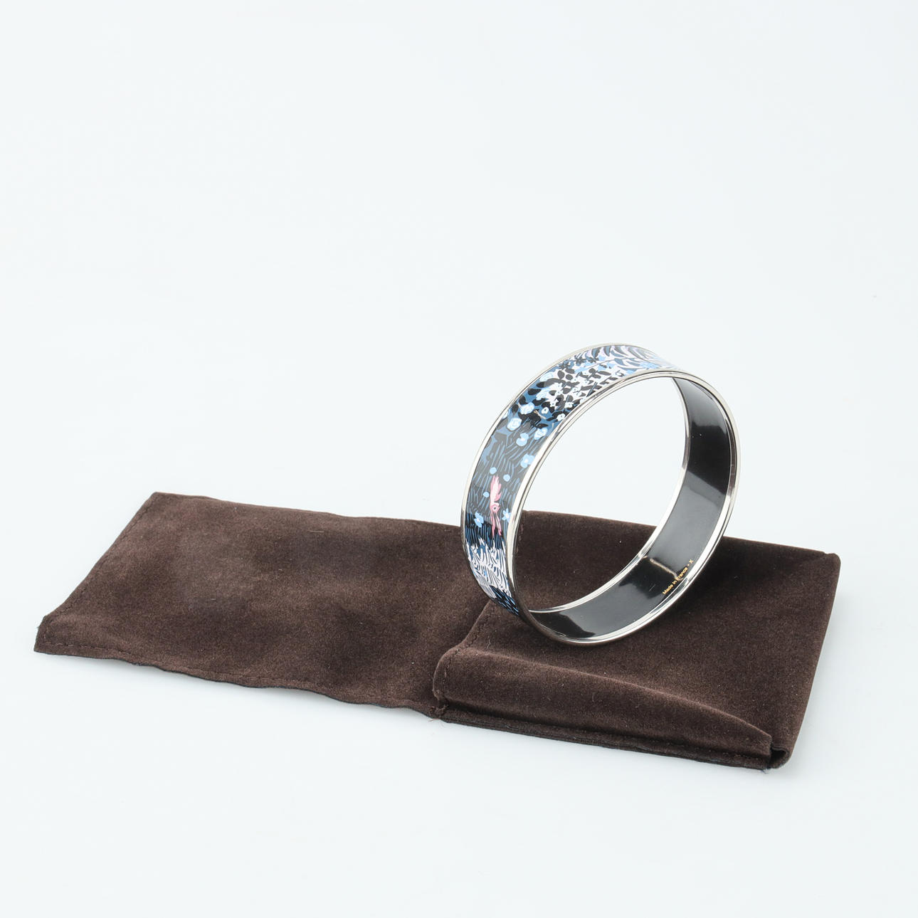 Paladium-plated with enamel work with motifs in the form of rabbits and birds. Marked HERMÈS PARIS, Made in France+X. Circumference about 23 cm. Box and dustbag included.