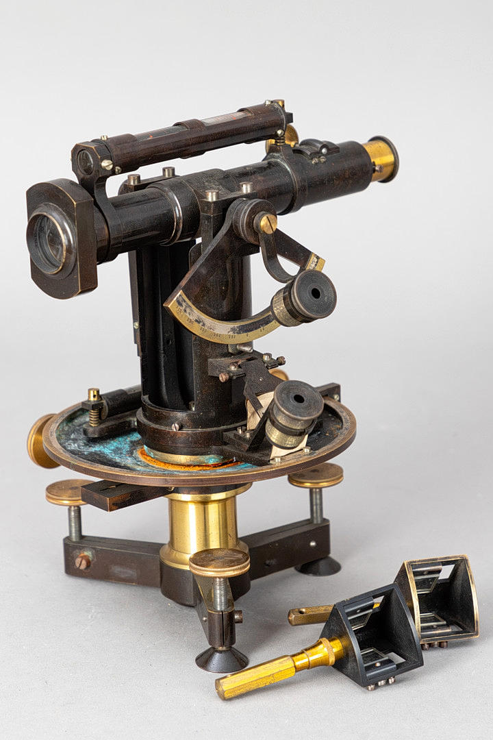 Vienna around 1900. Theodolite, signed “Kammerer/Vienna/No 8775", blackened brass. Telescope with horizontal full circle, vertical quarter circle and accessories. Original wooden case.