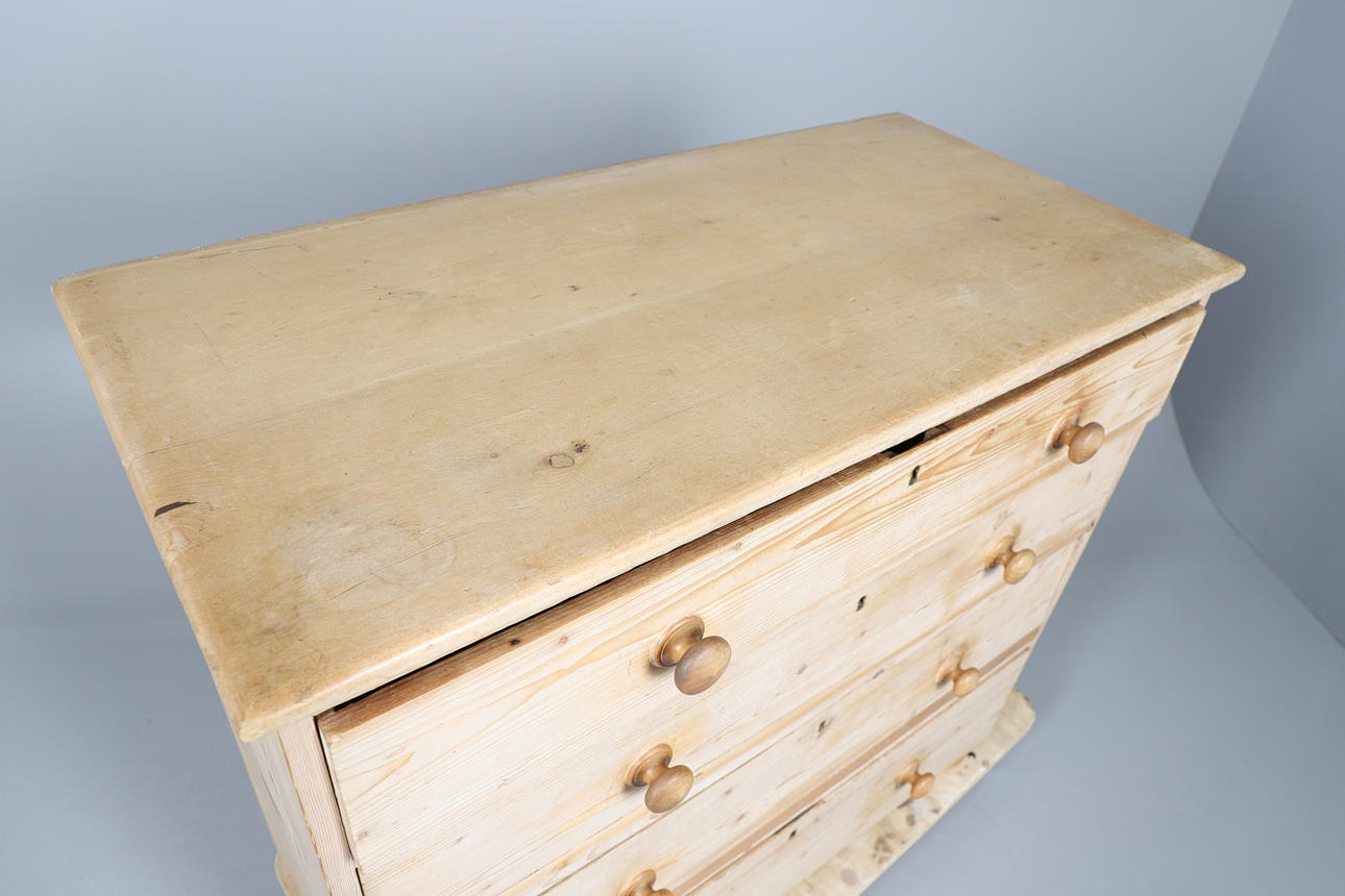 A vintage chest of drawers with a beech top and pitch pine carcas, with four long drawers and supported on replacement bun feet. Top 106cms by 52cms, 96cms high.