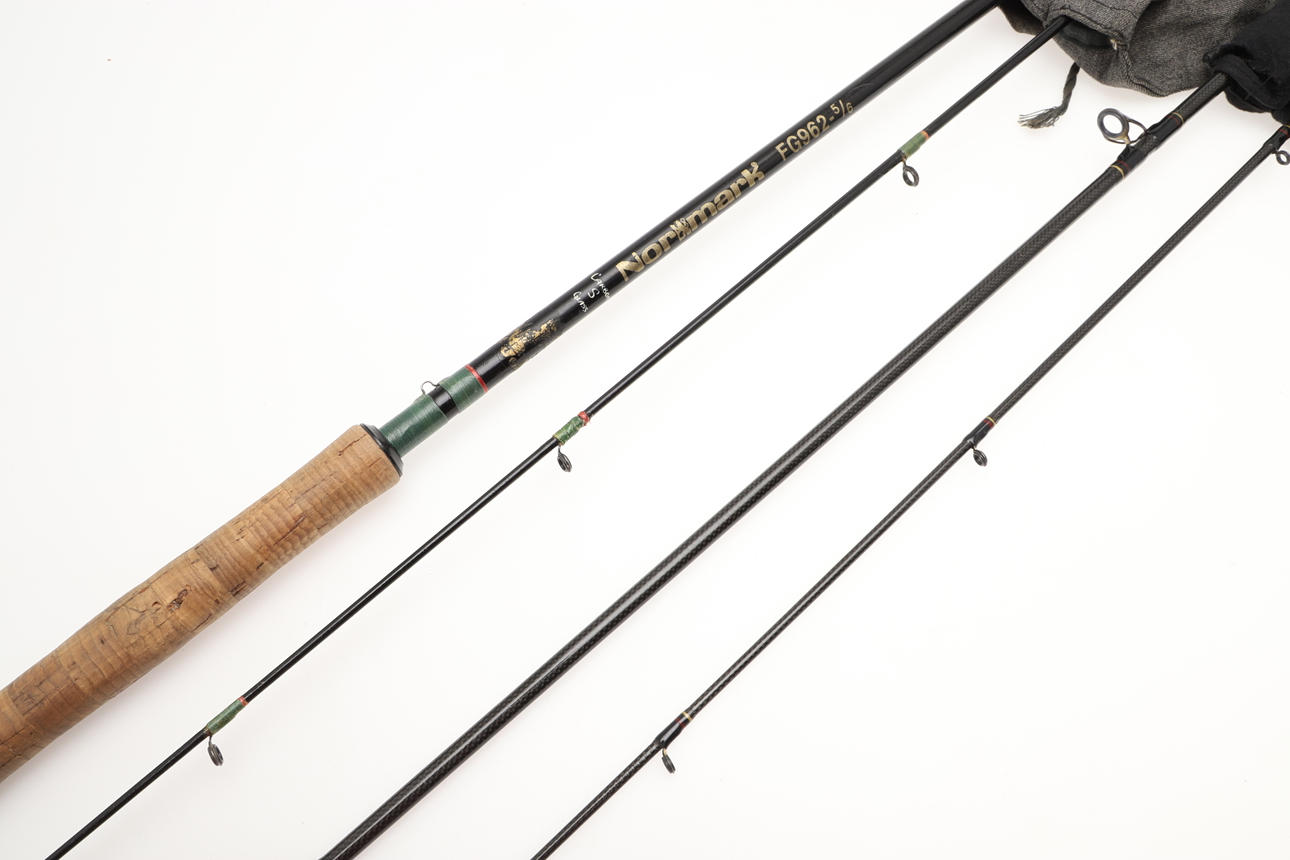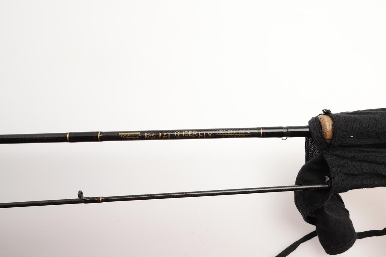 Including a Shakespeare Radial Glider two piece rod (9ft), in a cloth bag. Also with a Normark FG962 two piece rod in a cloth bag, both bags unmarked. (2).