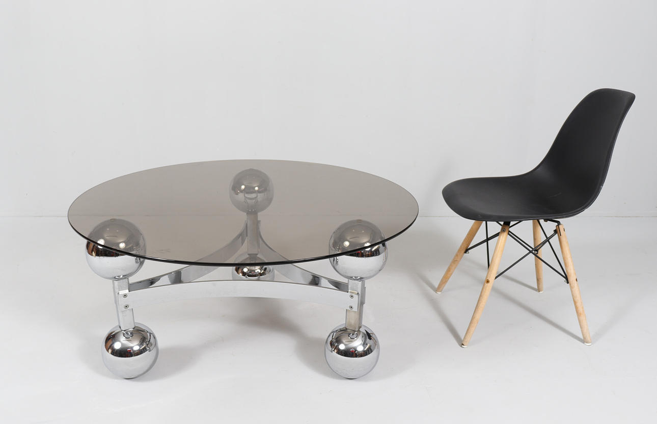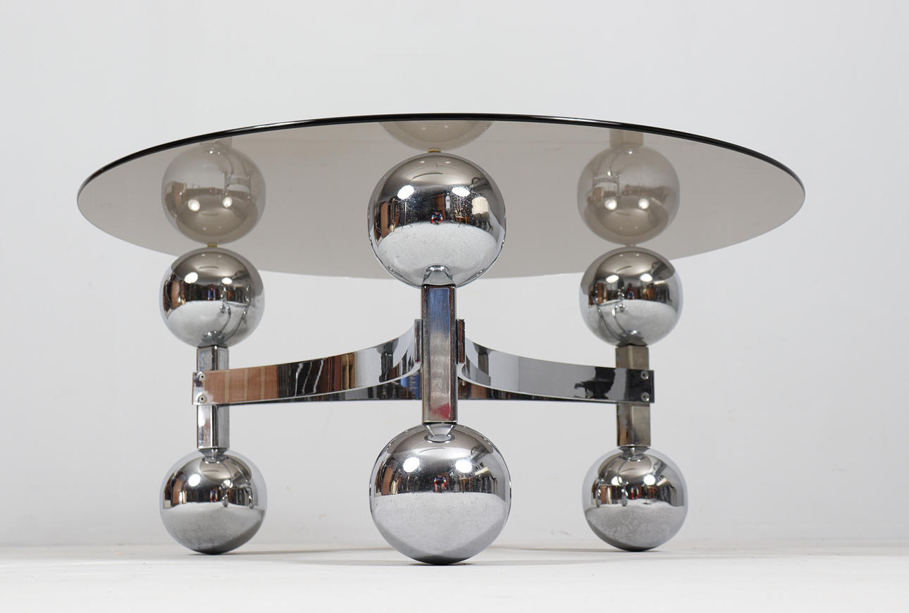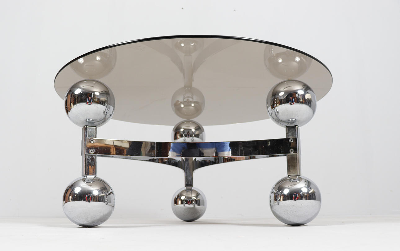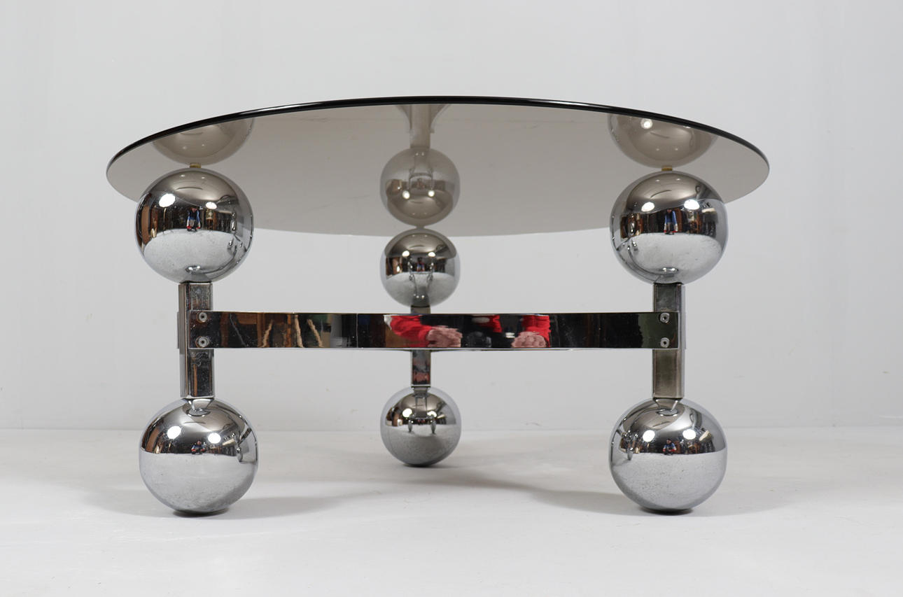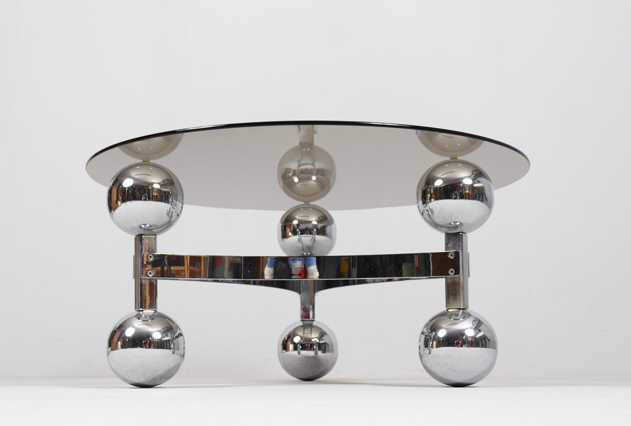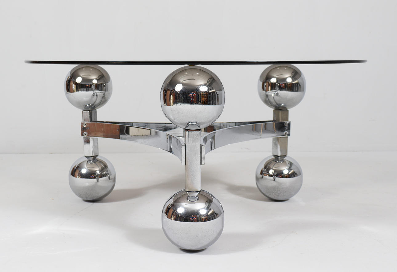 Space Age/Sputnik, coffee table, 1970s, construction of six chrome-plated metal balls, loose glass plate,