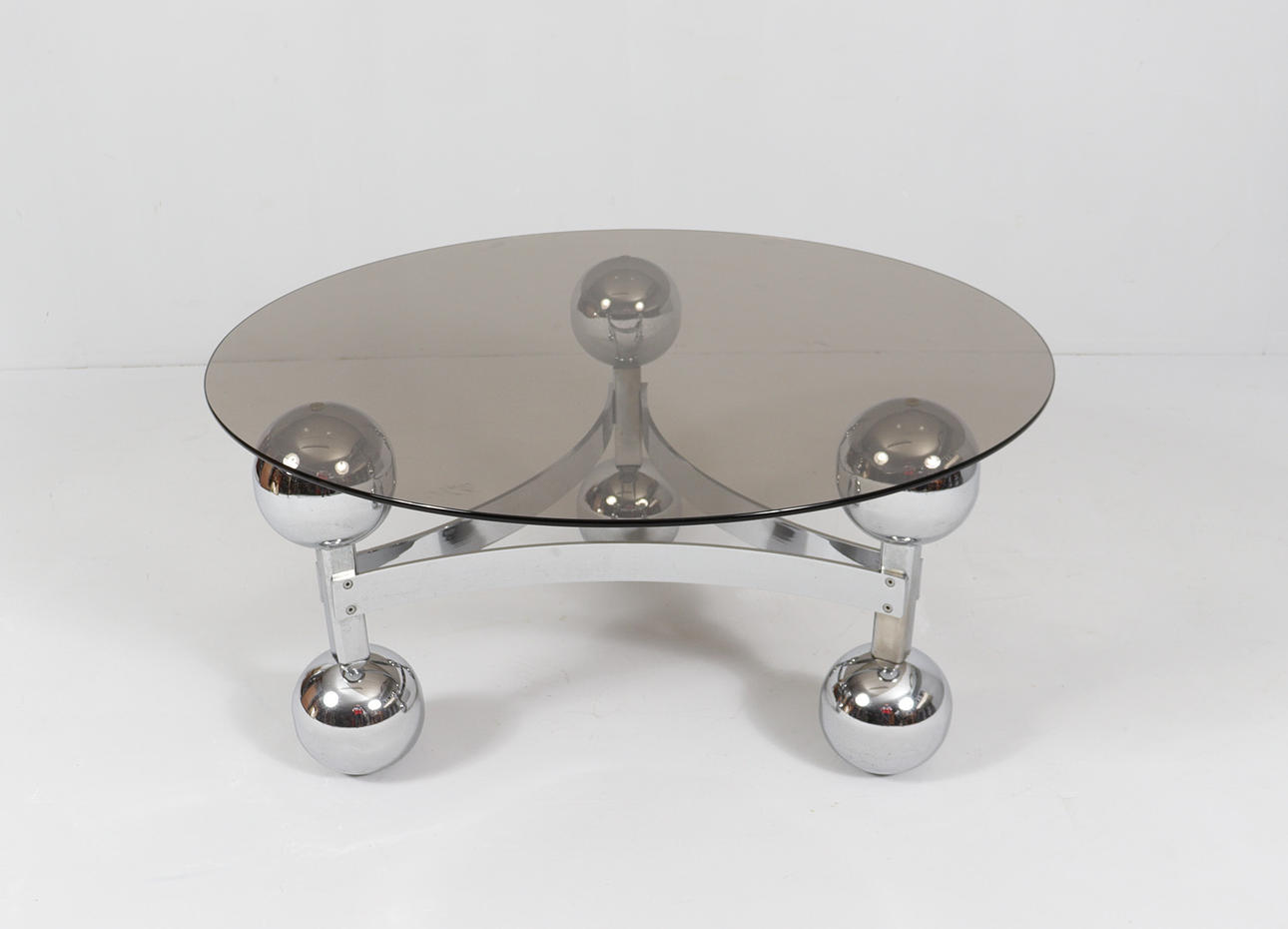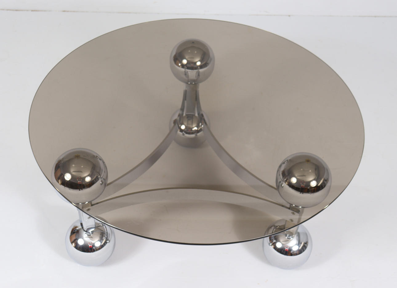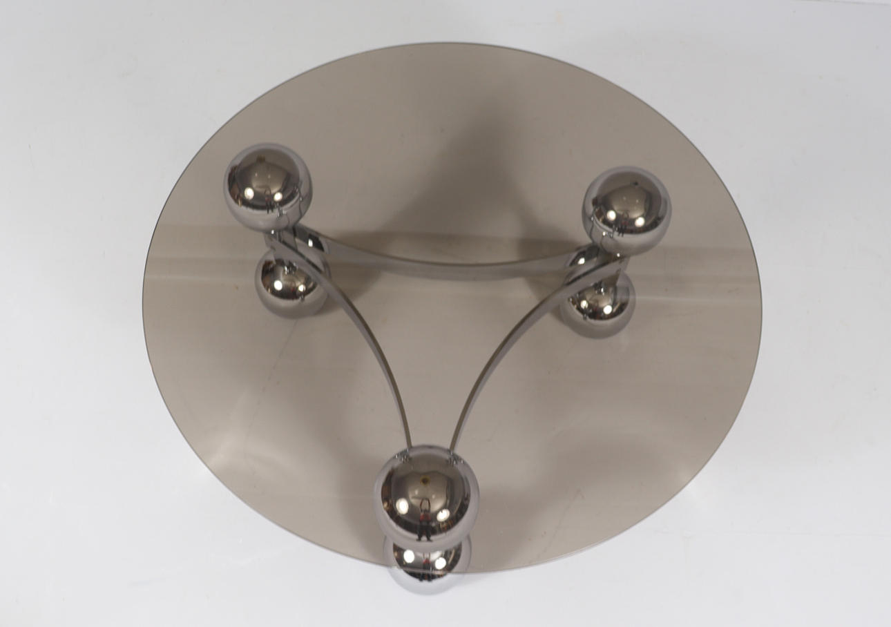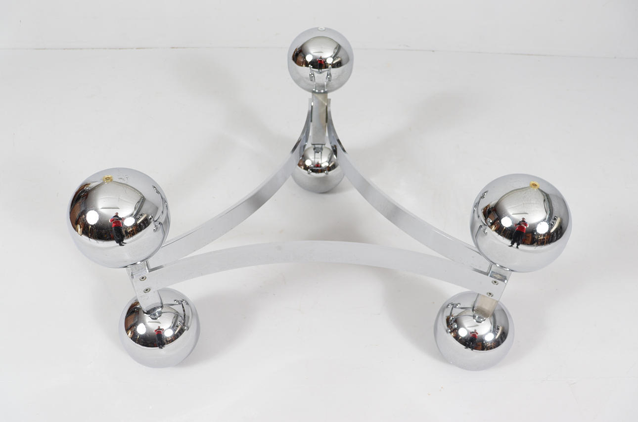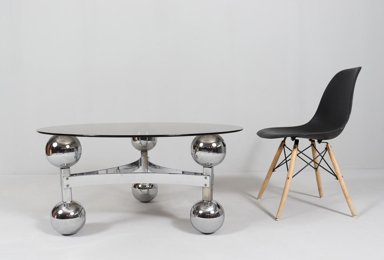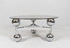Space Age/Sputnik, coffee table, 1970s, construction of six chrome-plated metal balls, loose glass plate,
