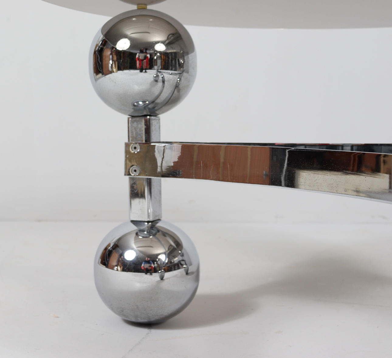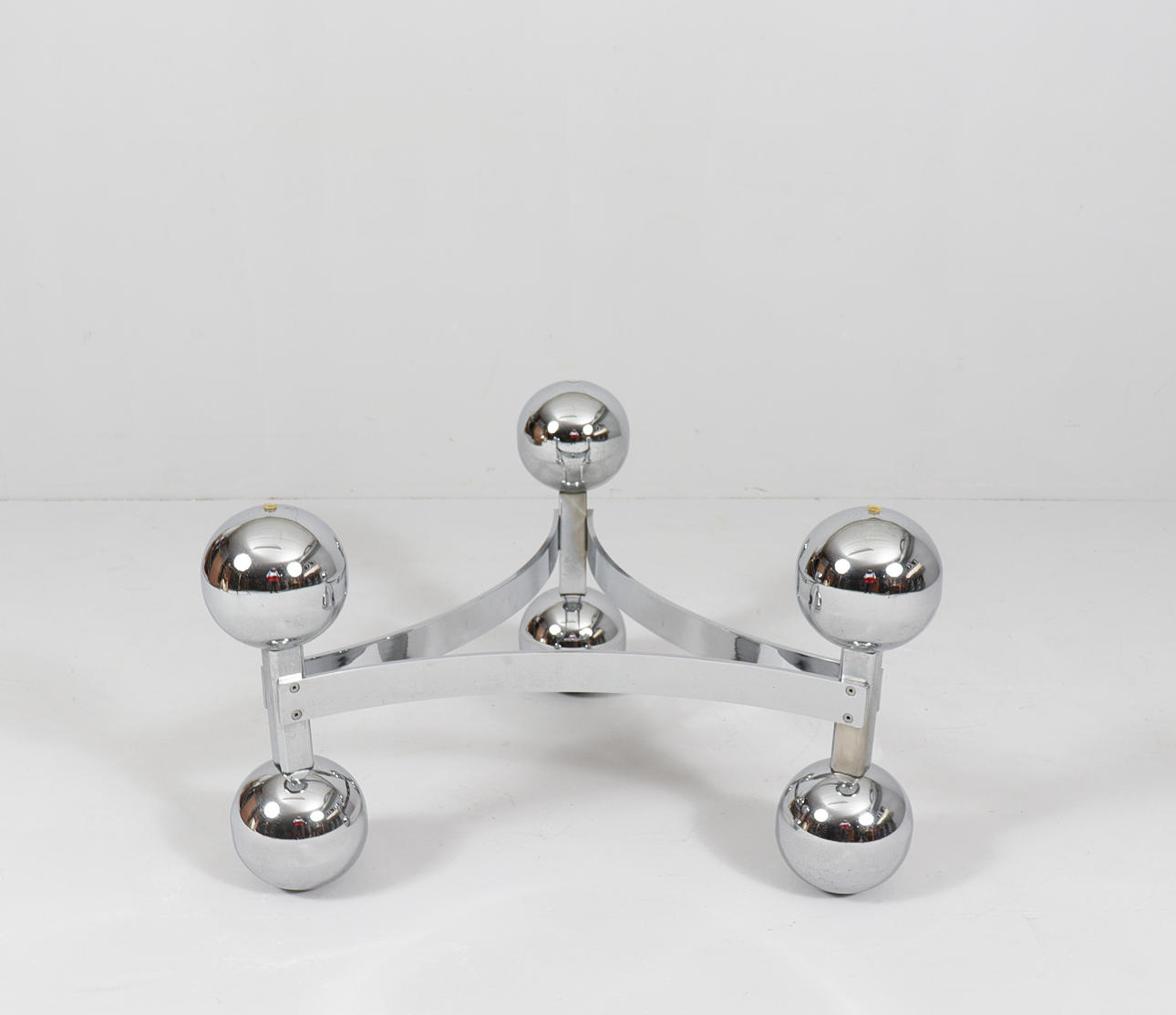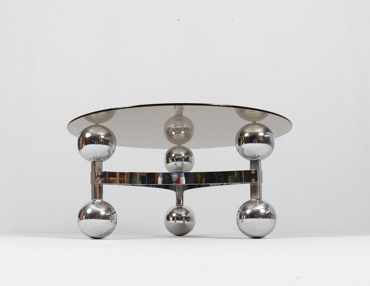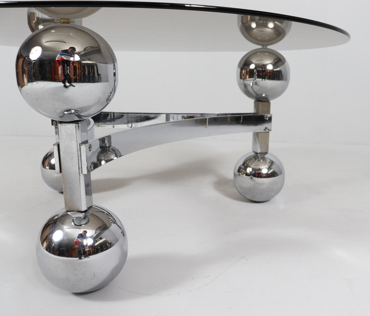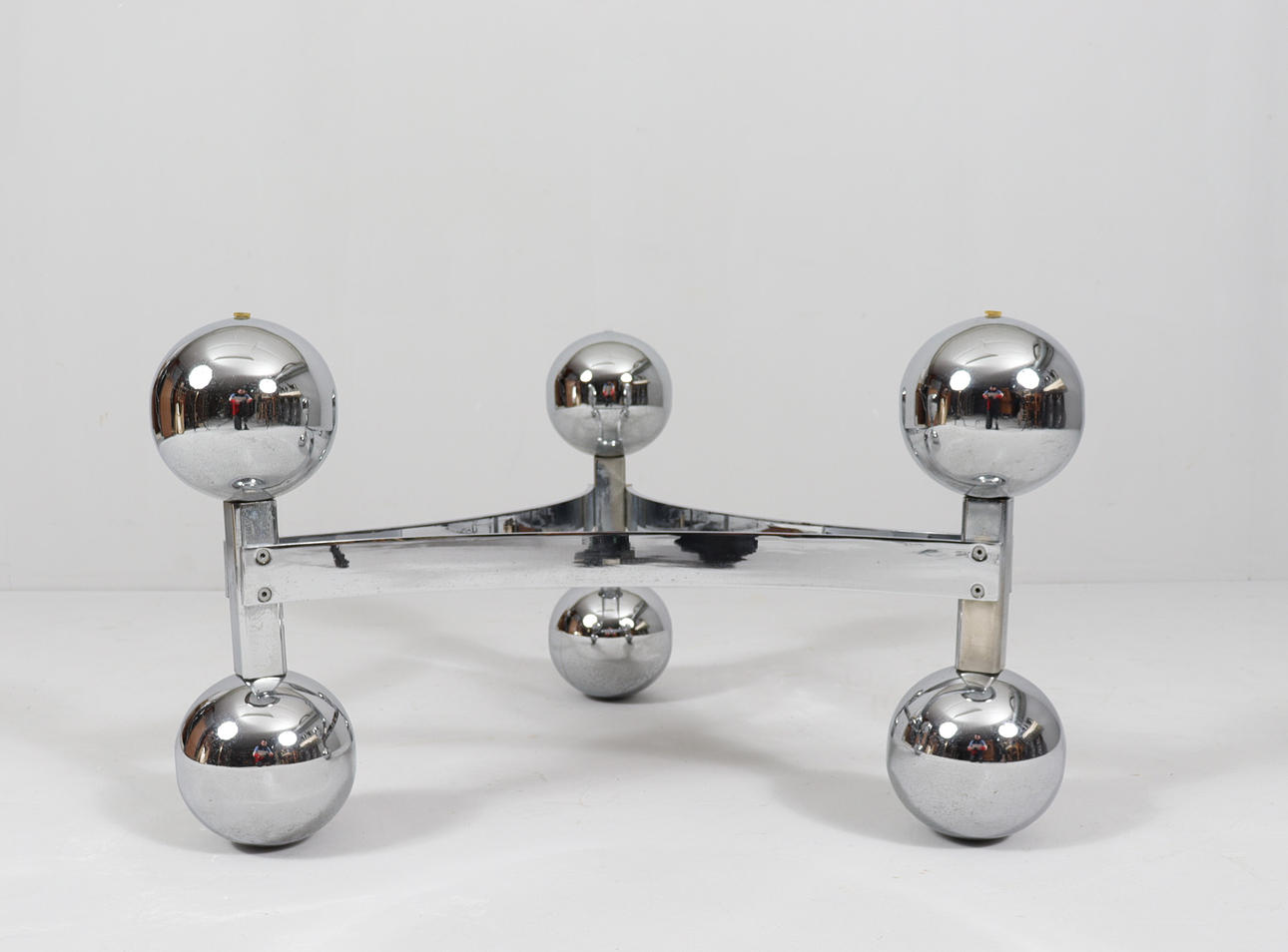 Space Age/Sputnik, coffee table, 1970s, construction of six chrome-plated metal balls, loose glass plate,