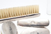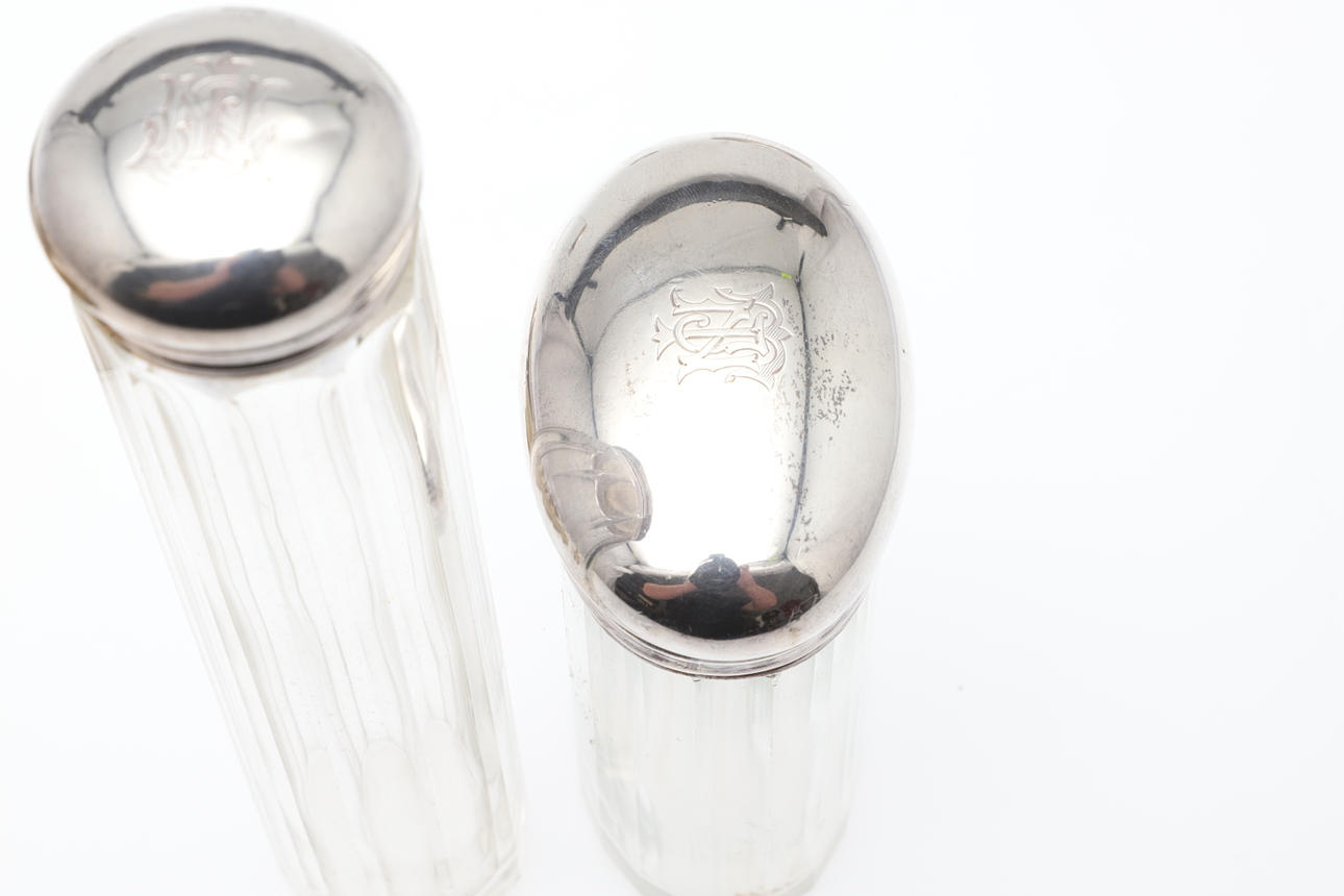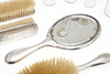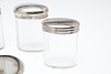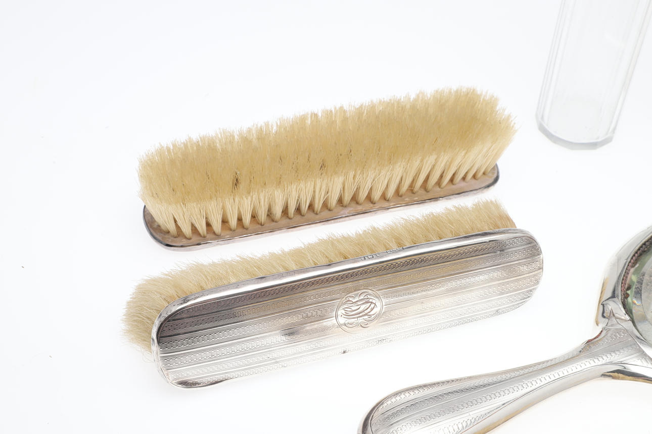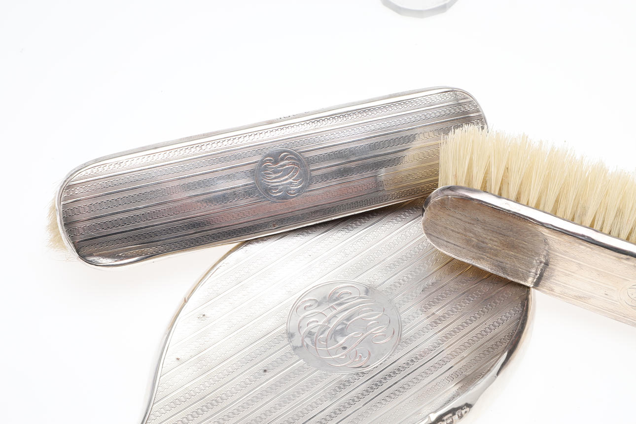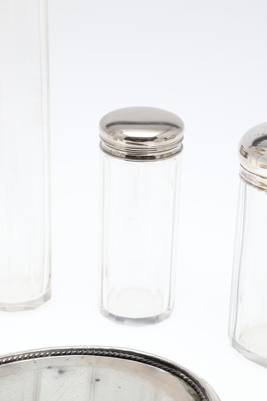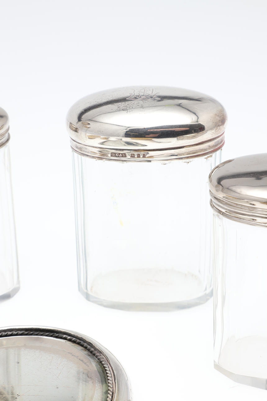 comprising, a silver backed hairbrush, silver backed mirror and two silver backed clothes brushed, three silver topped glass jars, tallest 17cm high, and a further jar with base metal lid, total weighable silver 54.24g (qty).