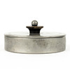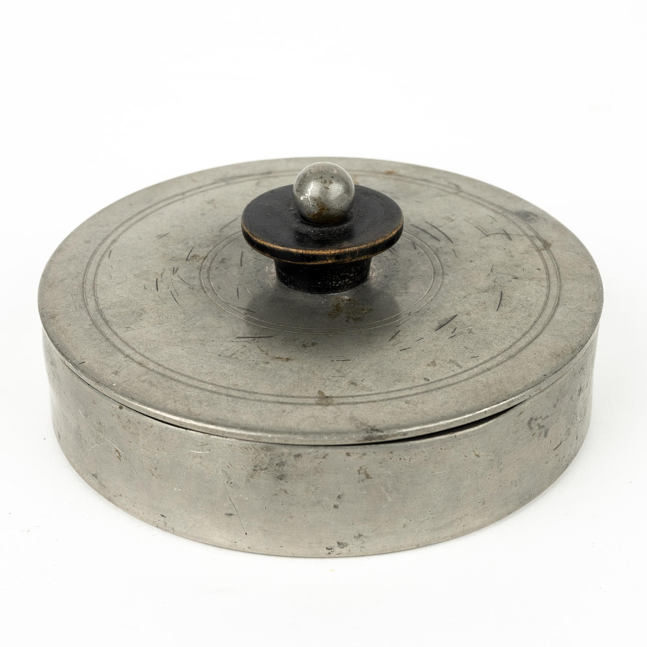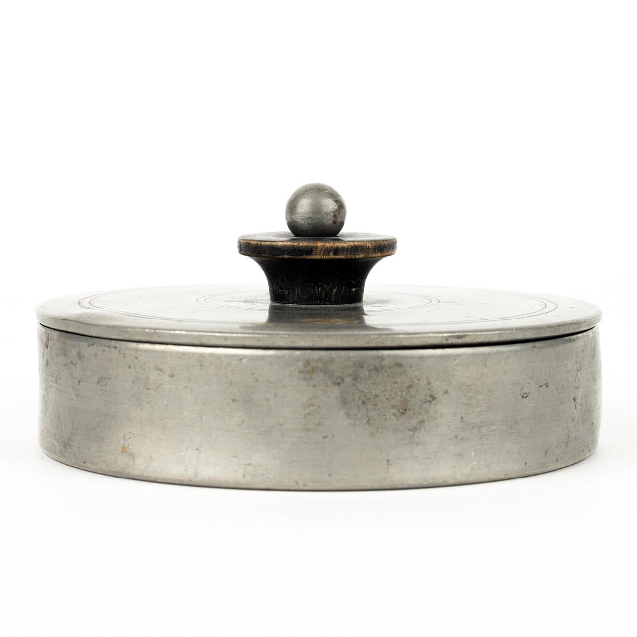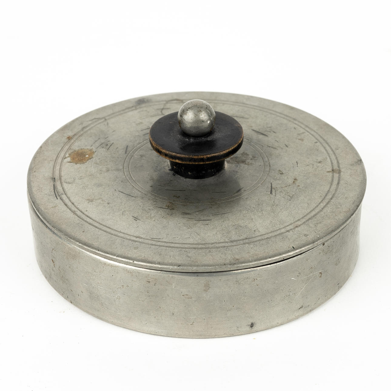 In the lid mirror, inside fabric covered. Bud partly of blackened wood. Diameter 11.5, height incl bud 5.5 cm.