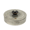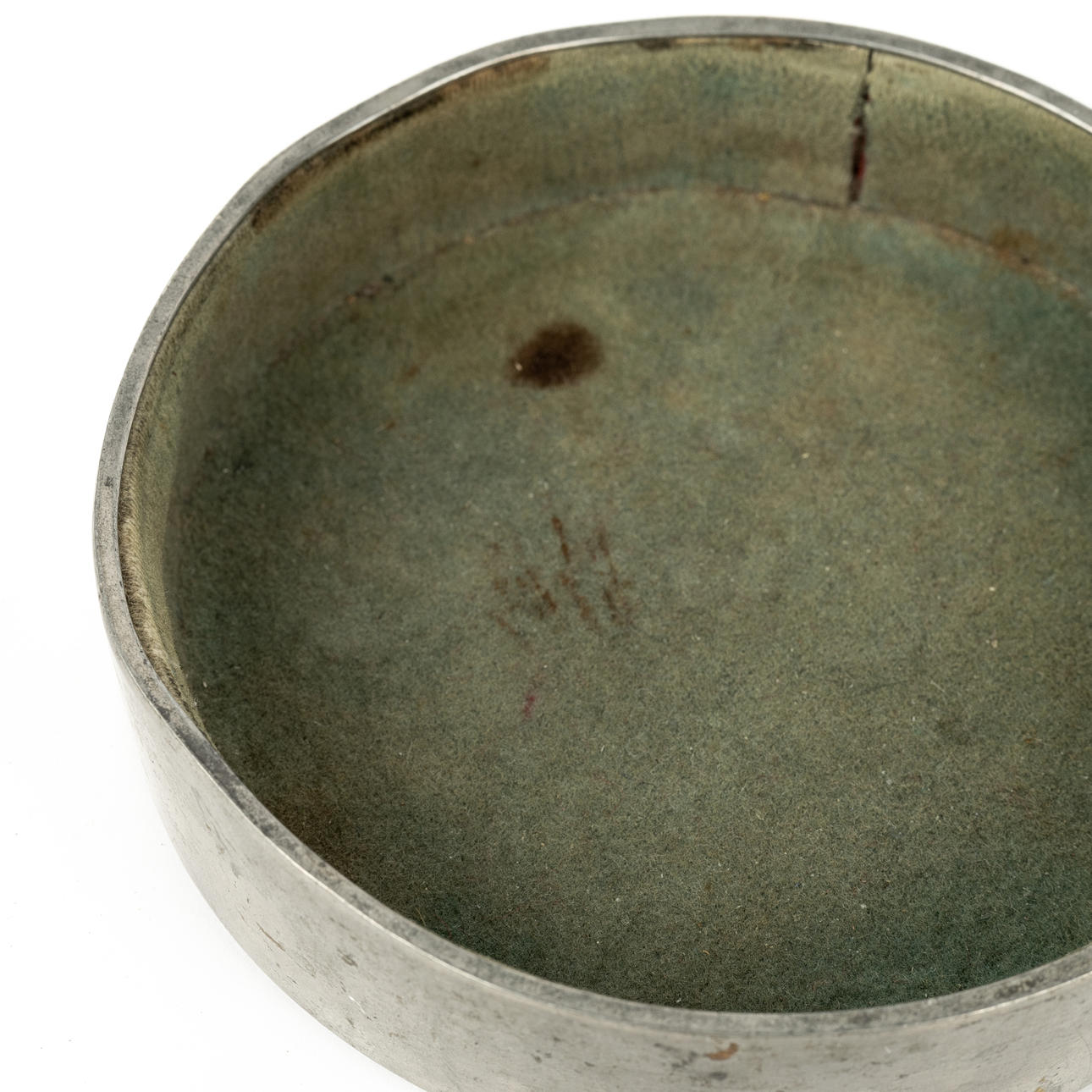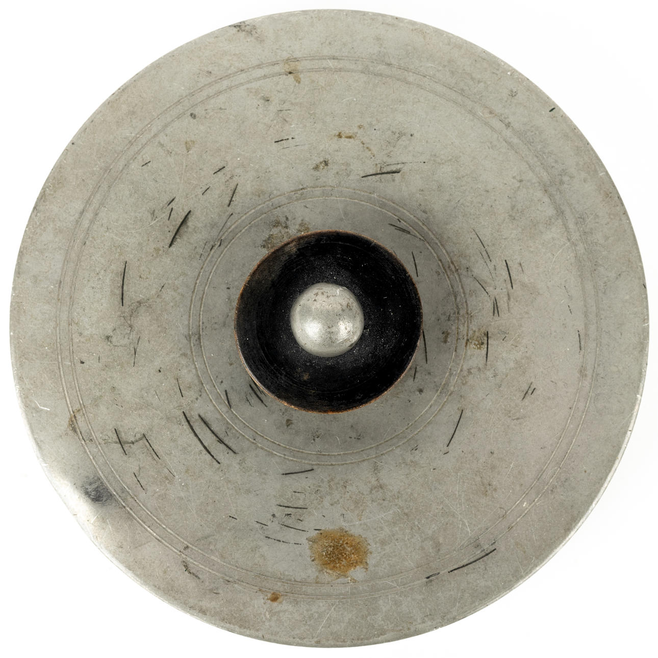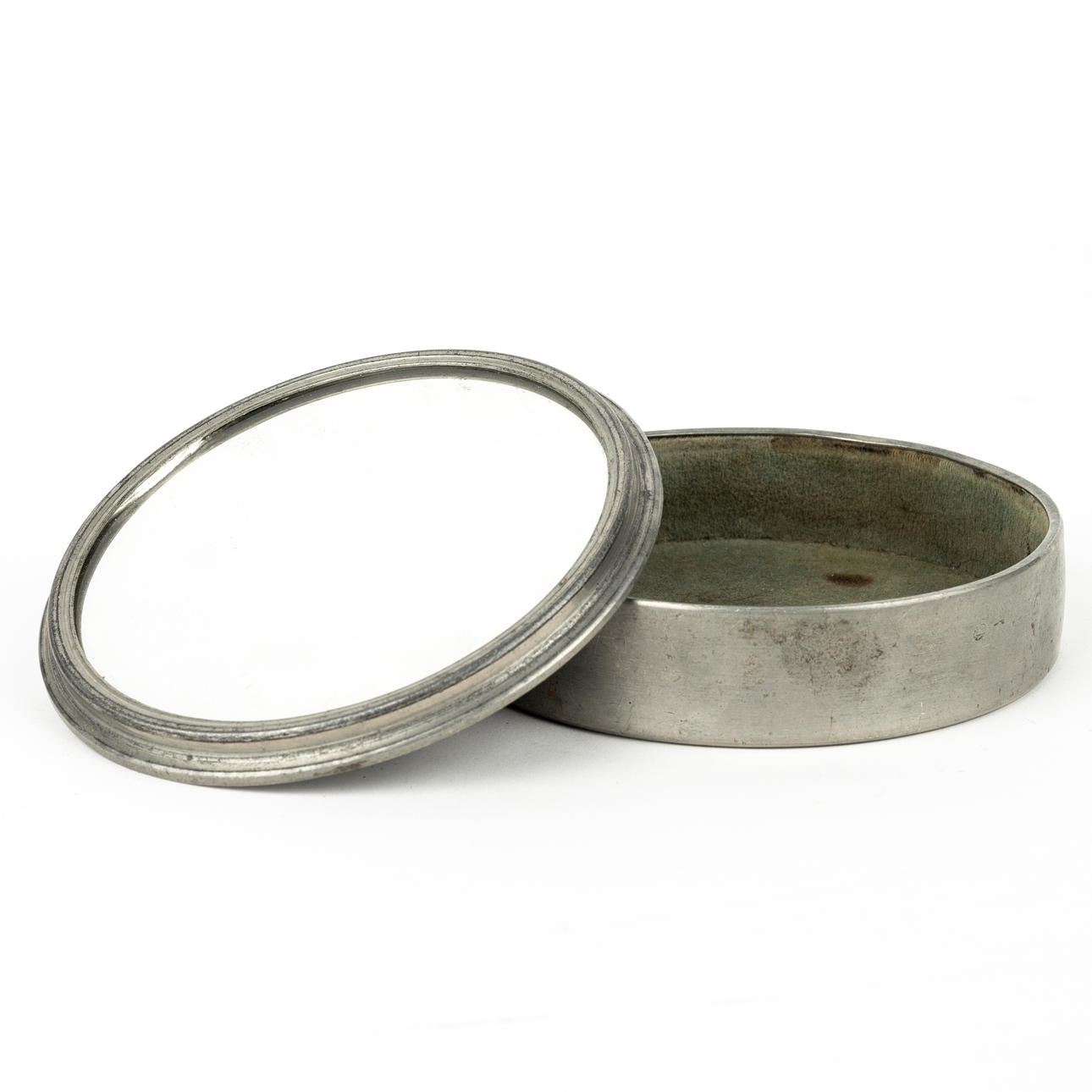 In the lid mirror, inside fabric covered. Bud partly of blackened wood. Diameter 11.5, height incl bud 5.5 cm.