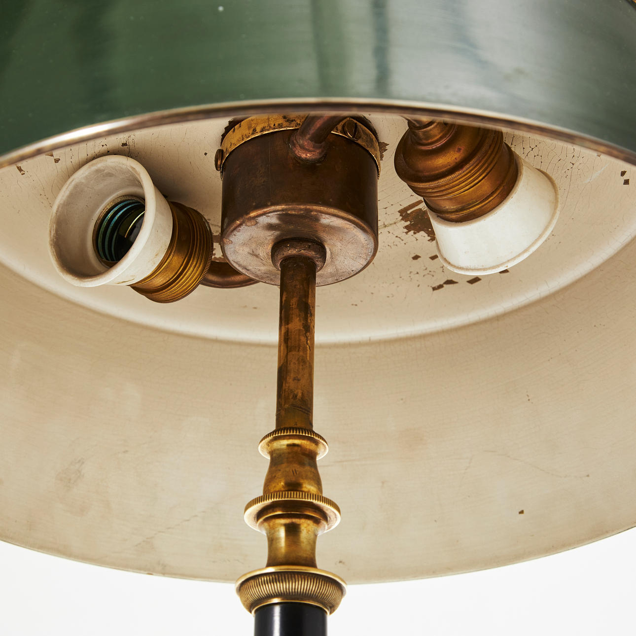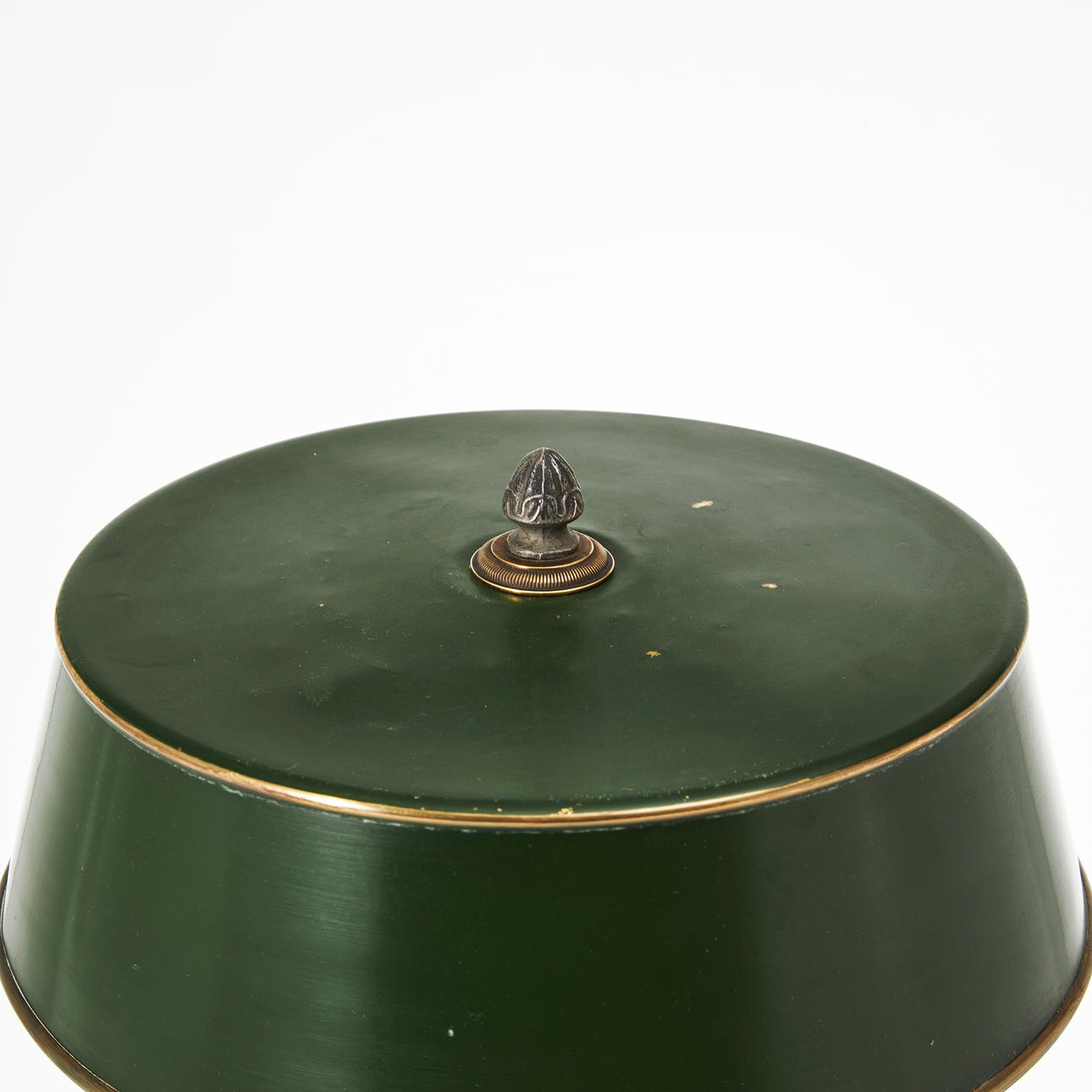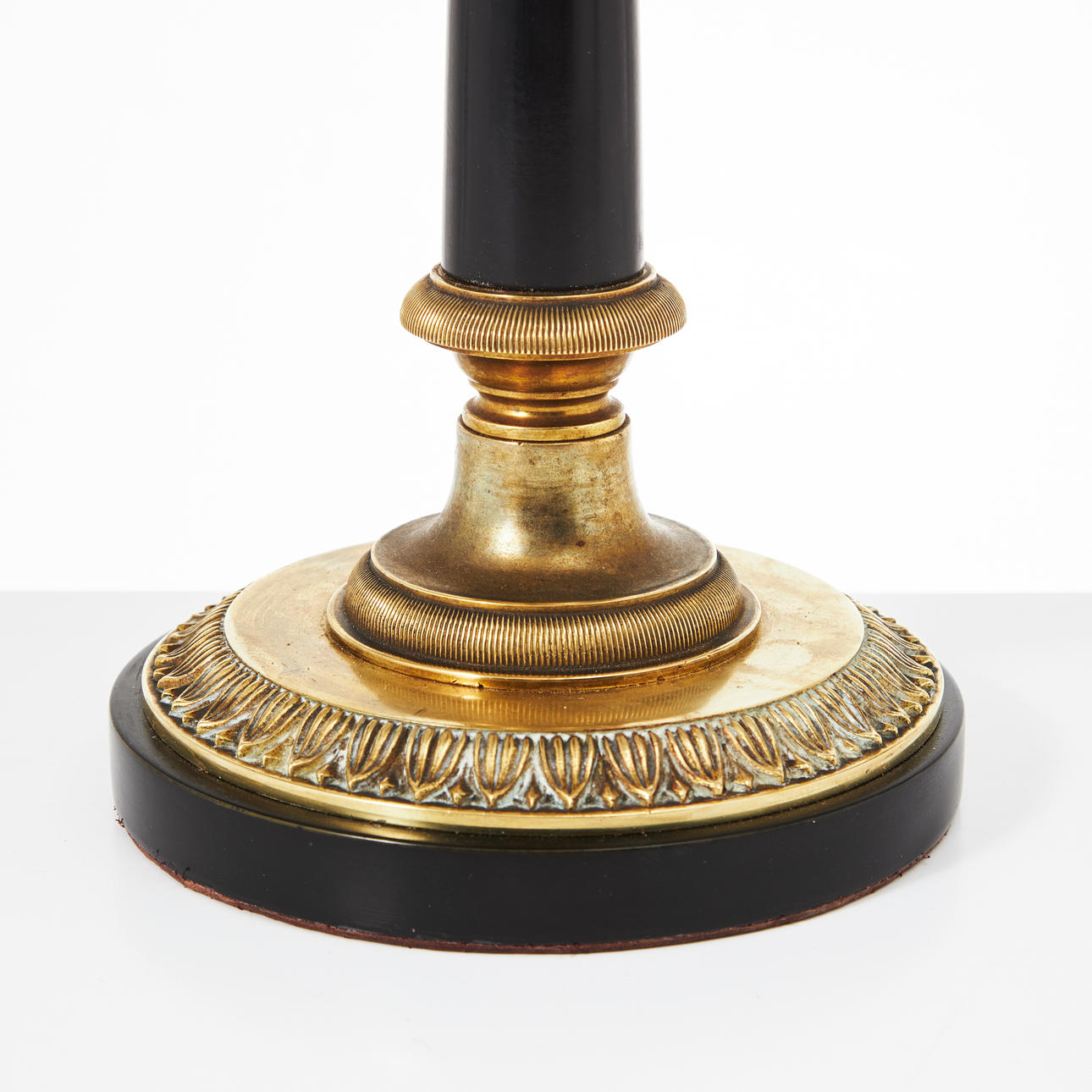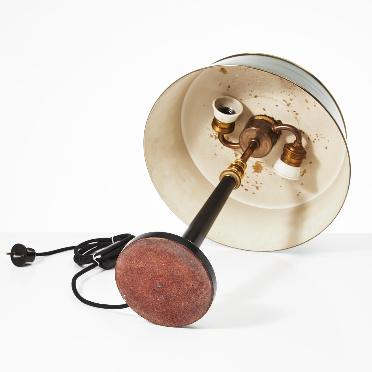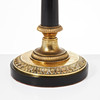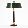 Round base in blackened wood and brass with grooves and moulded leaf decor, blackened and upwardly tapered pillar, screen in green lacquered sheet with closing knob, interior for two light points, height approx. 53 cm, screen diameter approx. 34 cm.