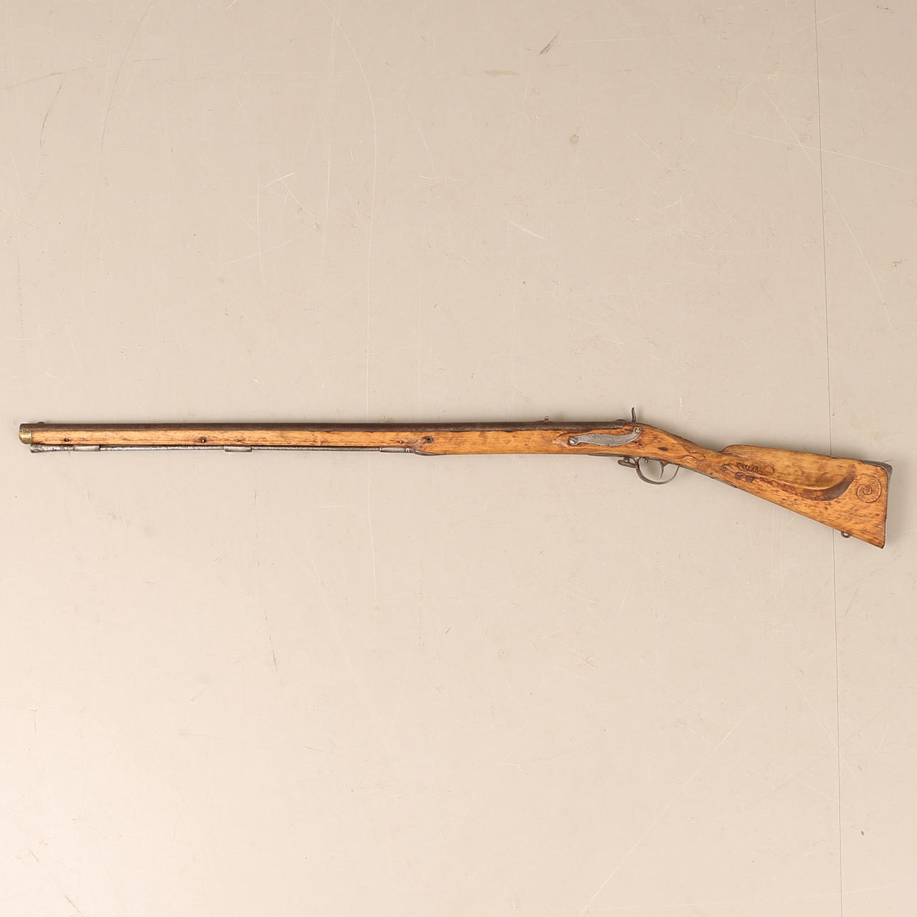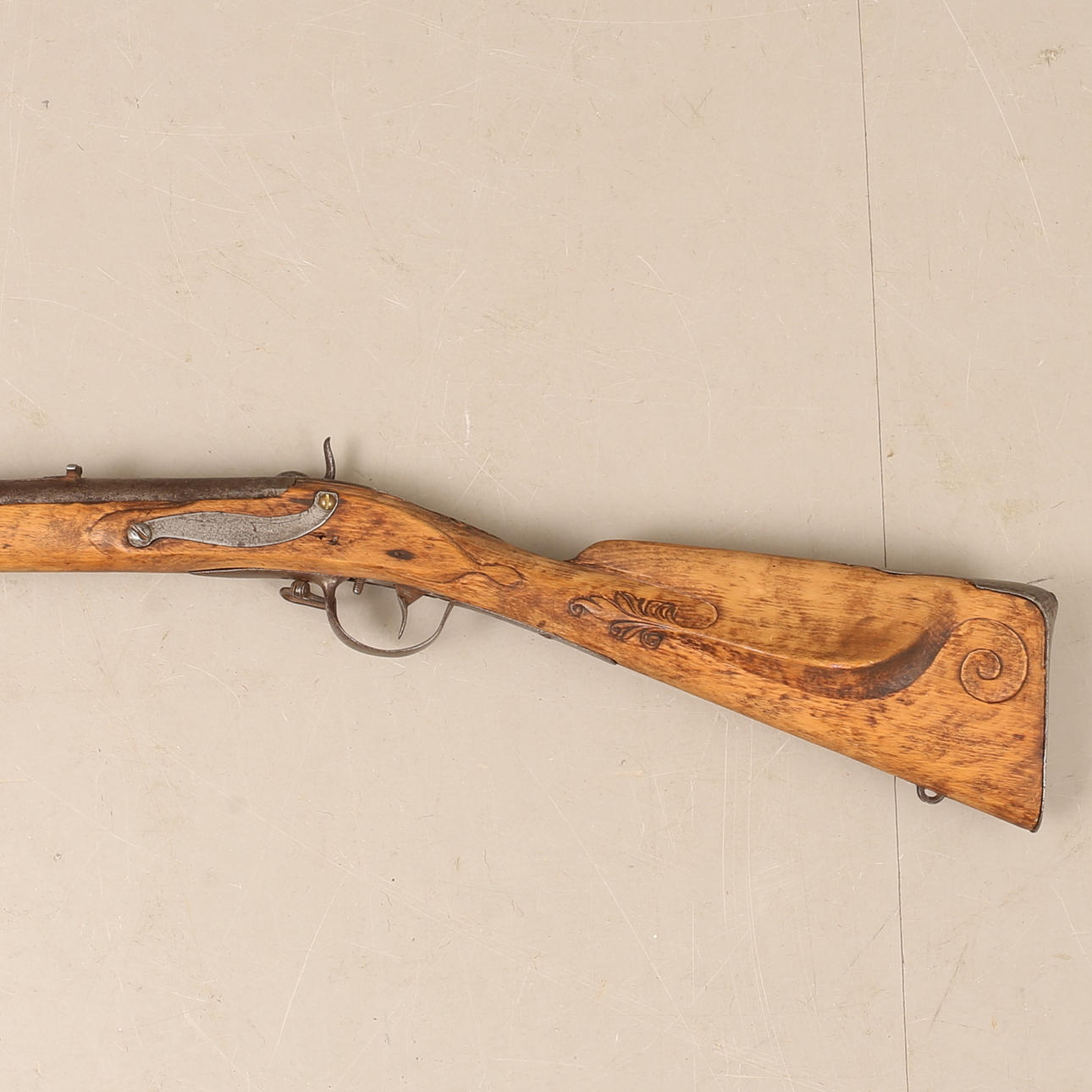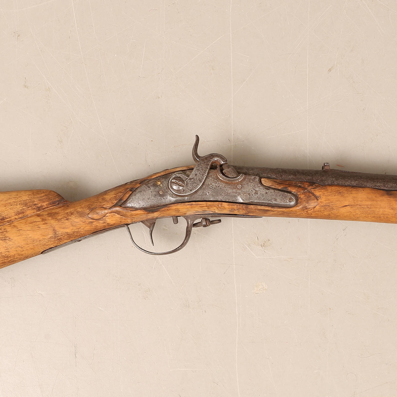 Clasp box, converted from flint locks in the middle of the 19th century. Flask in carved birch. Working lock. Length about 122 cm, caliber about 19 mm.