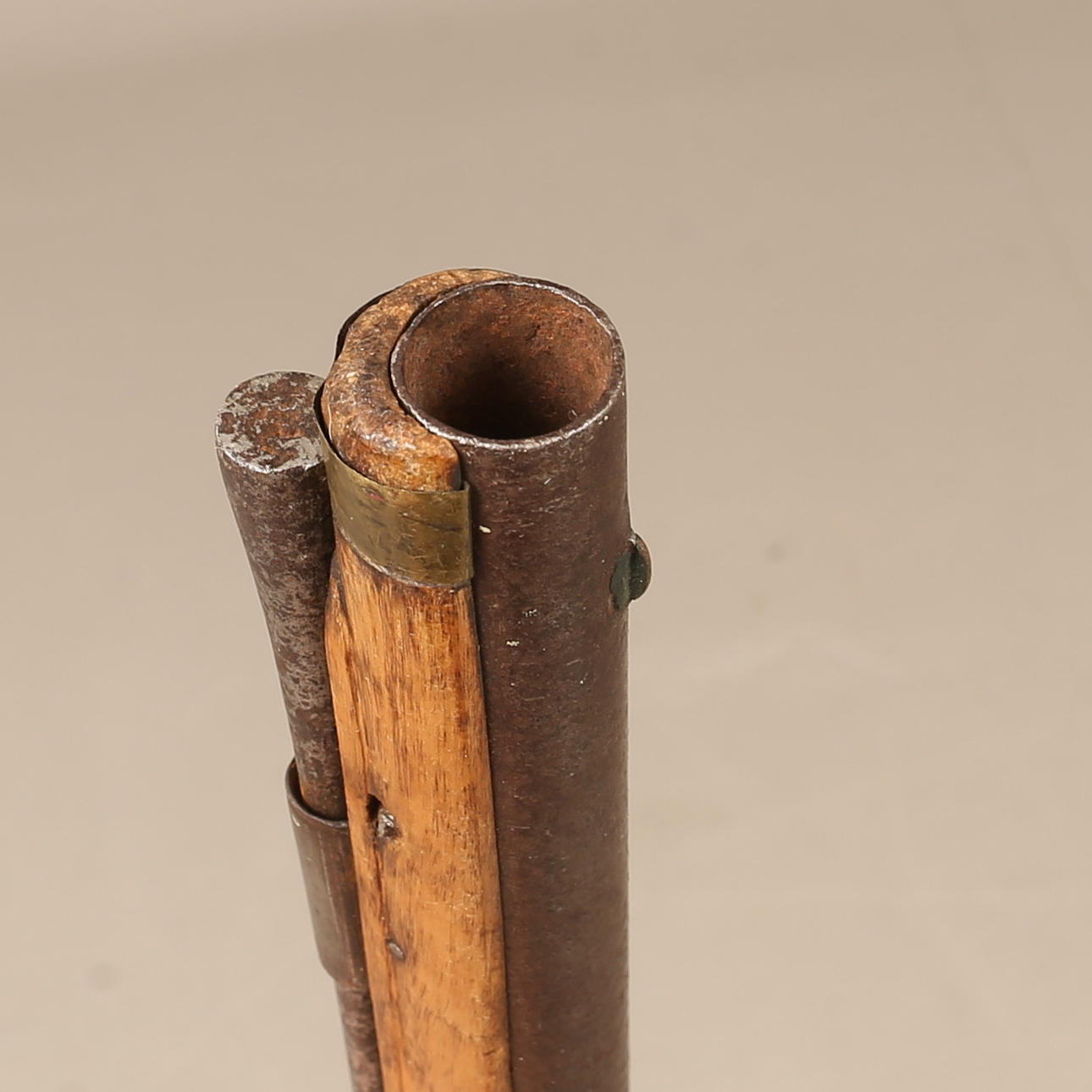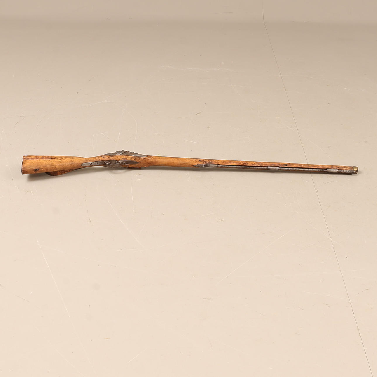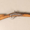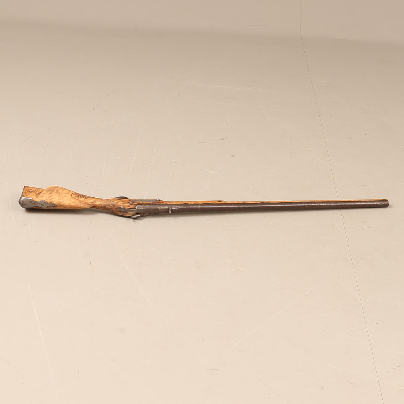Clasp box, converted from flint locks in the middle of the 19th century. Flask in carved birch. Working lock. Length about 122 cm, caliber about 19 mm.