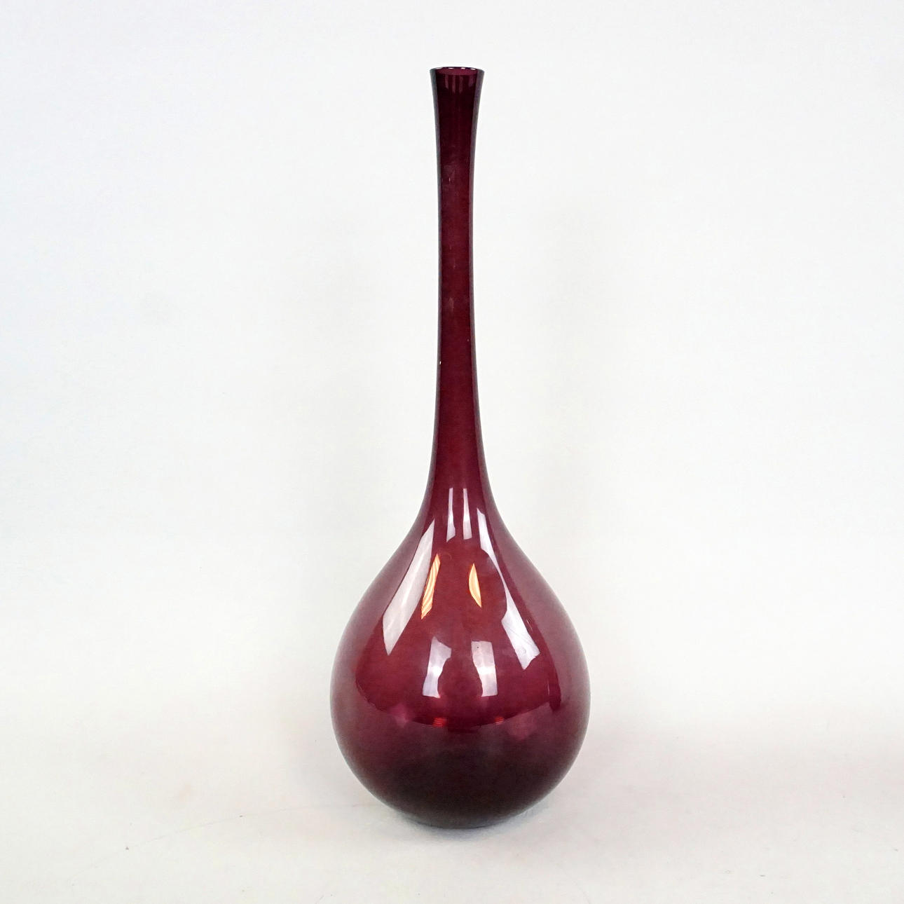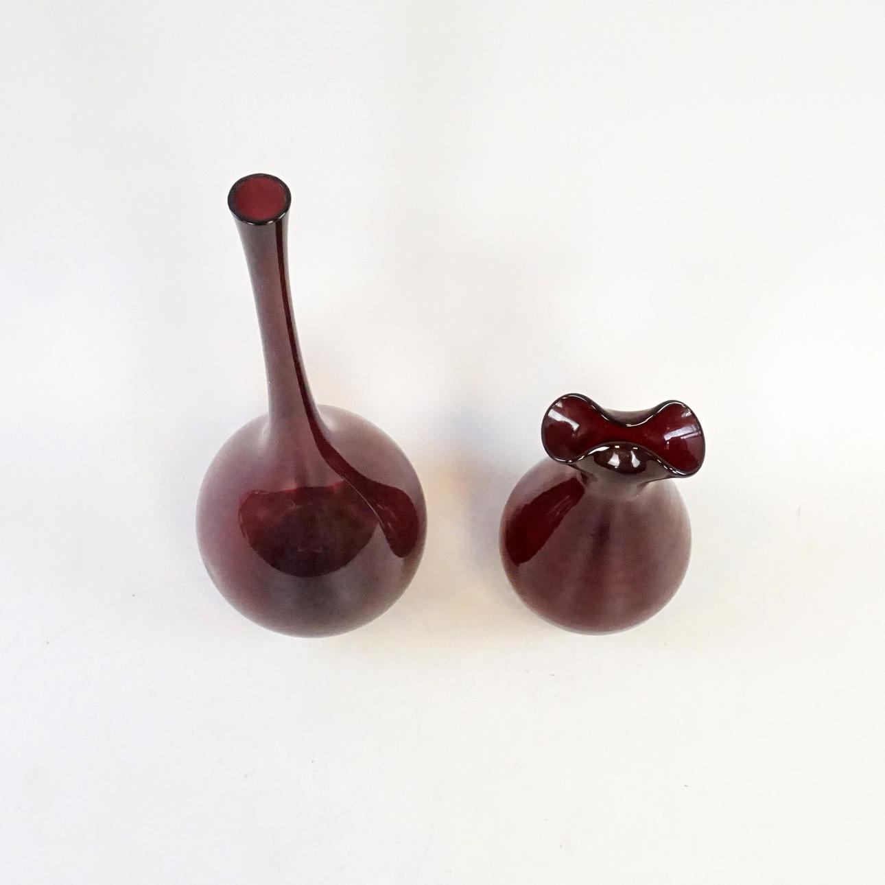 A bulb vase in burgundy glass mass, height approx. 32 cm. A vase with folded mouth in burgundy glass mass, height approx. 17 cm.