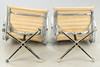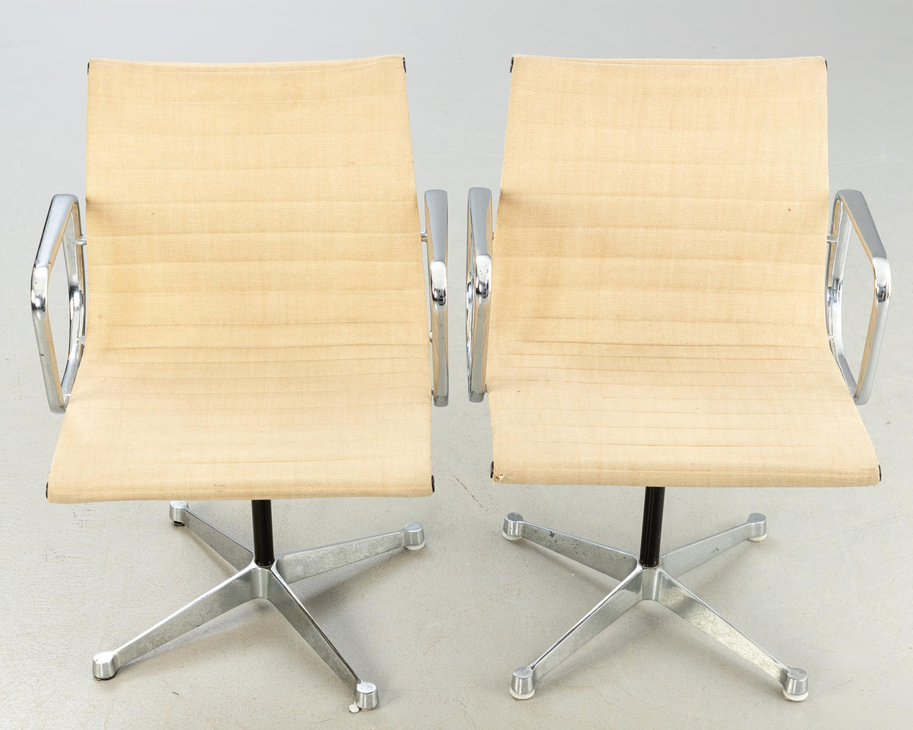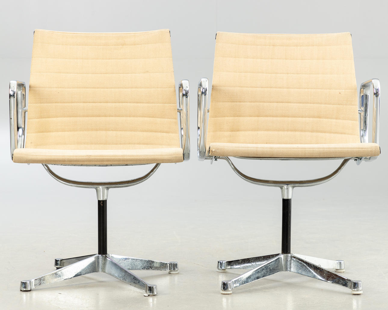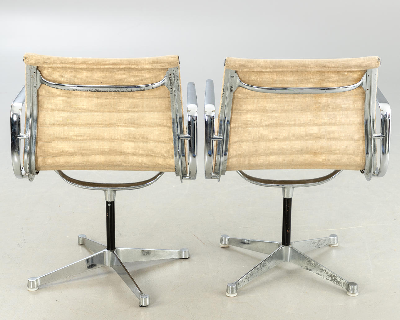 Design: 1958. Not rotatable. Armrests and base made of die-cast aluminum, chrome-plated. Beige hopsak cover Each inscribed on the underside.