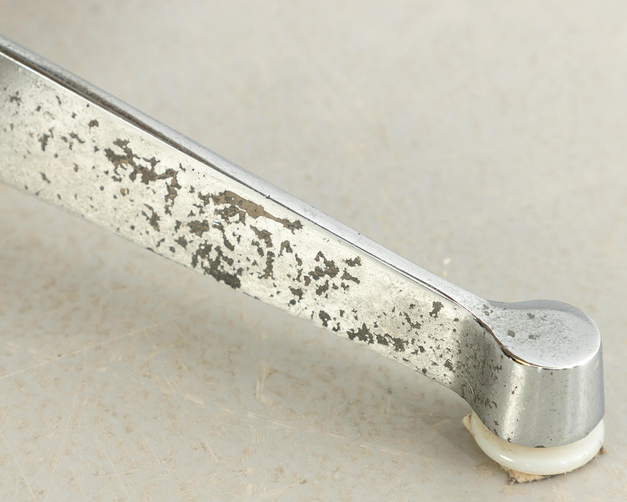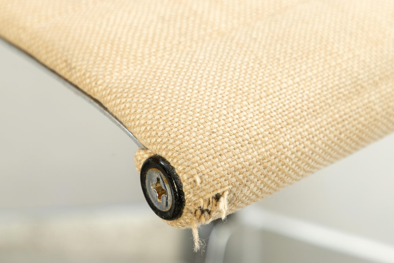Severe signs of wear, fabric partly rubbed around the edges. Chrome plating with chipping and rust.