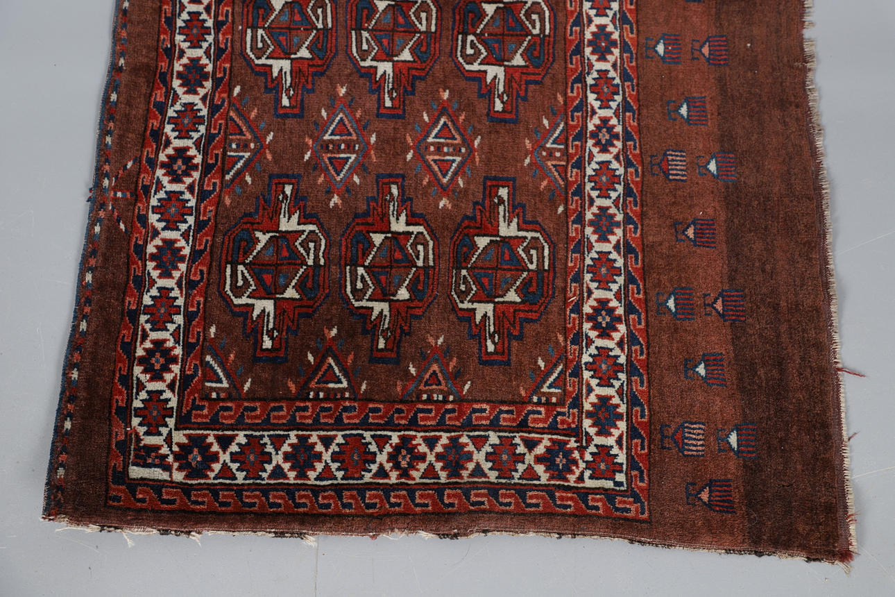 the pale chocolate field with nine quartered guls enclosed by ivory borders, the elem with geometric devices, 112 x 72cm.