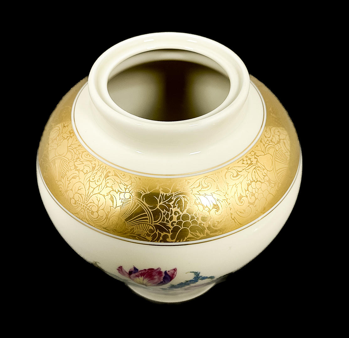 Lid urn with bouquet decoration, gilded on urn and lid. Height incl. cover about 32 cm.