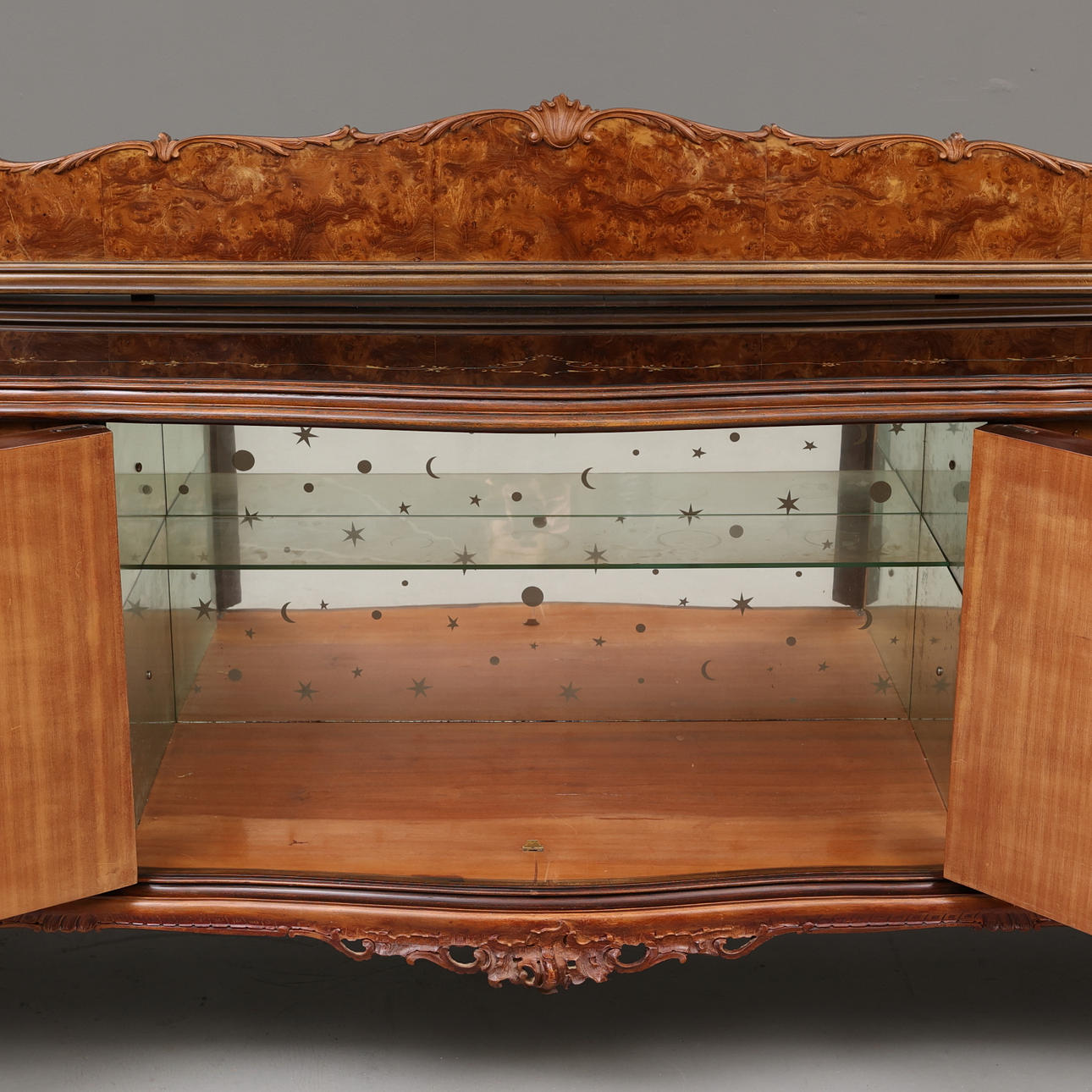 Side cabinet with shelving, central bar cabinet with mirror decor and glass shelves.