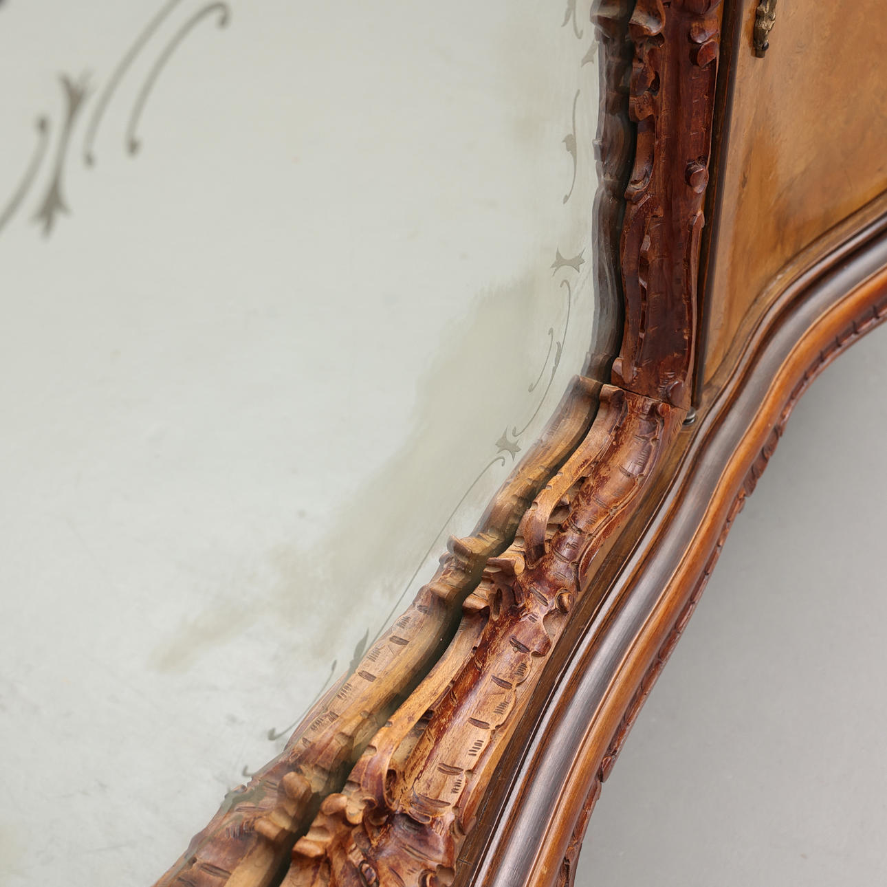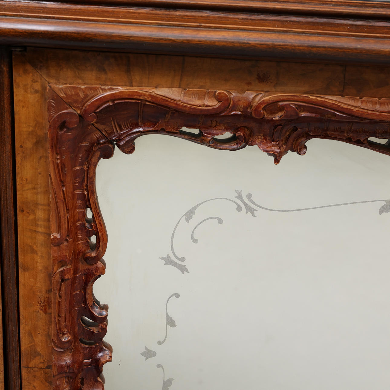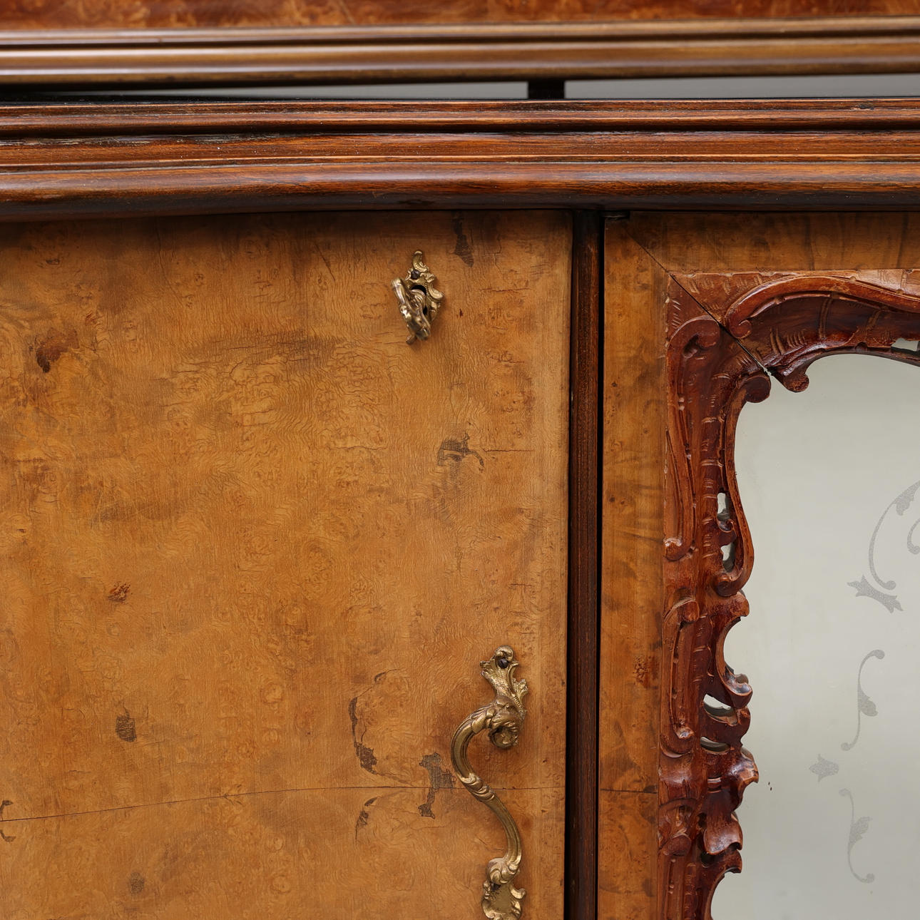 Sideboard/sideboard, among other things, in root veneer, with wood carved decoration and glass front doors with etched decor. Top in decorative stained glass, fittings in yellow metal.
