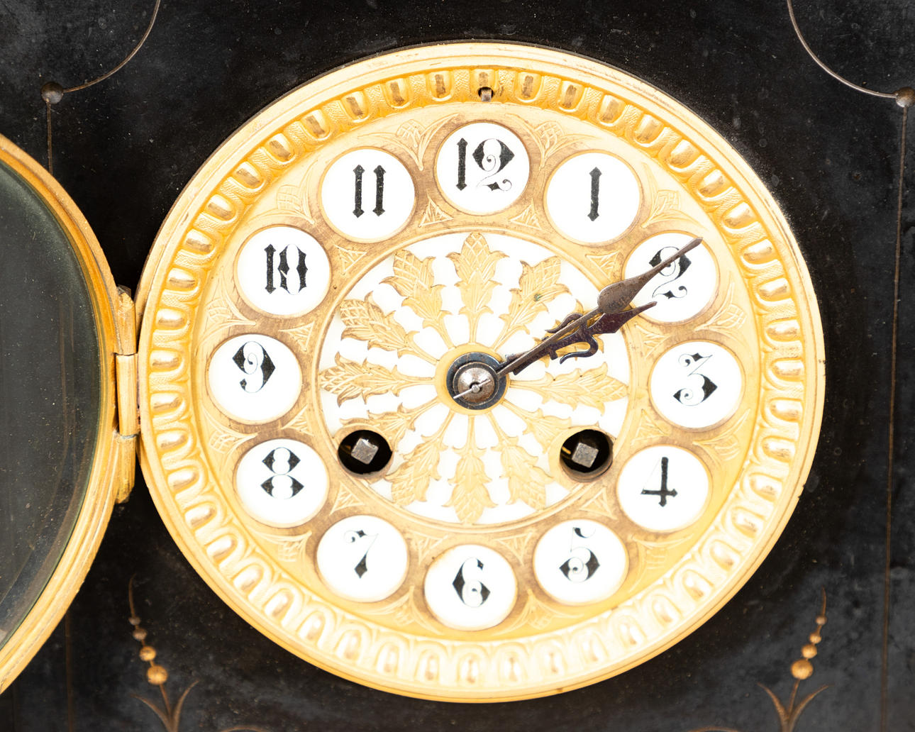 Black stone, engraved and hewn with gold bronze/brass, gilded. Rectangular base plate with grooved edge. The highly rectangular watch case is flanked by cambered and C-swing decorative elements. Circulating egg stick on the bezel. On the ivory-colored dial with Arabic indices, brass plate with open breakthrough decorations. Pendulum with key lift and half-hour bell. HxWxD: approx. 38.5 x 45 x 14 cm.