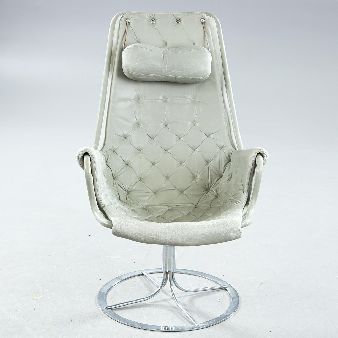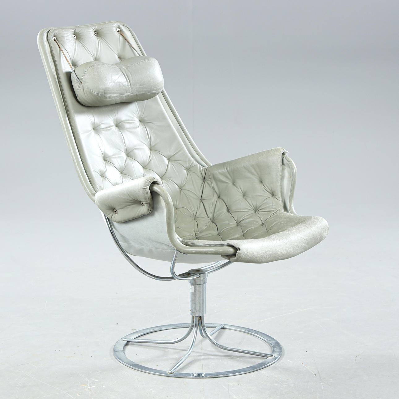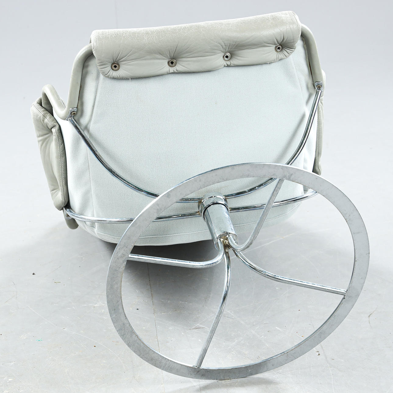 Leather upholstery, chromed leg stand with swivel function, label marked, seat height approx. 43 cm.