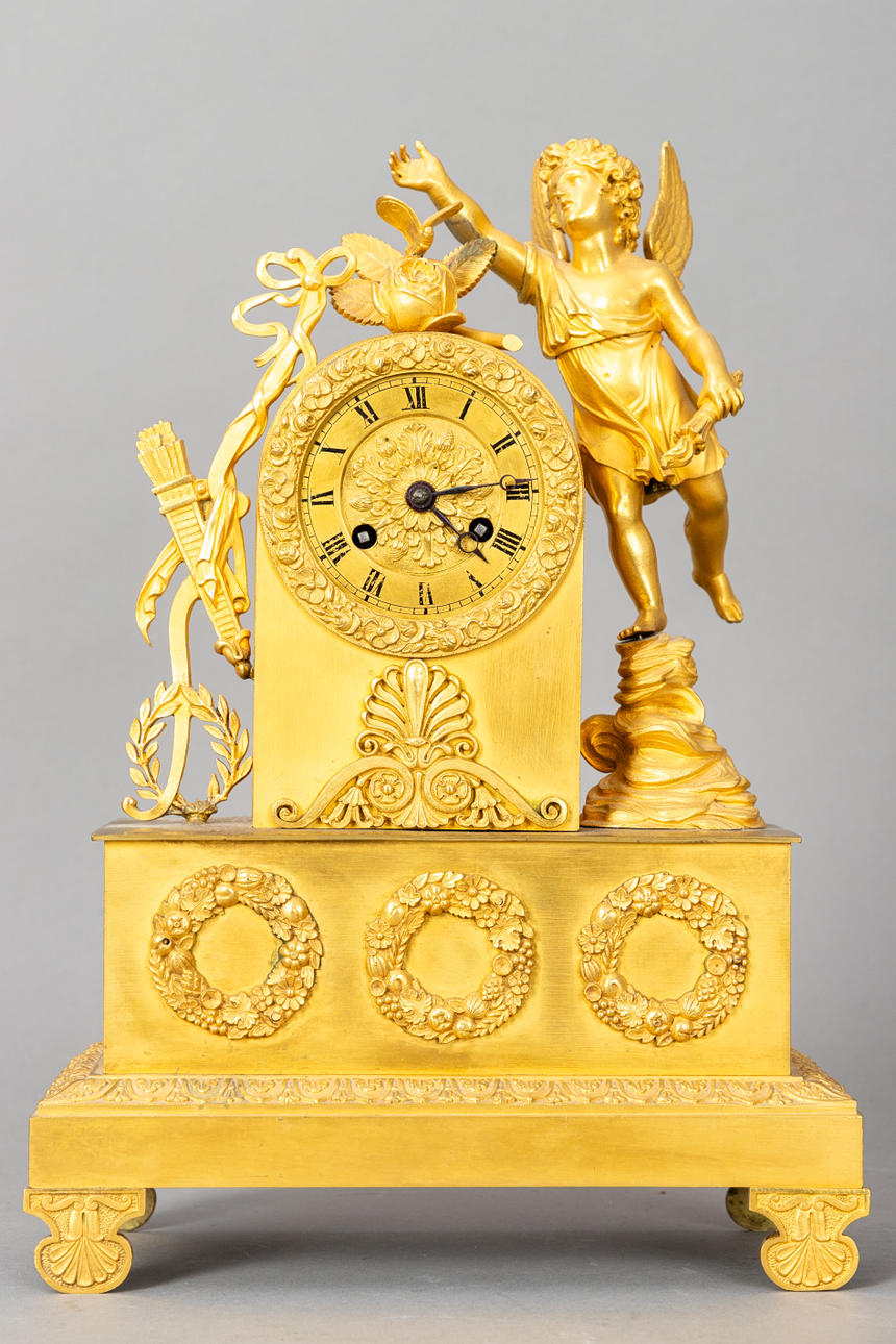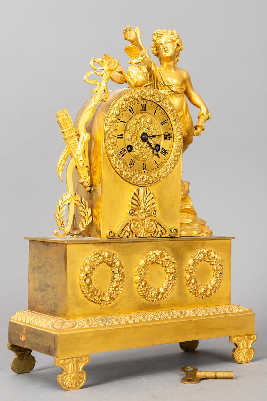 Fire-gilded brass. Rectangular, single-tiered base with surrounding leaf frieze on palmettes. Flower wreaths applied on the front. Rectangular watch case finished in a segmental arch and flanked by the plastic fifur of floating Cupid. Opposite Schleifenwerk with an arrow quiver and laurel wreath. Dial ring as a flower wreath. Dial ring with black Roman indices. Pendulum with key lift and half-hour bell. HxWxD: 35 x 24 x 9.5 cm.