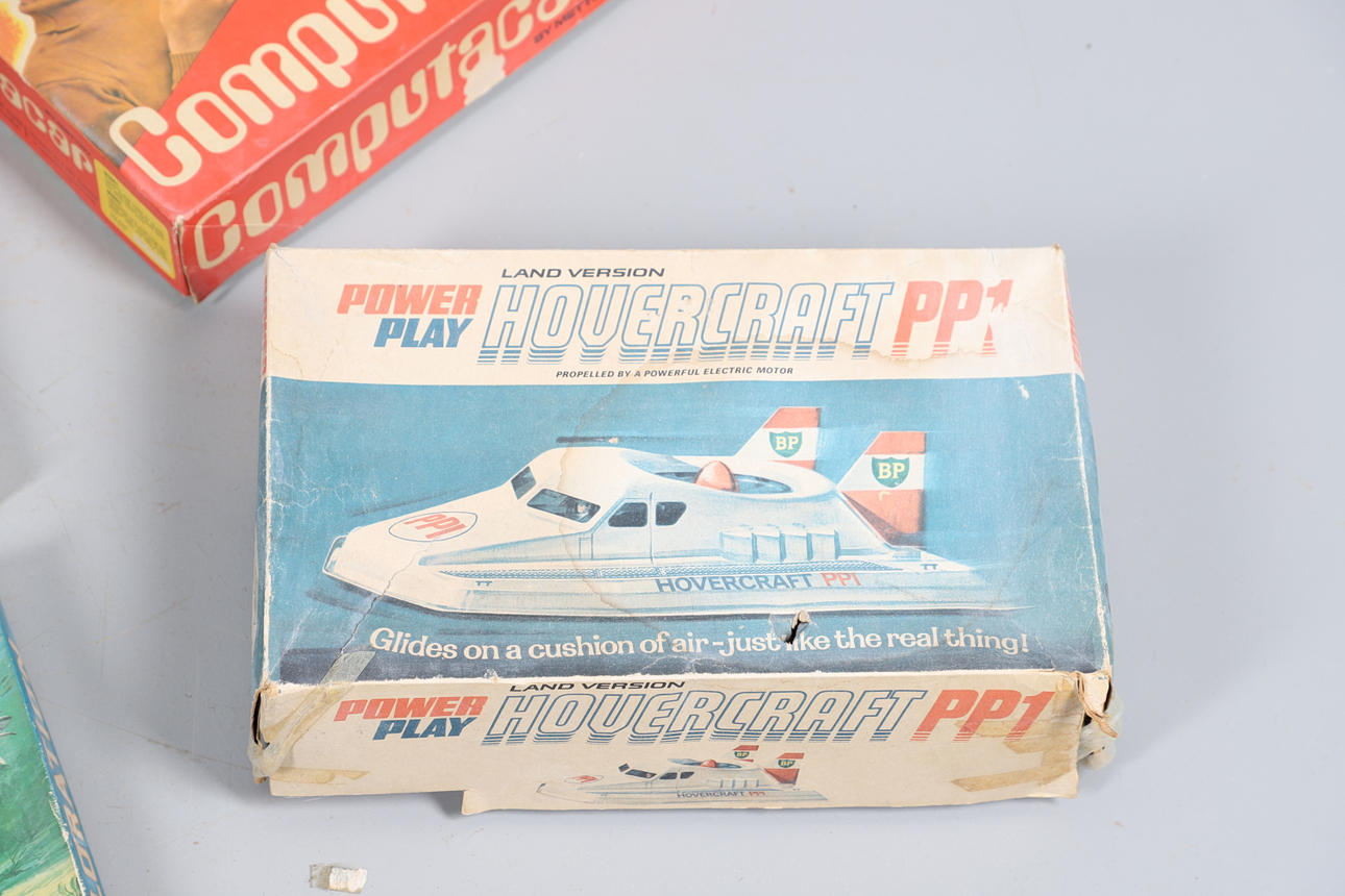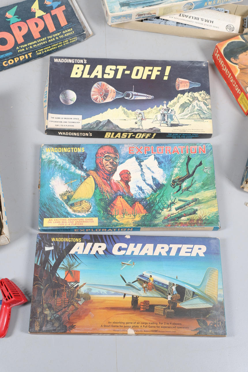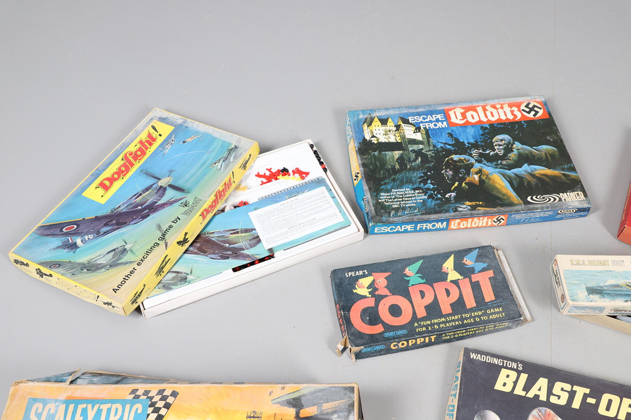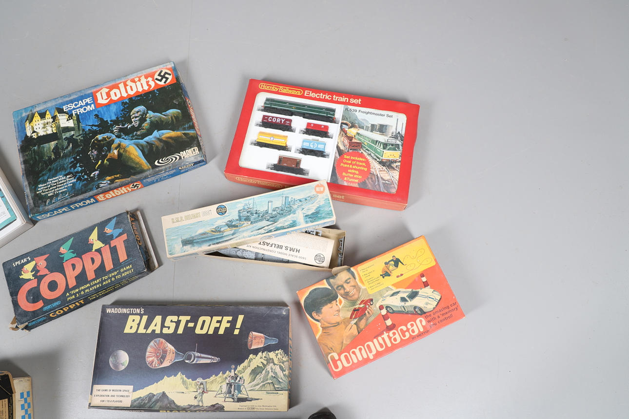 A boxed R539 Feightmaster train set, a Scalextric boxed set, and boxed vintage games including Computacar, Blast Off, Exploration, Escape from Colditz, and various others.
