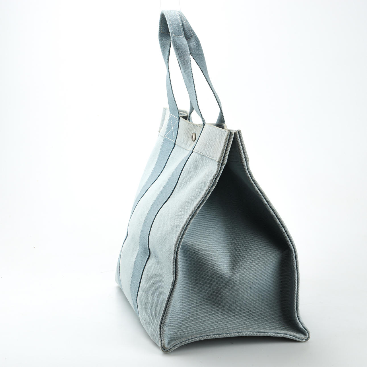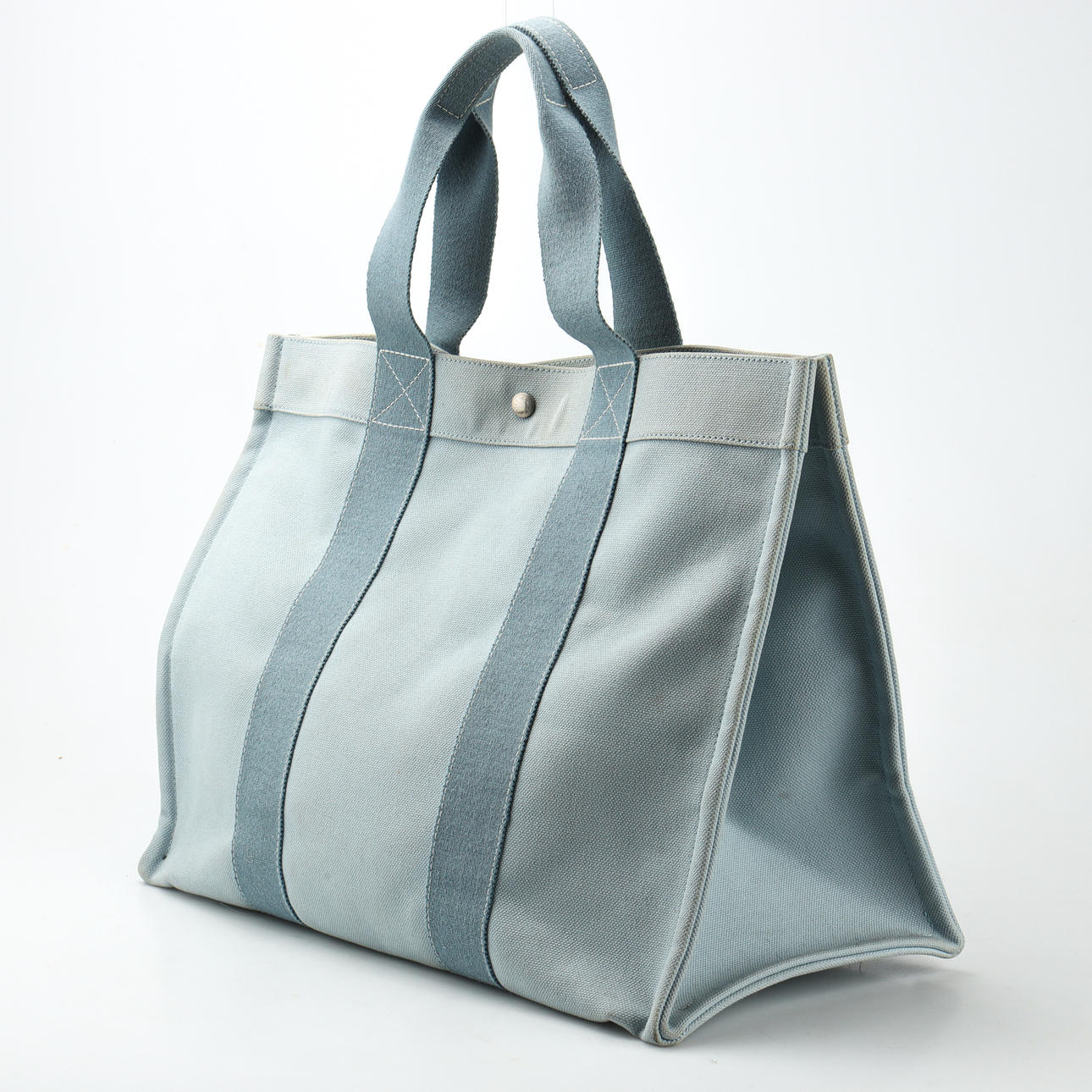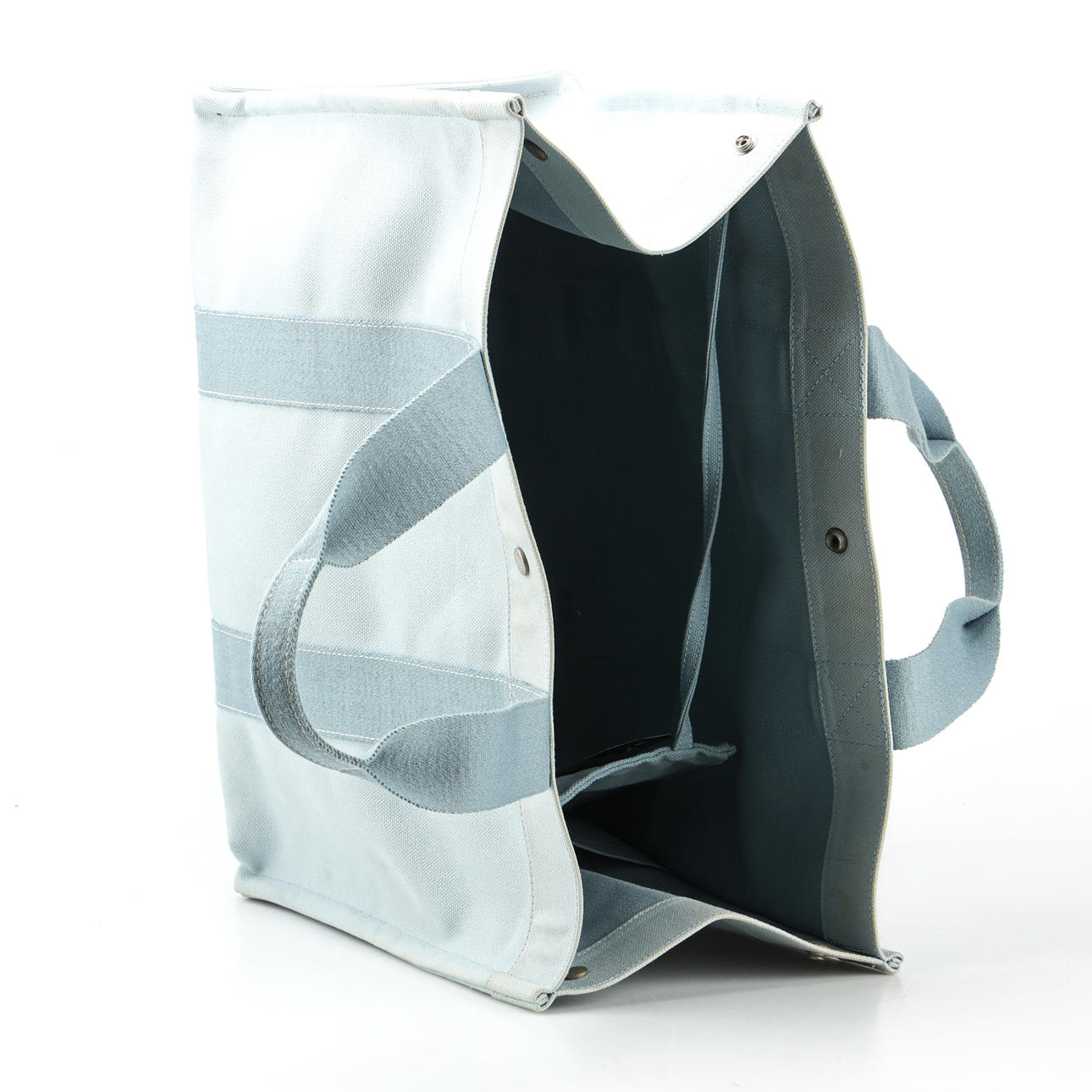 in light blue cotton canvas with woven straps, white metal snap buttons, interior with a pouch and two side compartments. Tagged HERMÈS PARIS. Approx. 47x36x24 cm.