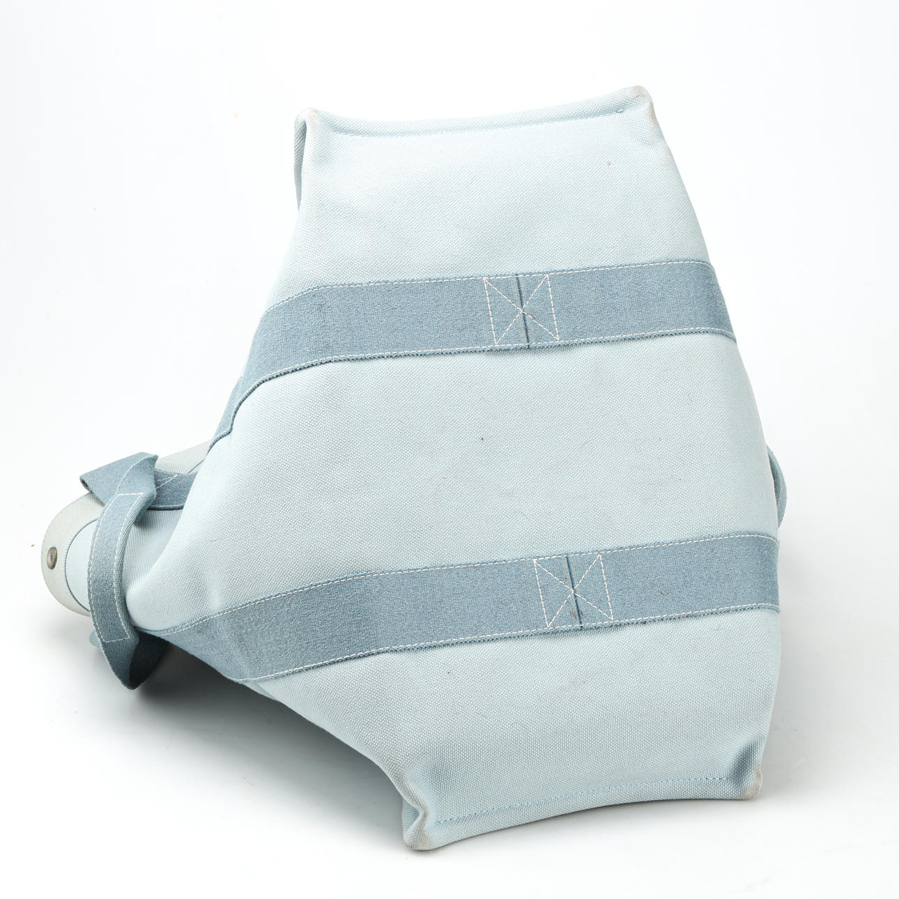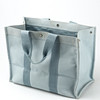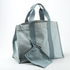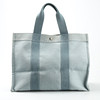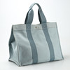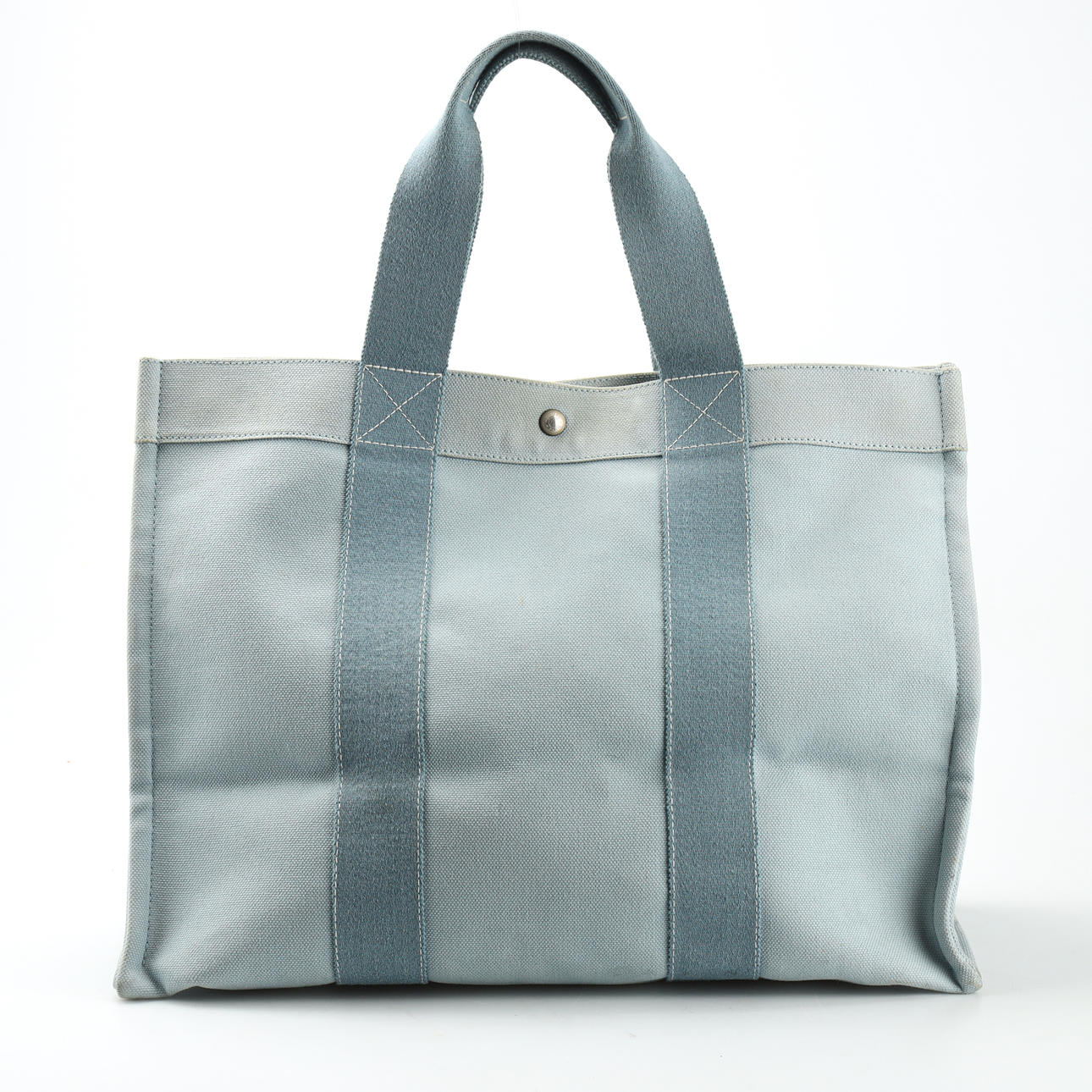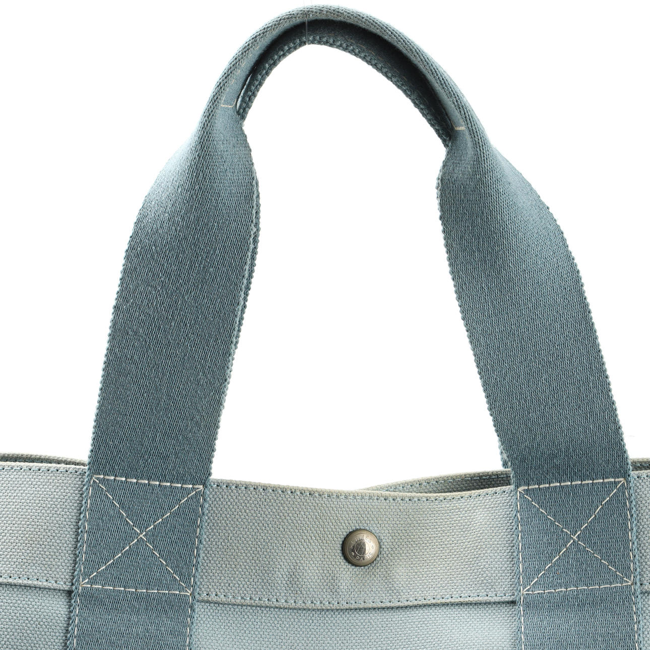 in light blue cotton canvas with woven straps, white metal snap buttons, interior with a pouch and two side compartments. Tagged HERMÈS PARIS. Approx. 47x36x24 cm.