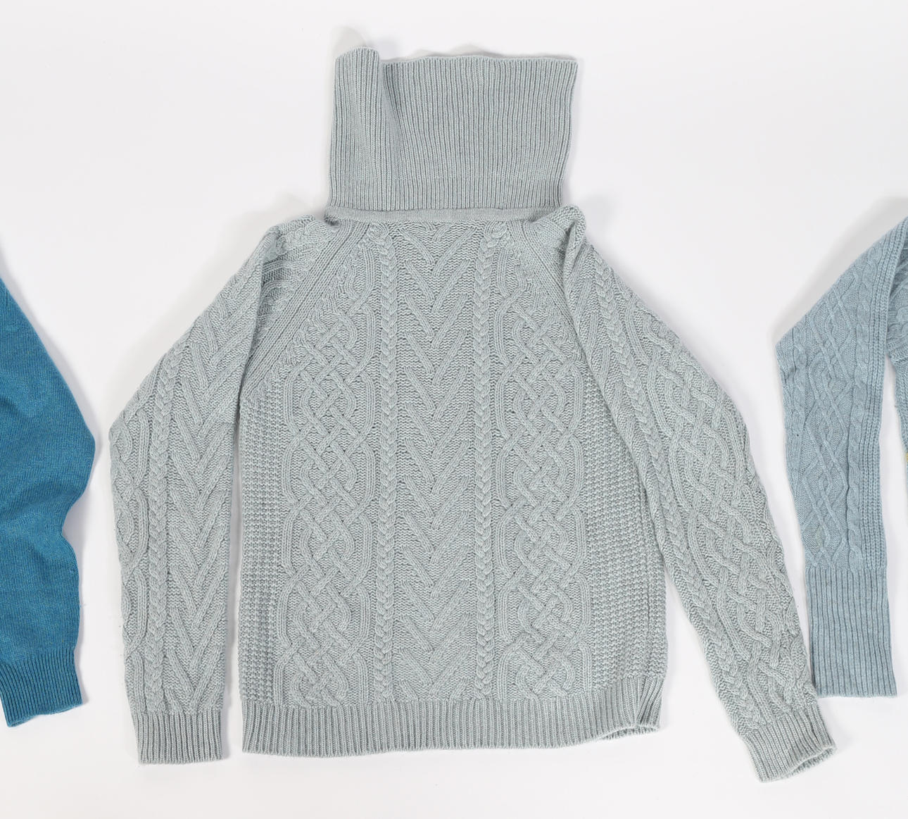 Turquoise sweater with cable knit yoke size UK 8, pale blue cable knit roll neck size 8-10 and fine knit crew neck size 10.