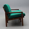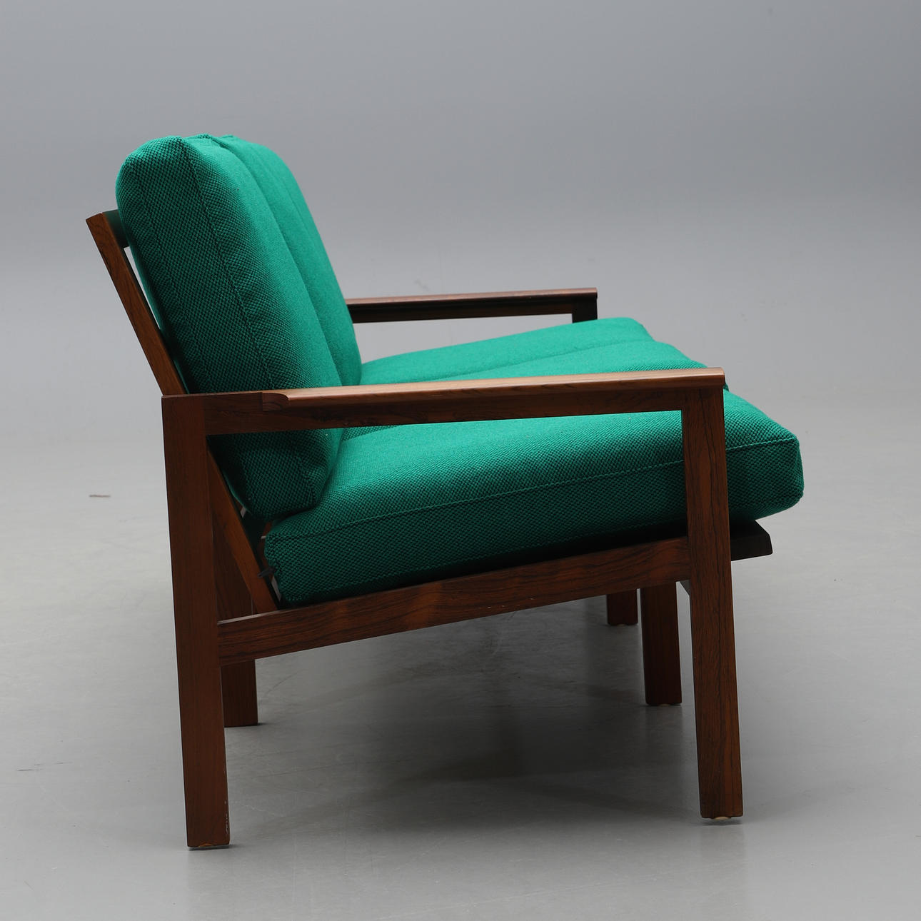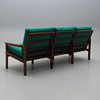 Frame in rosewood. Loose padded cushions upholstered in emerald green fabric. Length 190, seat height approx. 40 cm.