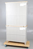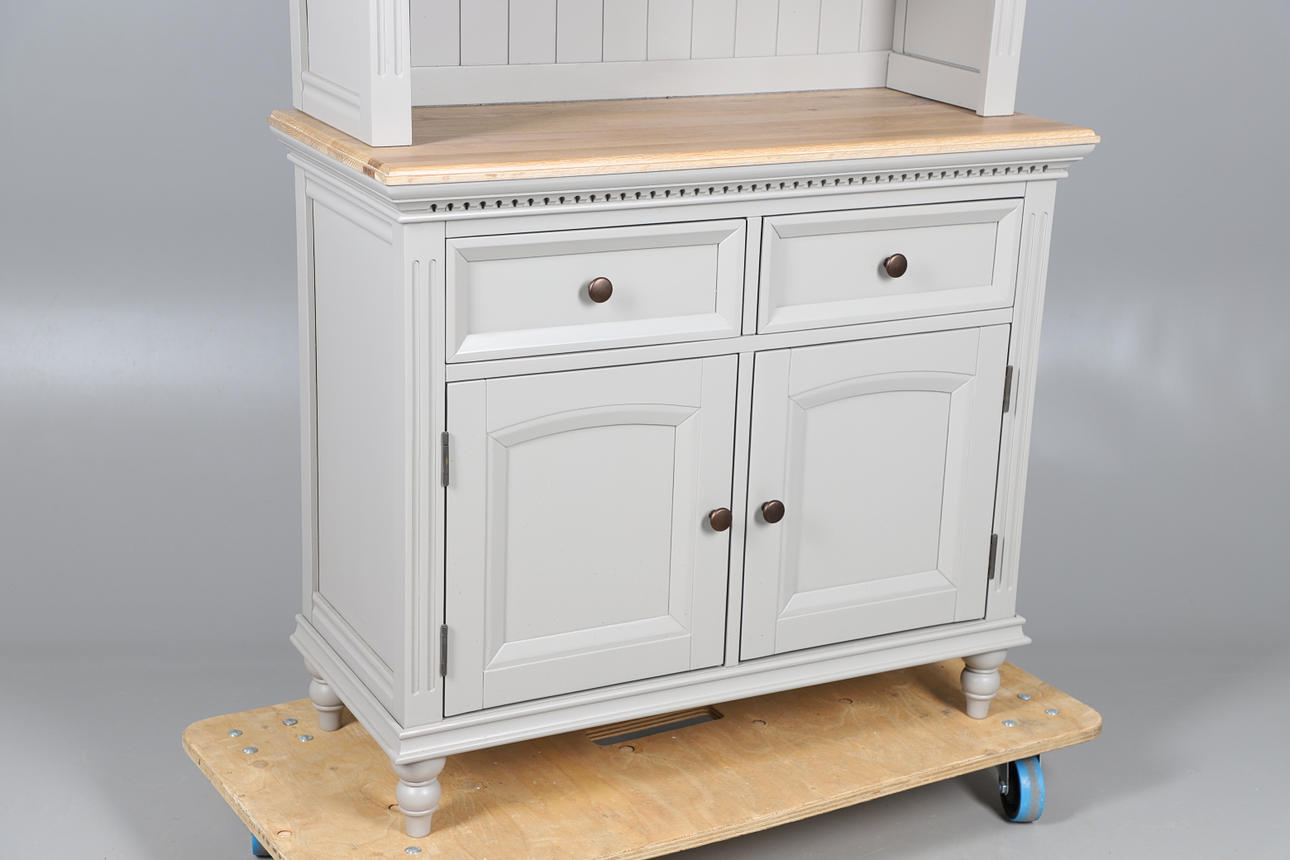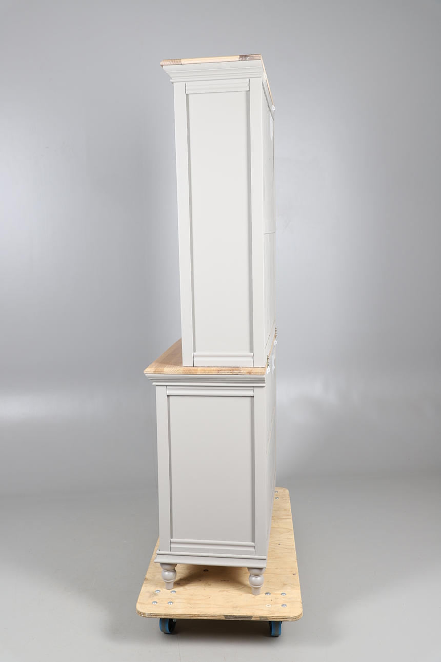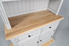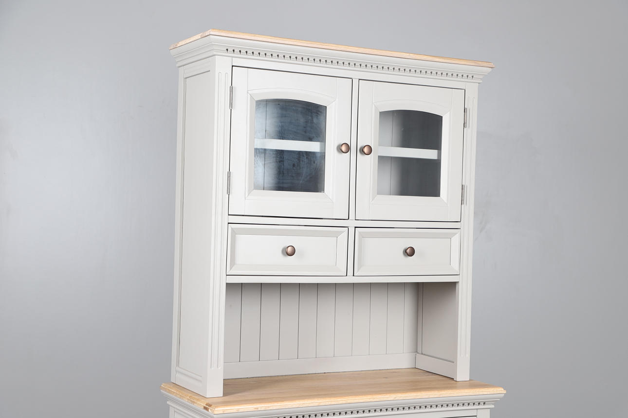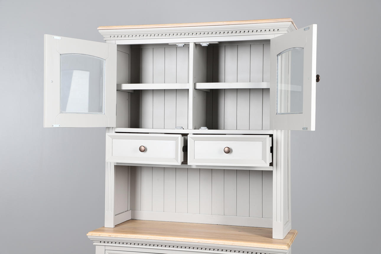 The top with double glazed door cupboard with single interior shelf above two short drawers, stood on the bottom unit with light oak surface, two short drawers over a double door cupboard with single interior shelf. Raised on small turned feet, metal knobs, fluted sides. Height 189.5cm x Length 99cm x Depth 43cm.