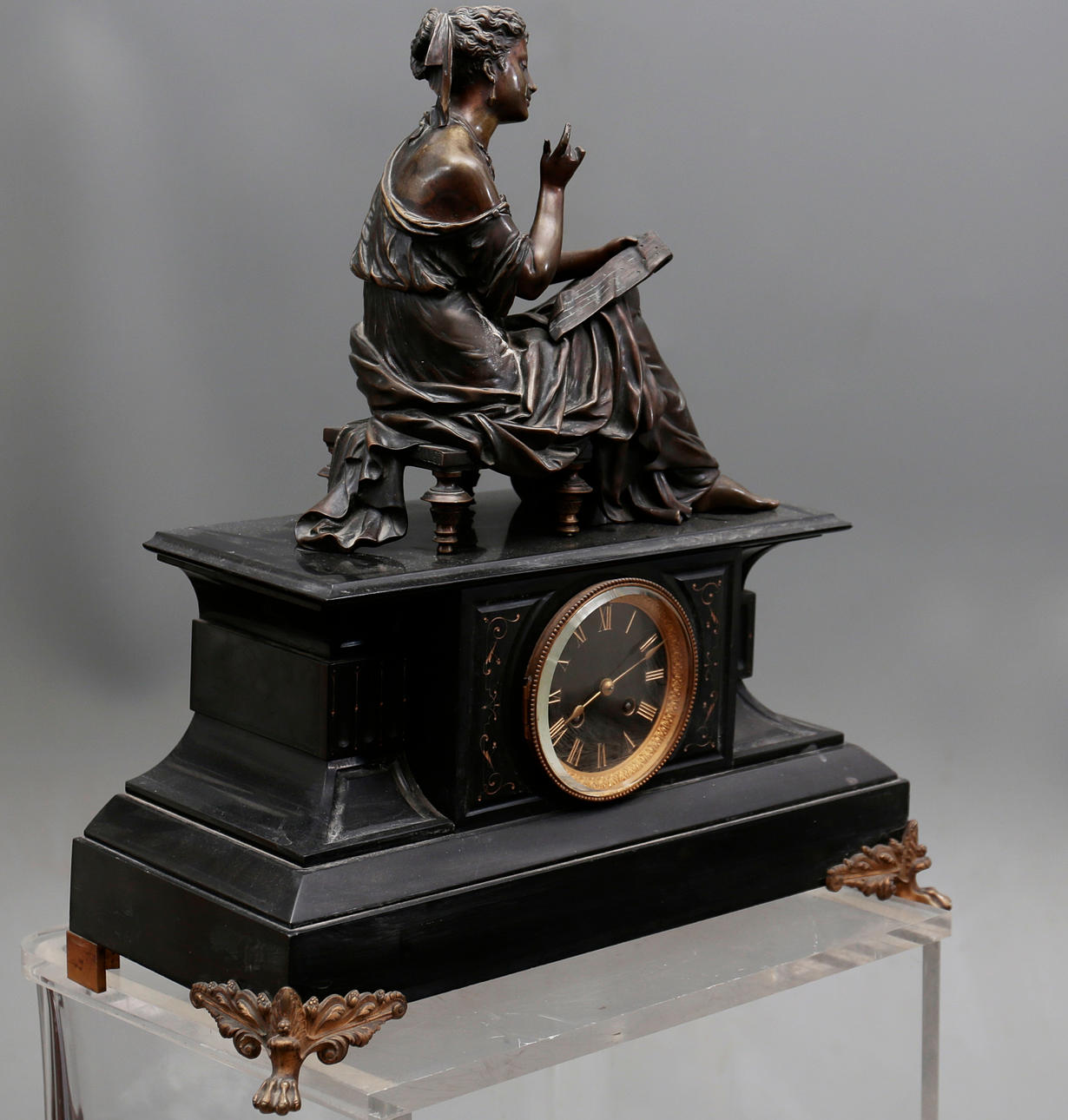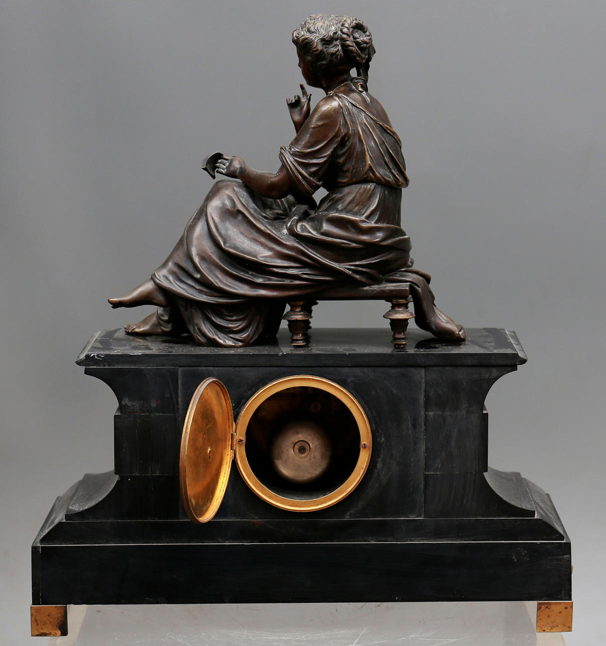 Bronze sculpture mounted on a black marble clock.