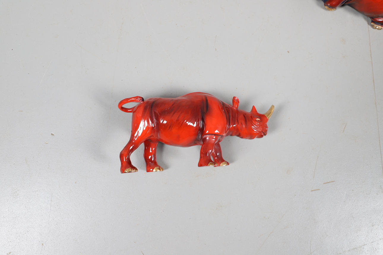 comprising of a red glaze hippopotamus, a white glaze hippopotamus, and a rhinoceros, painted marks to underside (3).