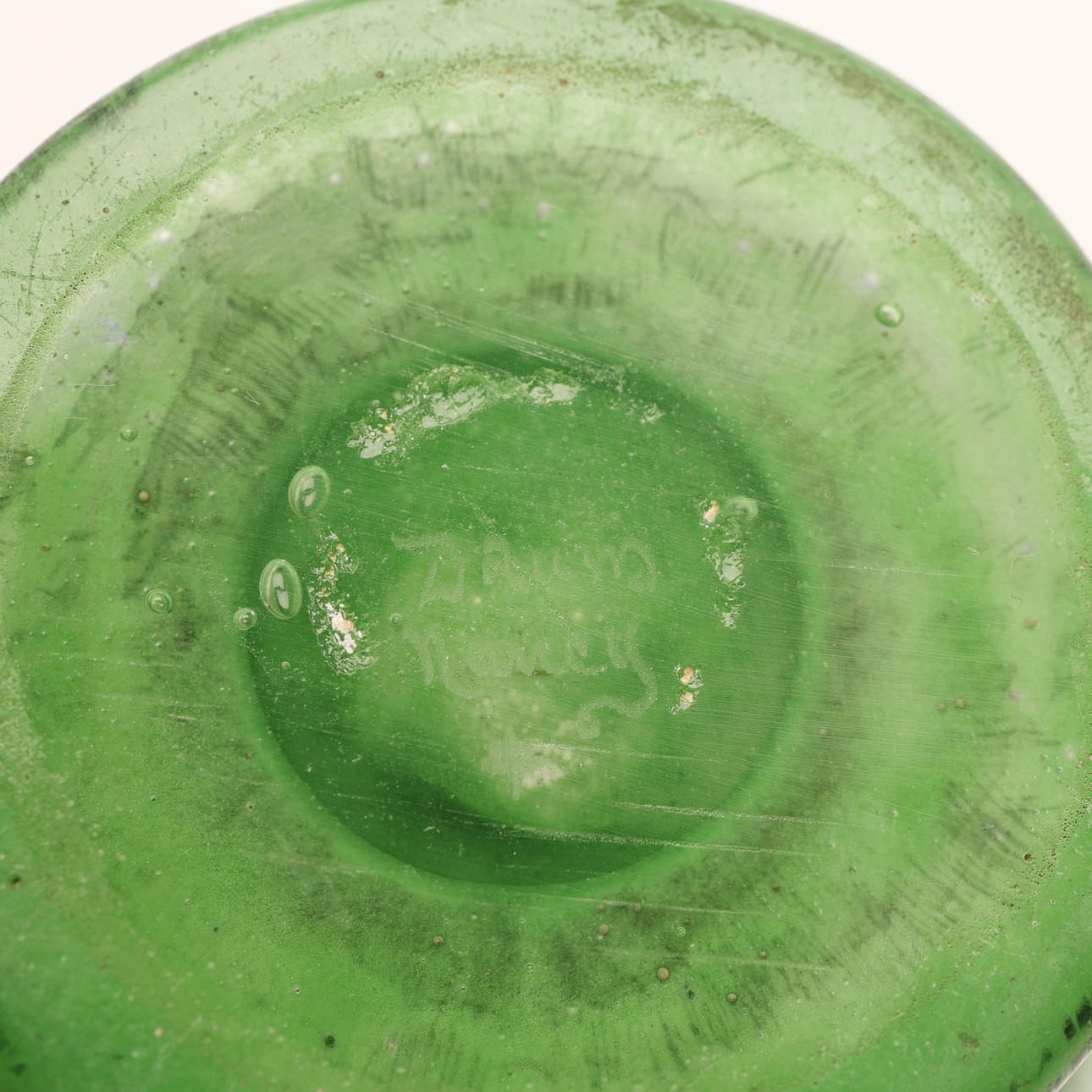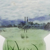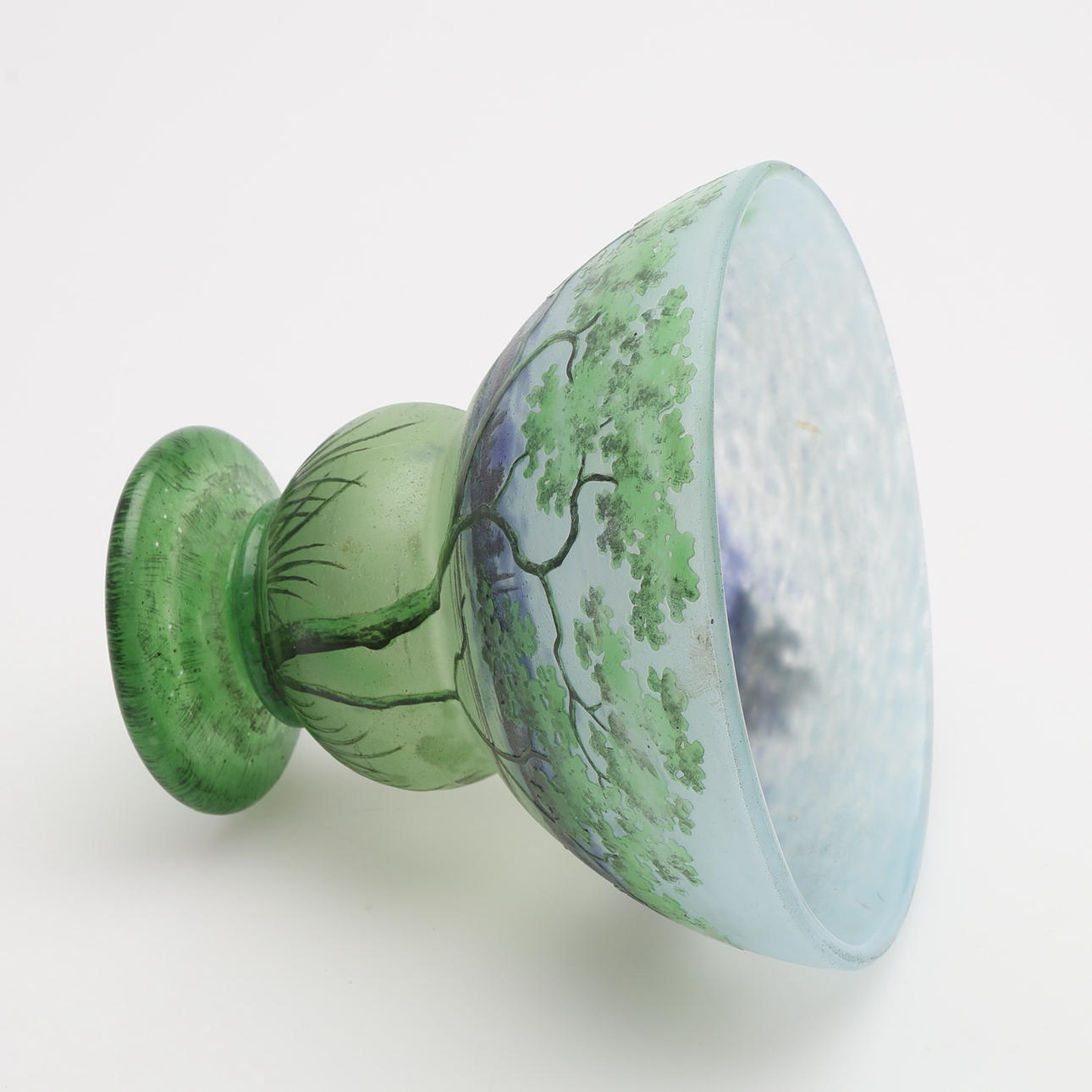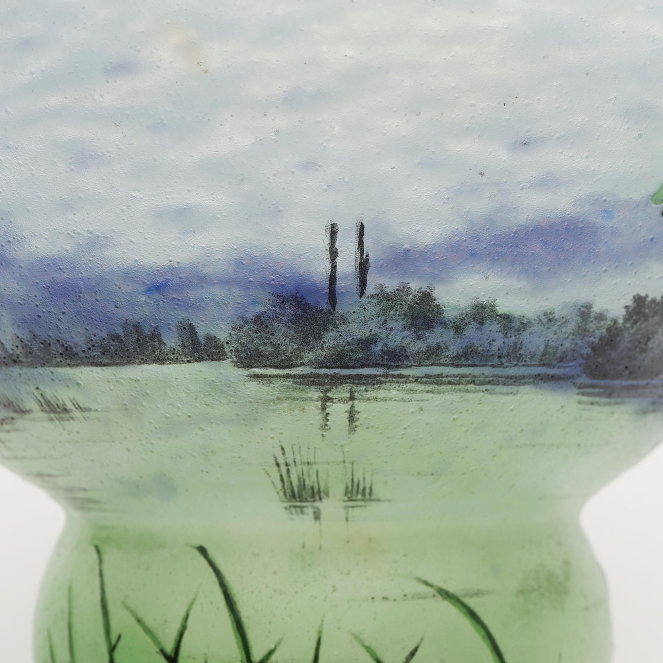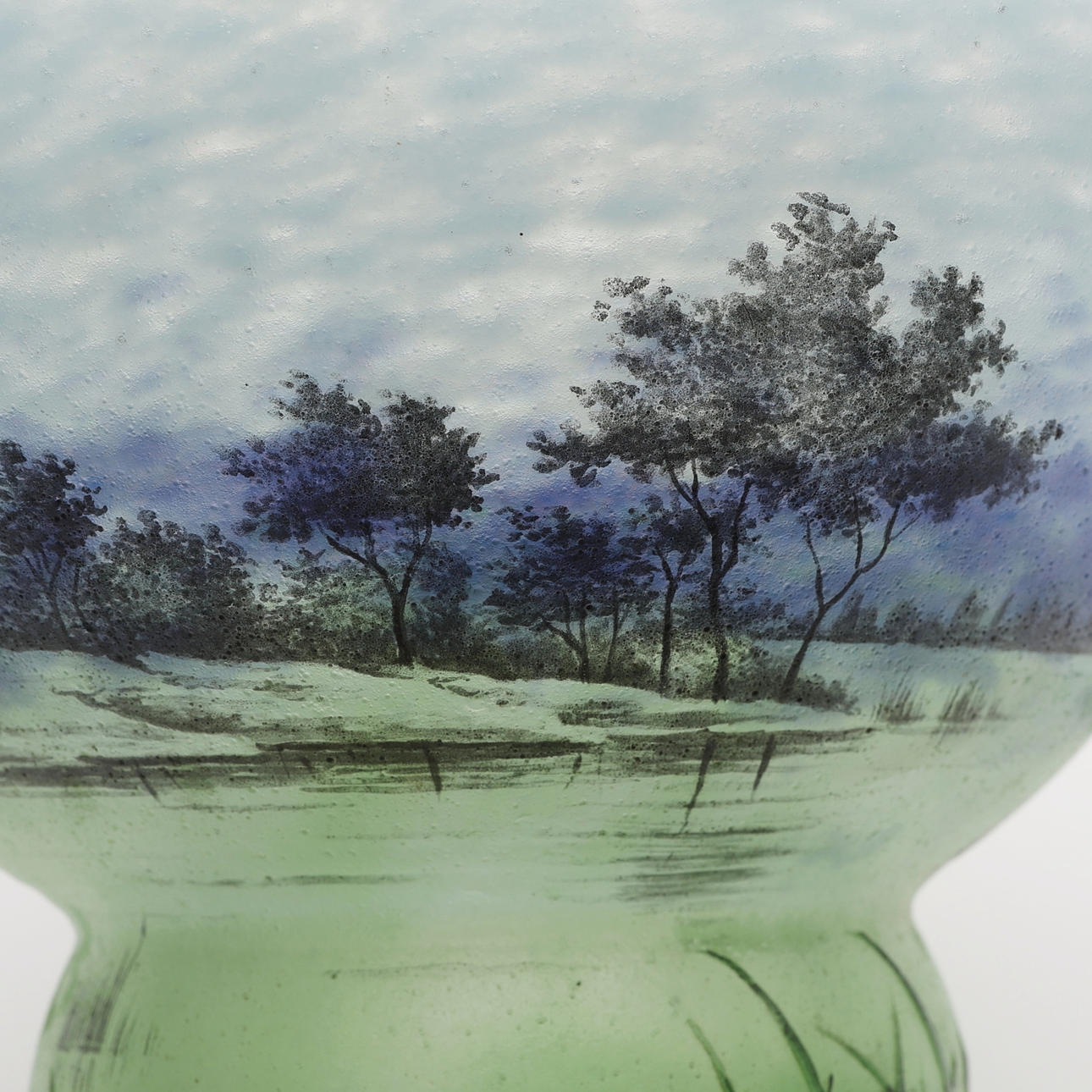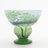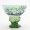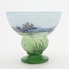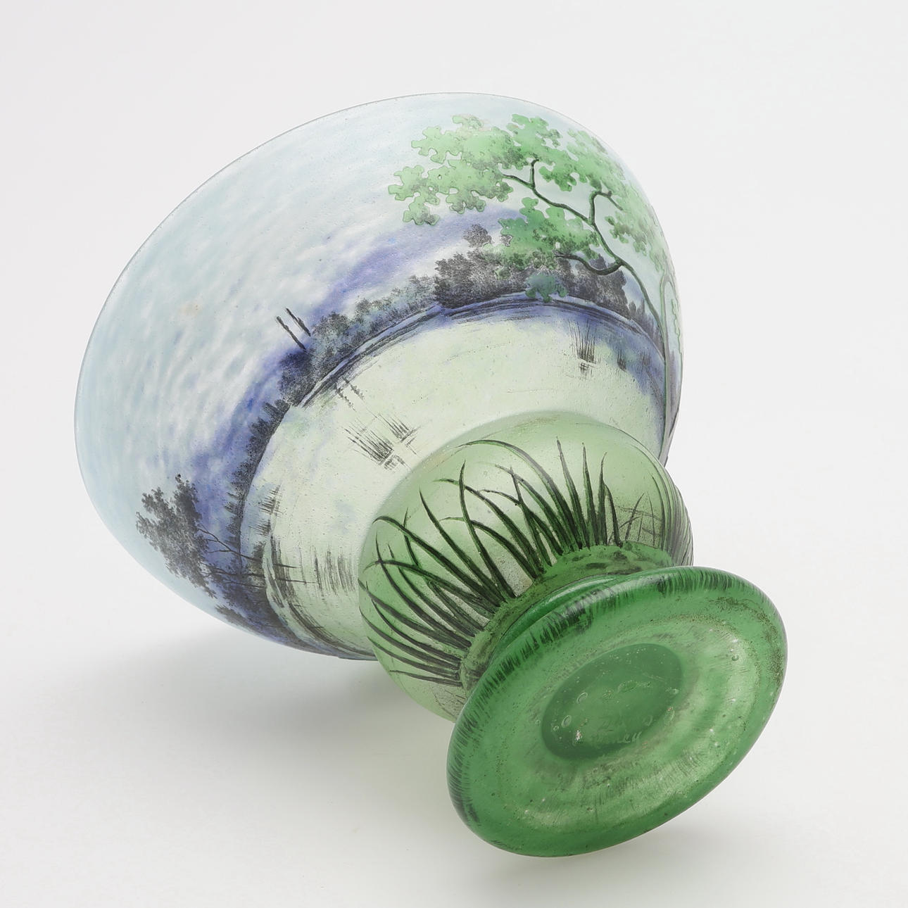 Art Nouveau, mottled glass in blue and green with overhangs and etched and enamel painted summer landscape, signed “DAUM Nancy” and with Lorraine's cross, France, first half of the 20th century, height 12, diameter 13,5 cm.