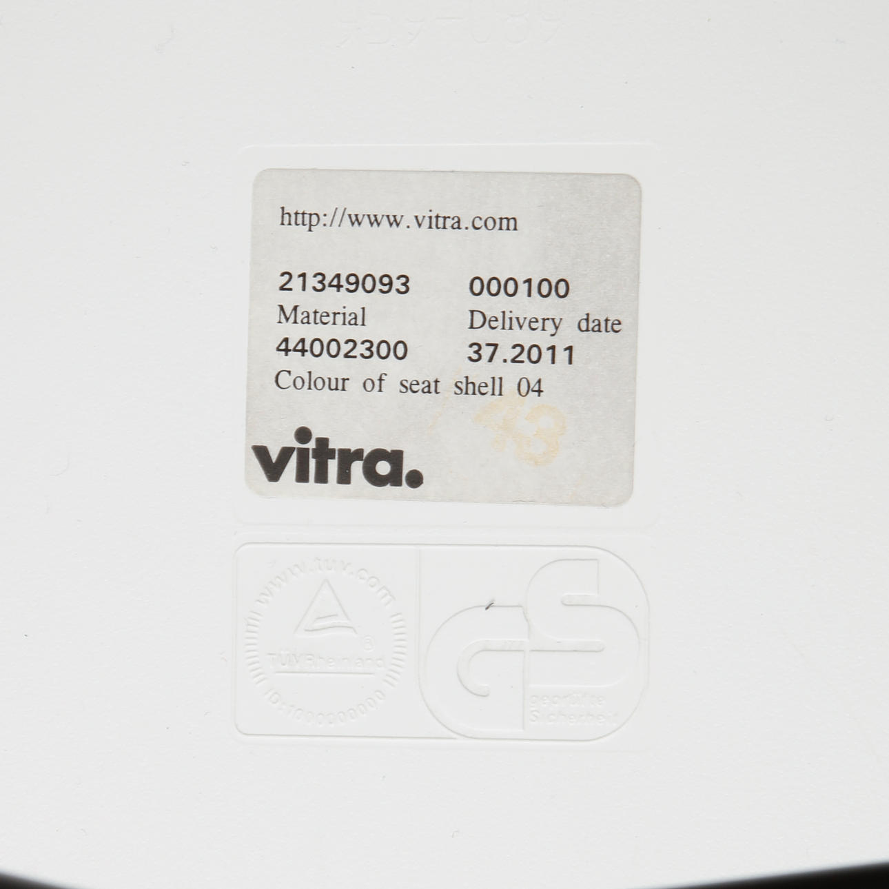 Leg position partly in ash. Seat in white molded plastic. Seat height 44 cm.